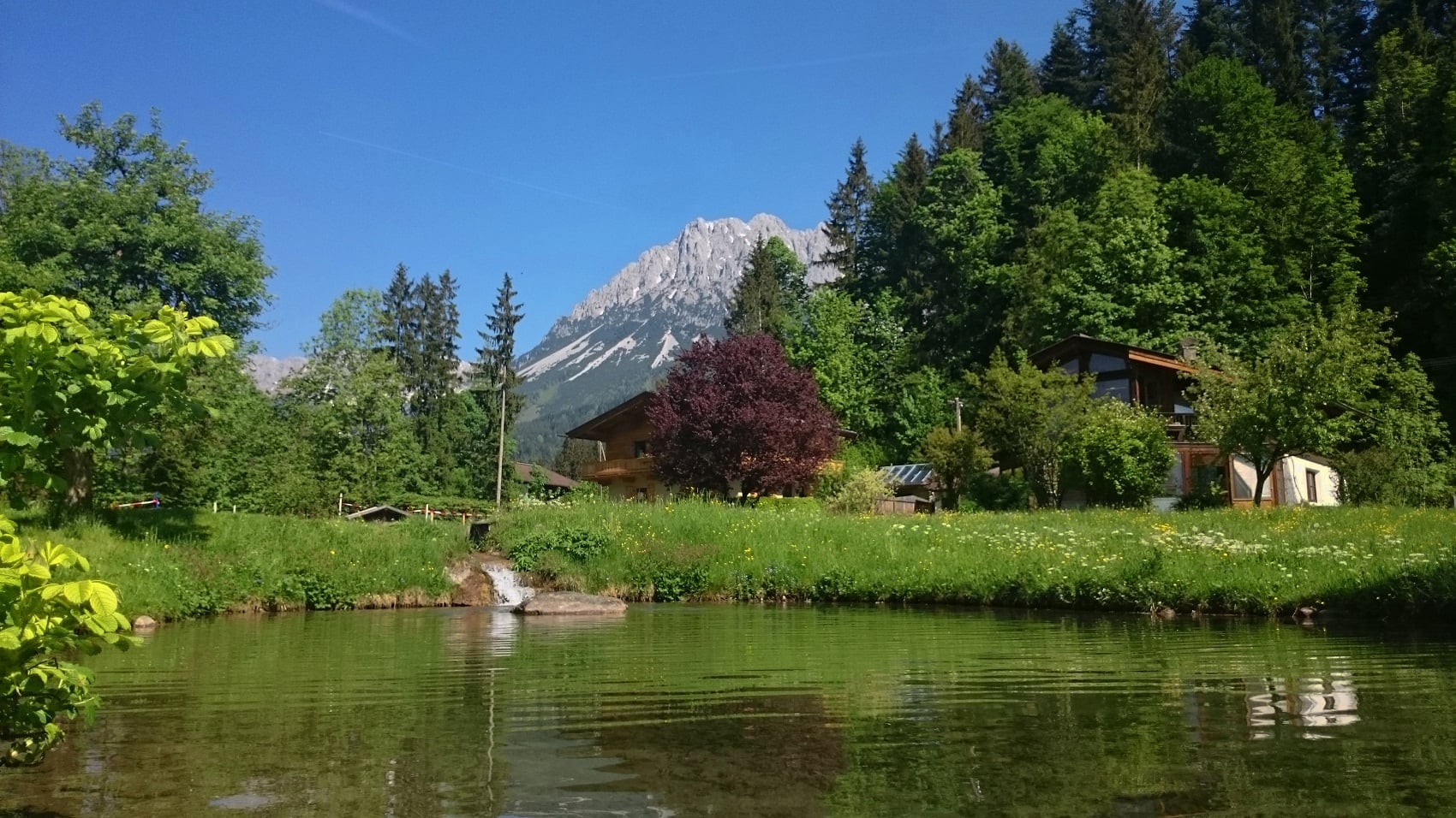 Ich befinde mich im ersten Stock. Ich bin hell und freundlich eingerichtet und von meinem Balkon aus sieht man Teile des Wilden Kaisers und auch unsere Fischteiche.