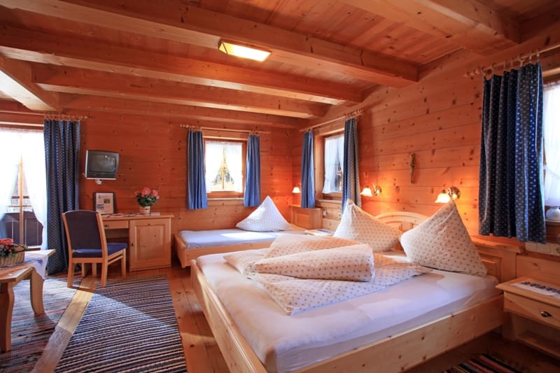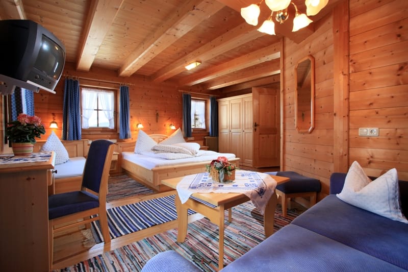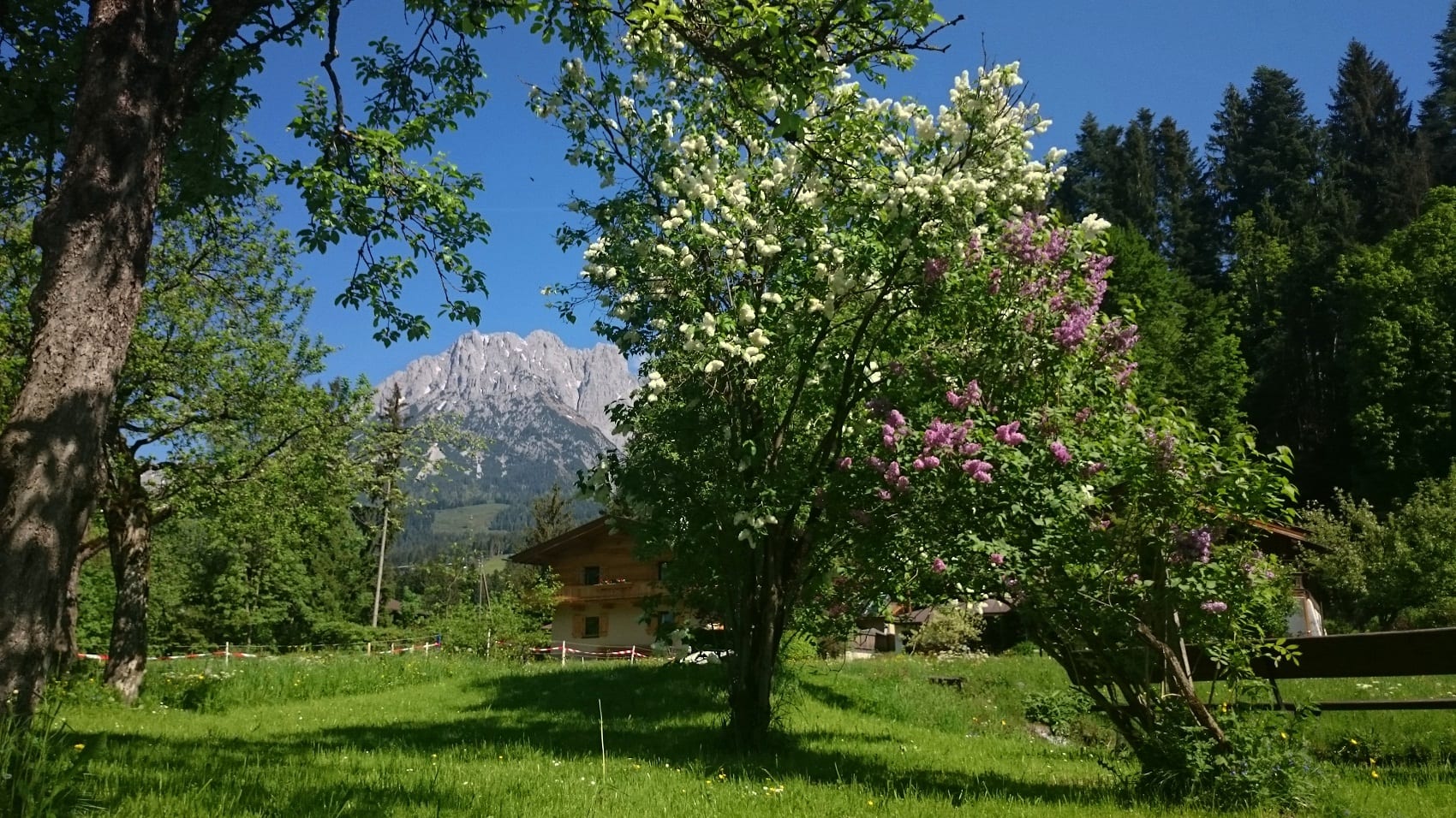 Ich befinde mich im ersten Stock und bin ein gemütliches Eckzimmer, ganz aus Holz mit Blick auf den Wilden Kaiser im Norden und das Kitzbühler Horn und die Leoganger Steinberge im Osten. Die Sonne kitzelt mich schon am Morgen, wenn Sie hinter den Bergen aufgeht.