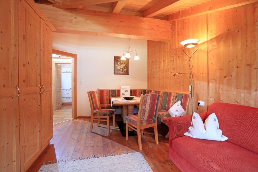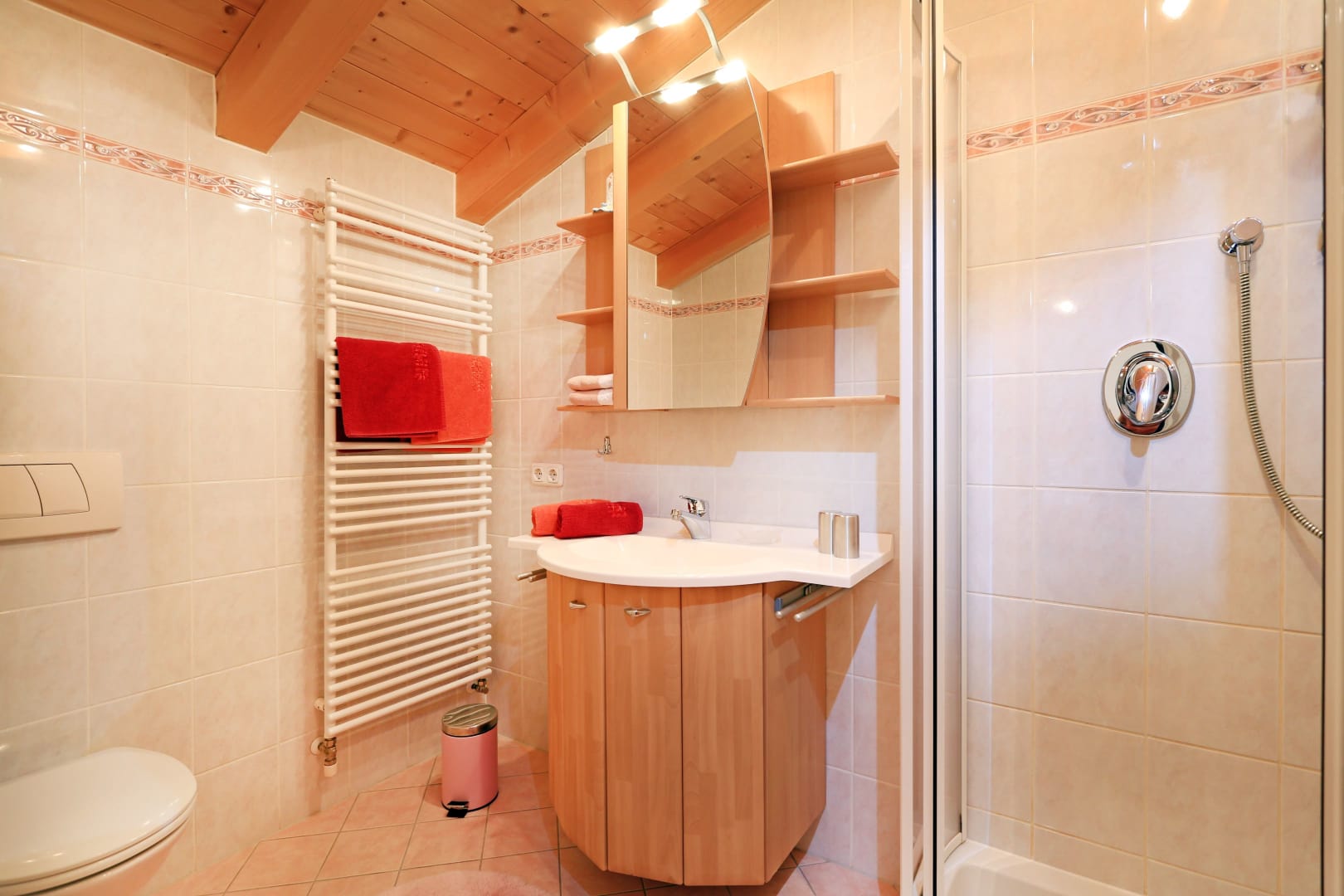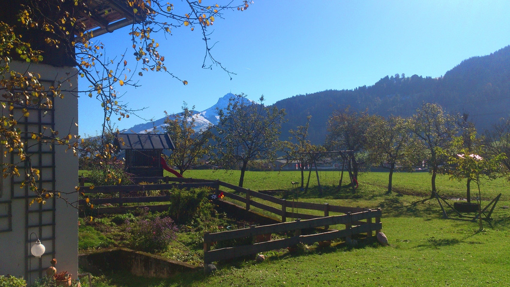 Ich befinde mich im 2. Stock und bin ein kleines Haus im Haus. Mit Stolz kann ich sagen, dass ich das Lieblingszimmer vieler Stammgäste und der Bäuerin bin. Vom eigenen, südseitigen Balkon aus sehe ich den Astberg und den Hartkaiser.