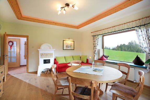 Großzügiges Wohnzimmer mit rundem Tisch für schöne Stunden, herrlicher Ausblick zum Kitzbüheler Horn und zum Astberg, Flat-TV, Kachelofen