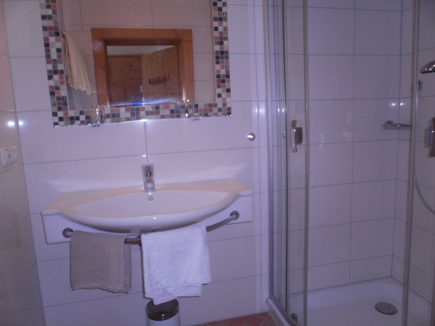 Praktische Küche mit Spülmaschine, Mikrowelle, helles Badezimmer mit einer Dusche für zwei und einem Doppelwaschbecken, WC