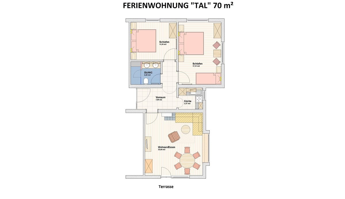 Unsere freundlich eingerichtete Wohnung hat 2 getrennte Schlafzimmer mit insgesamt fünf guten Betten, eigene Terrasse mit viel Platz an der Sonne,