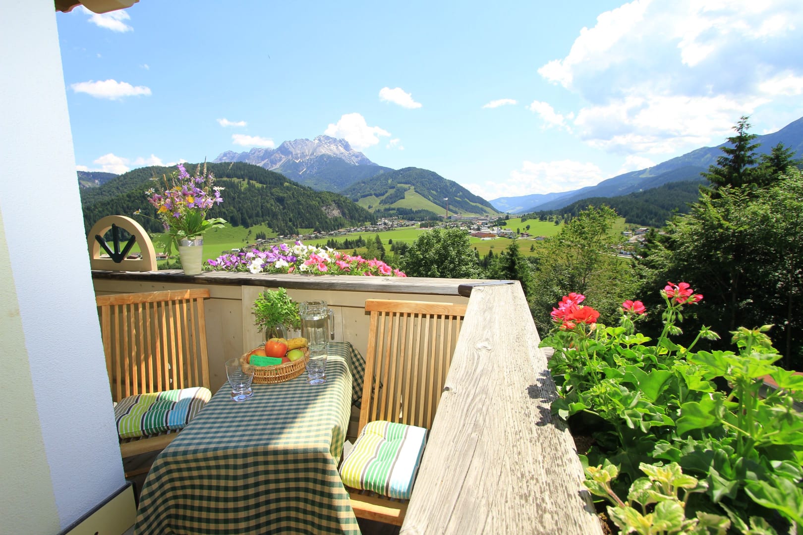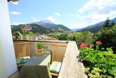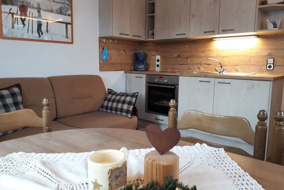 Es erwartet Sie eine sonnige, helle 2 Zimmerwohnung. Sie ist ost- und südseitig gelegen mit großem umlaufenden Balkon mit einzigartigem Bergpanoramablick. Die freundliche Wohnküche ist ausgestattet mit einer Küchenzeile mit Backofen, Mikrowelle etc. und großem Holztisch mit Eckbank sowie einer gemütlichen Ausziehcouch zum Fernsehen und Lesen (FLAT-SAT-TV, CD-Player). Im Schlafzimmer befinden sich ein Doppelbett und ein Einzelausziehbett bzw. bei Bedarf auch ein Gitterbett und DU/WC.