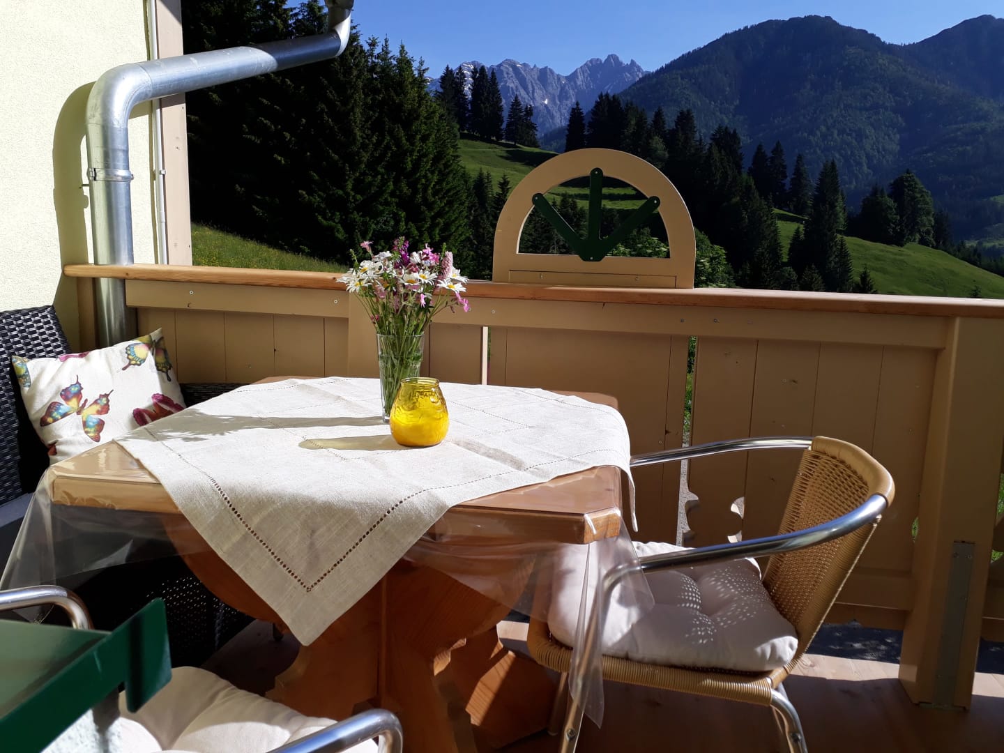 Lassen Sie sich verwöhnen von unserem Brötchenservice bzw. Frühstückskorb. Genießen Sie den herrlichen Bergpanoramablick und die Idylle am Berg. Es erwarten sie liebevoll eingerichtete Wohnungen im jugendlichen Landhausstil - erleben Sie die absolute Ruhe in unseren schönen, neuen Wohnungen blicken Sie vom Wintergarten aus auf Berge, Wald und Felder während Sie sich an den wohlig-warmen Kachelofen lehnen.