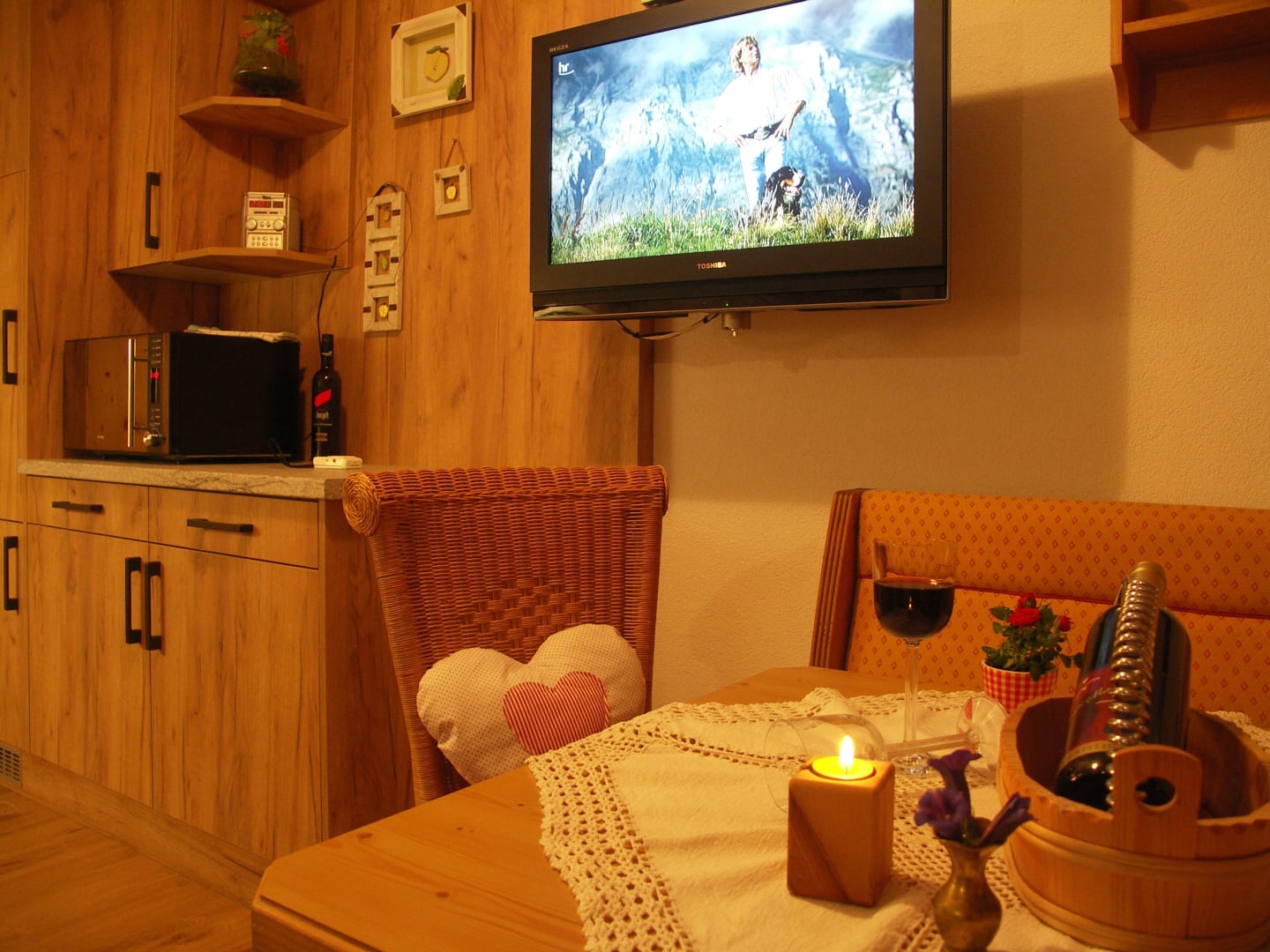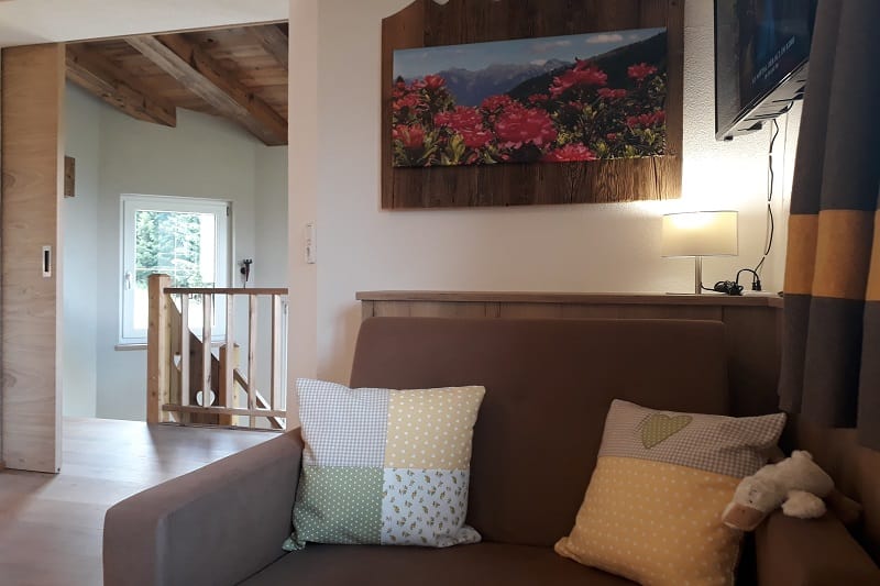 Dies ist eine 2-Zimmerwohnung mit einer gemütlichen Wohnküche, schönen Essecke mit Eckbank und Flachbildschirm SAT-TV sowie CD-Player, DU/WC und das Schlafzimmer ist liebevoll eingerichtet aus herrlich duftendem Zirbenholz mit einem Doppelbett und Einzelbett (ideal für Kinder). Und mit großem Balkon, ausgestattet mit Holztischgruppe und Liege.
