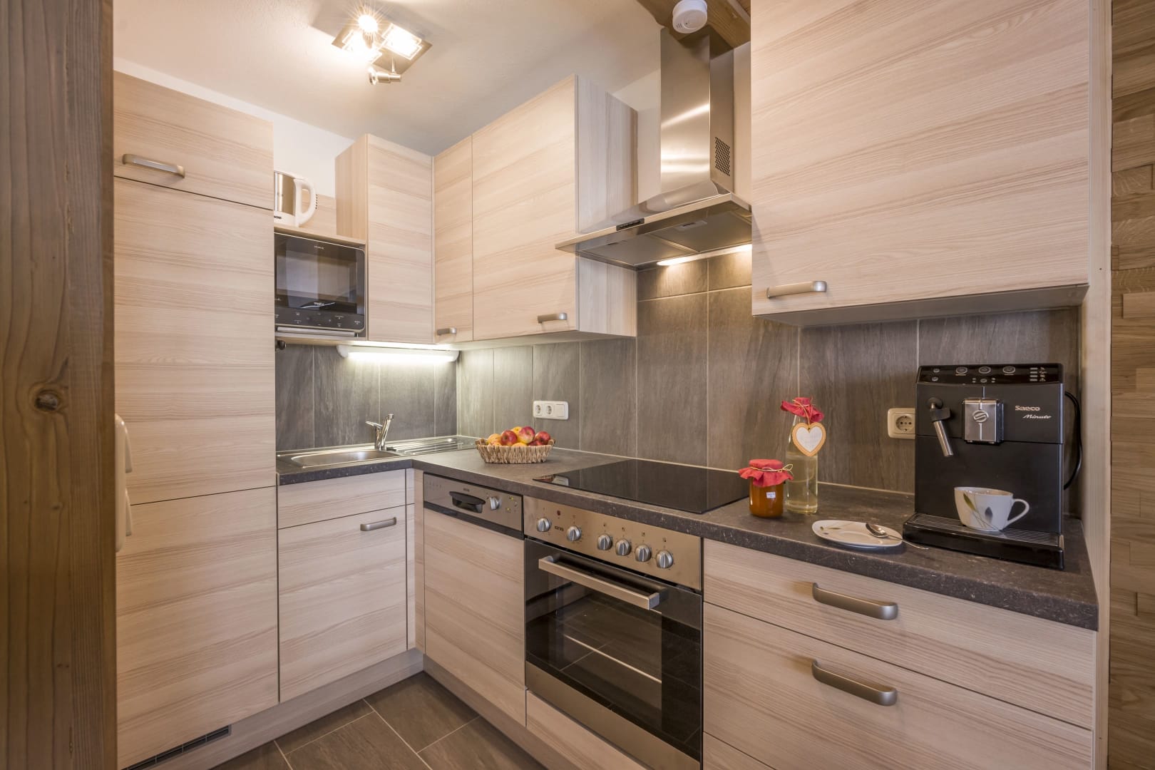 Die voll ausgestattete Küche verfügt über eine Espressomaschine und eine Filterkaffeemaschine und sogrt so für den Besten Kaffee am Morgen.