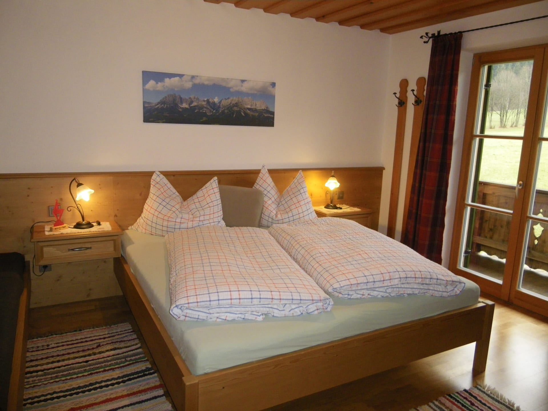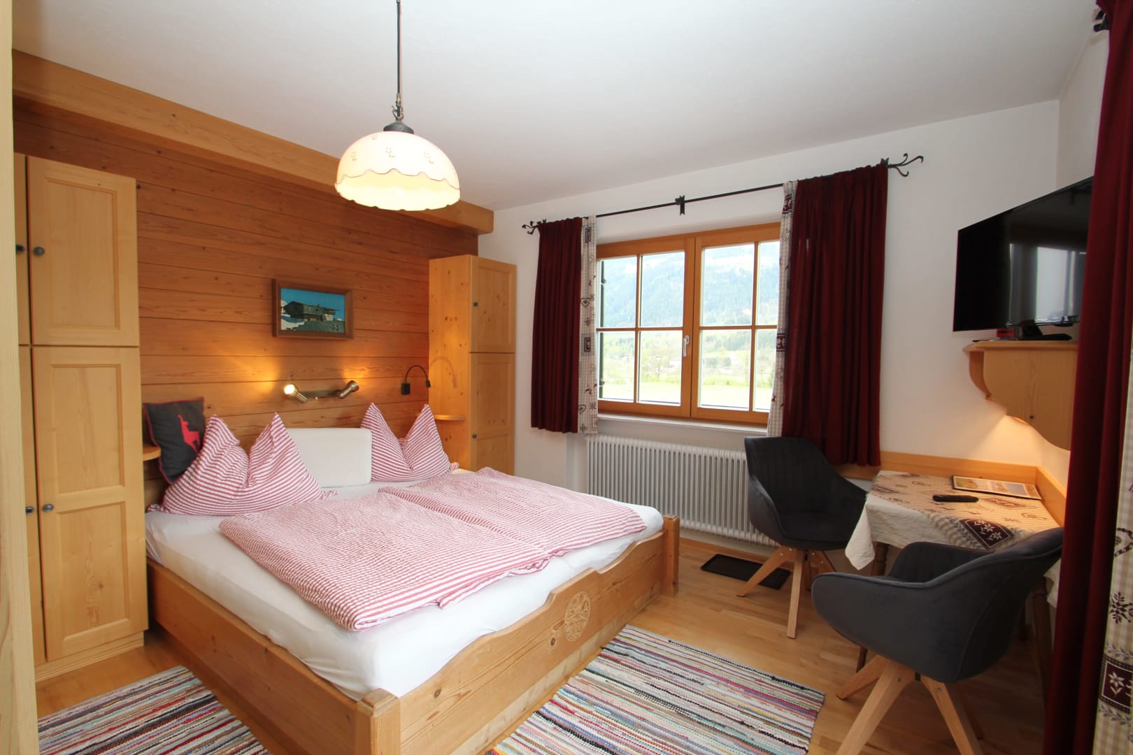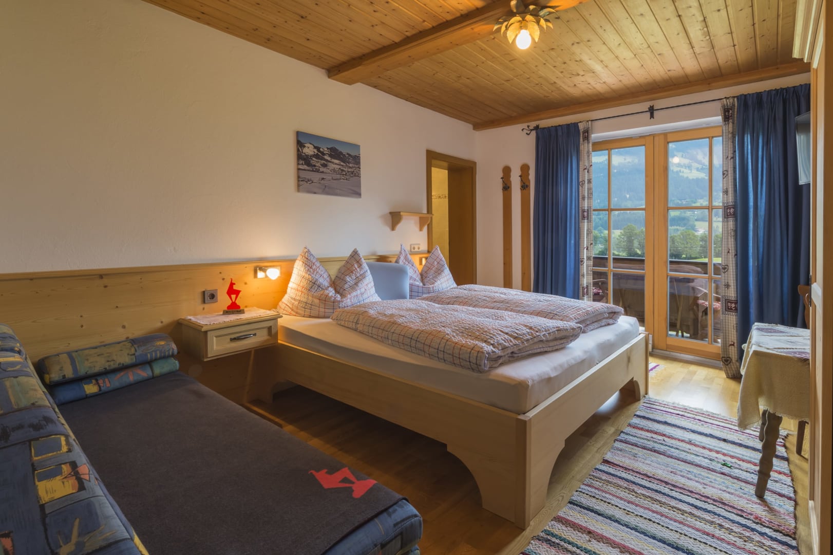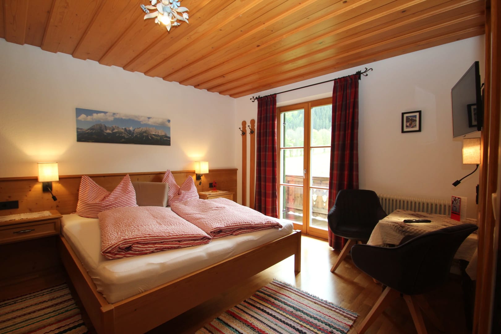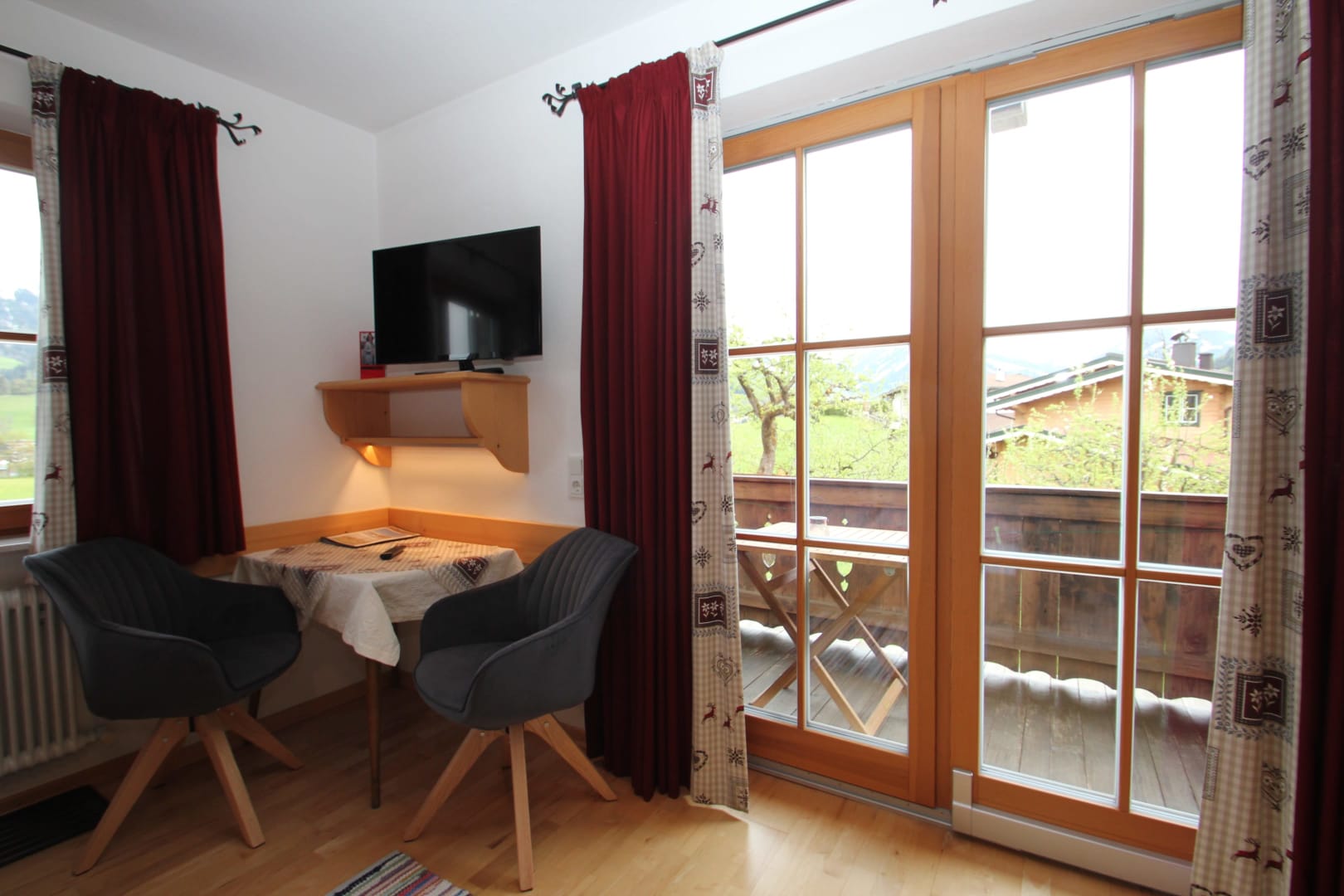 Gemütliches Doppelzimmer (auf Anfrage auch für drei Personen möglich) mit Blick zum Kitzbühler-Horn oder Hahnenkamm. Alle Zimmer mit TV, DU/WC und Balkon. Auf Anfrage auch 3 Personen möglich.