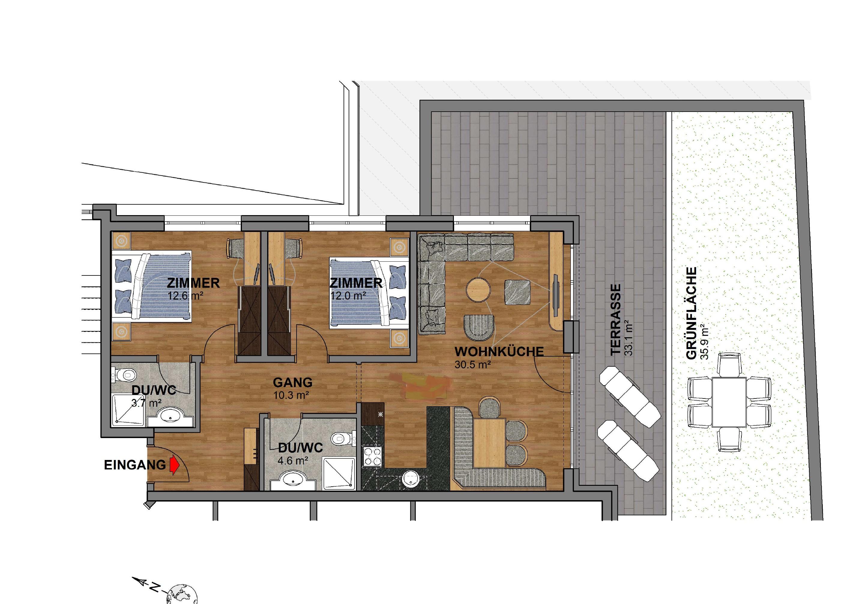 Top 2 mit ca. 73 m²: 1 voll ausgestattete Wohnküche mit Cerankochfeld, Backrohr, Mikrowelle, Geschirrspül- und Kaffeemaschine, gemütlicher Essecke, Kabel TV, großer Wohnbereich mit ausziehbarer Sofalandschaft; 2 Schlafzimmer mit Doppelbett und großen Kleiderschrank, 2 Badezimmer mit Dusche und WC. Terrasse.