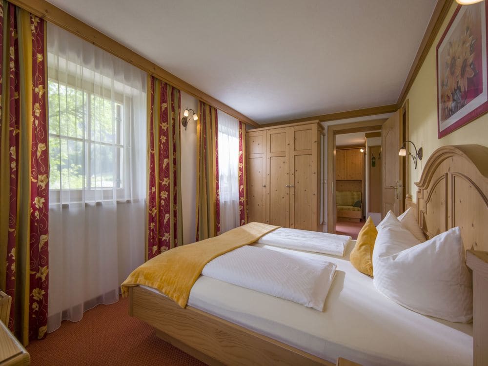Komfortables und sehr ruhiges Einzelzimmer im Landhausstil mit unverbautem Ausblick auf die Wiesen der eigenen biologischen Landwirtschaft und Südbalkon. Das Haus Margreth ist 40m vom Haupthaus entfernt.