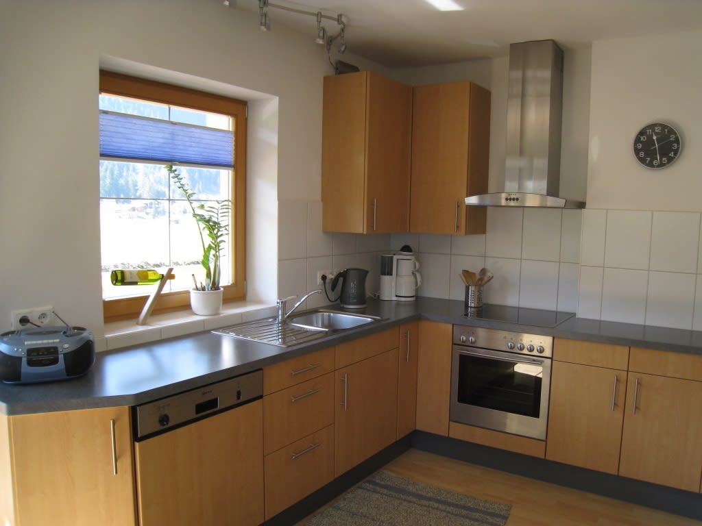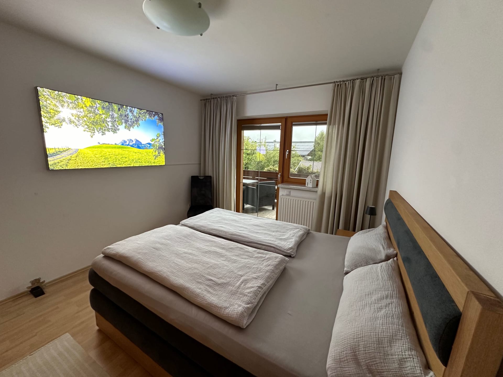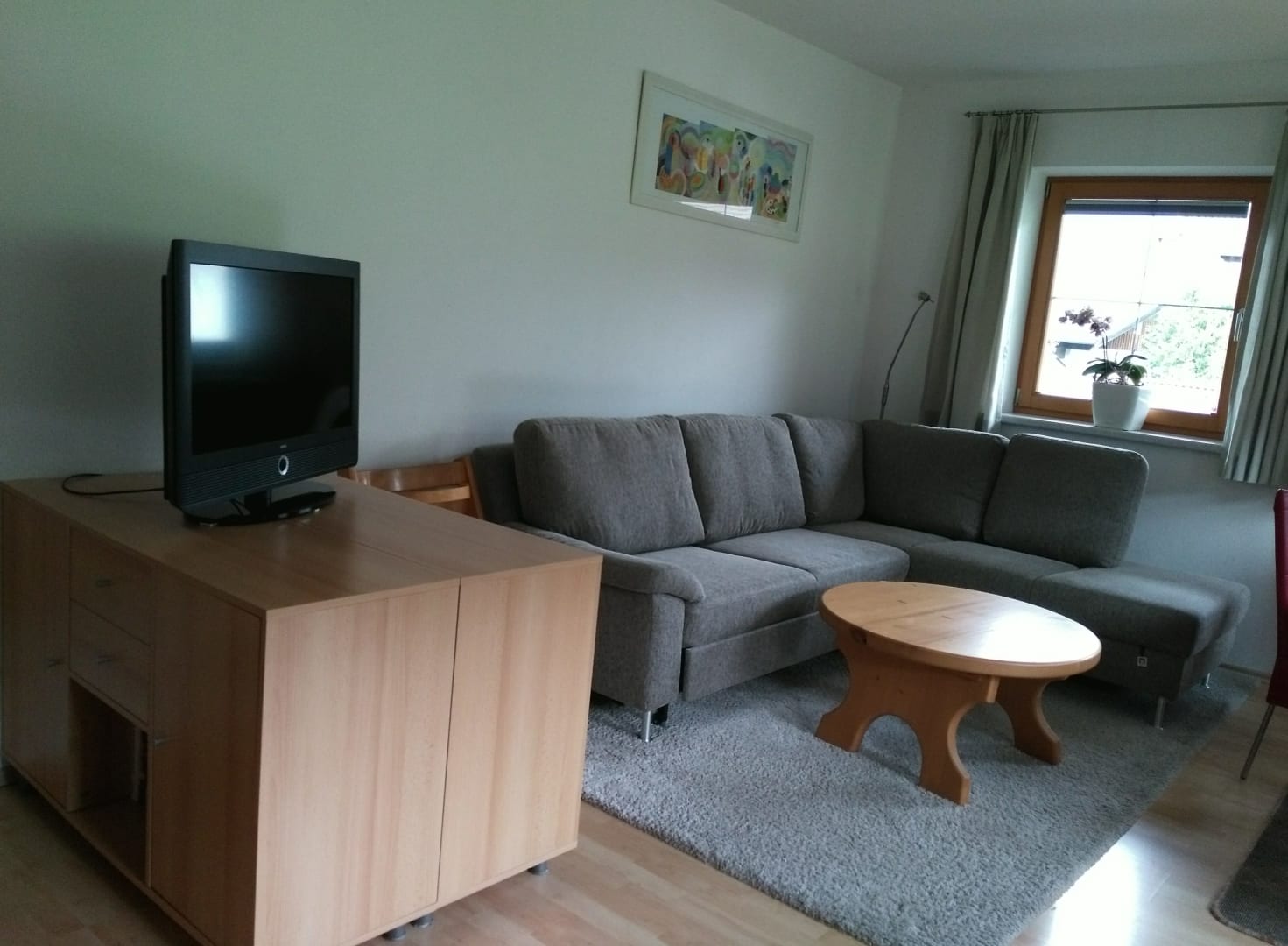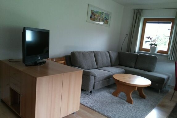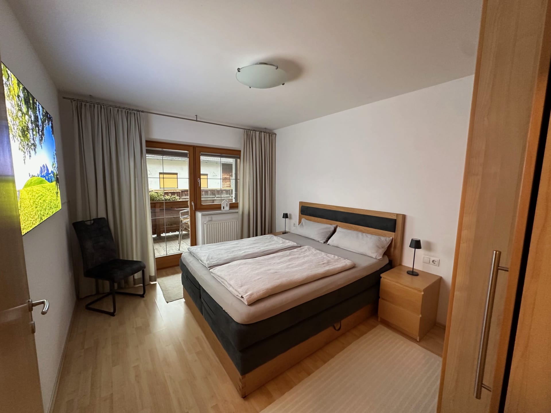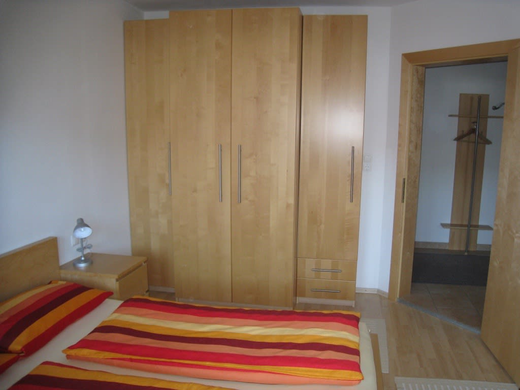 Großes Wohn/Schlafzimmer mit Sitzgarnitur (Schlafmöglichkeit für 2 Personen), SAT-TV, Radio, W-LAN, Essecke, eingebaute, offene Küche mit E-Herd- Ceranfeld, Backrohr, Spülmaschine, Mikrowelle, Kühlschrank mit Gefrierfach, Kaffeemaschine, Wasserkocher und Ausgang zum Balkon mit Gartenmöbeln und Blick auf´s Grüne und die Berge. Schlafzimmer mit großen Kleiderschrank und ebenso Ausgang zum Balkon.