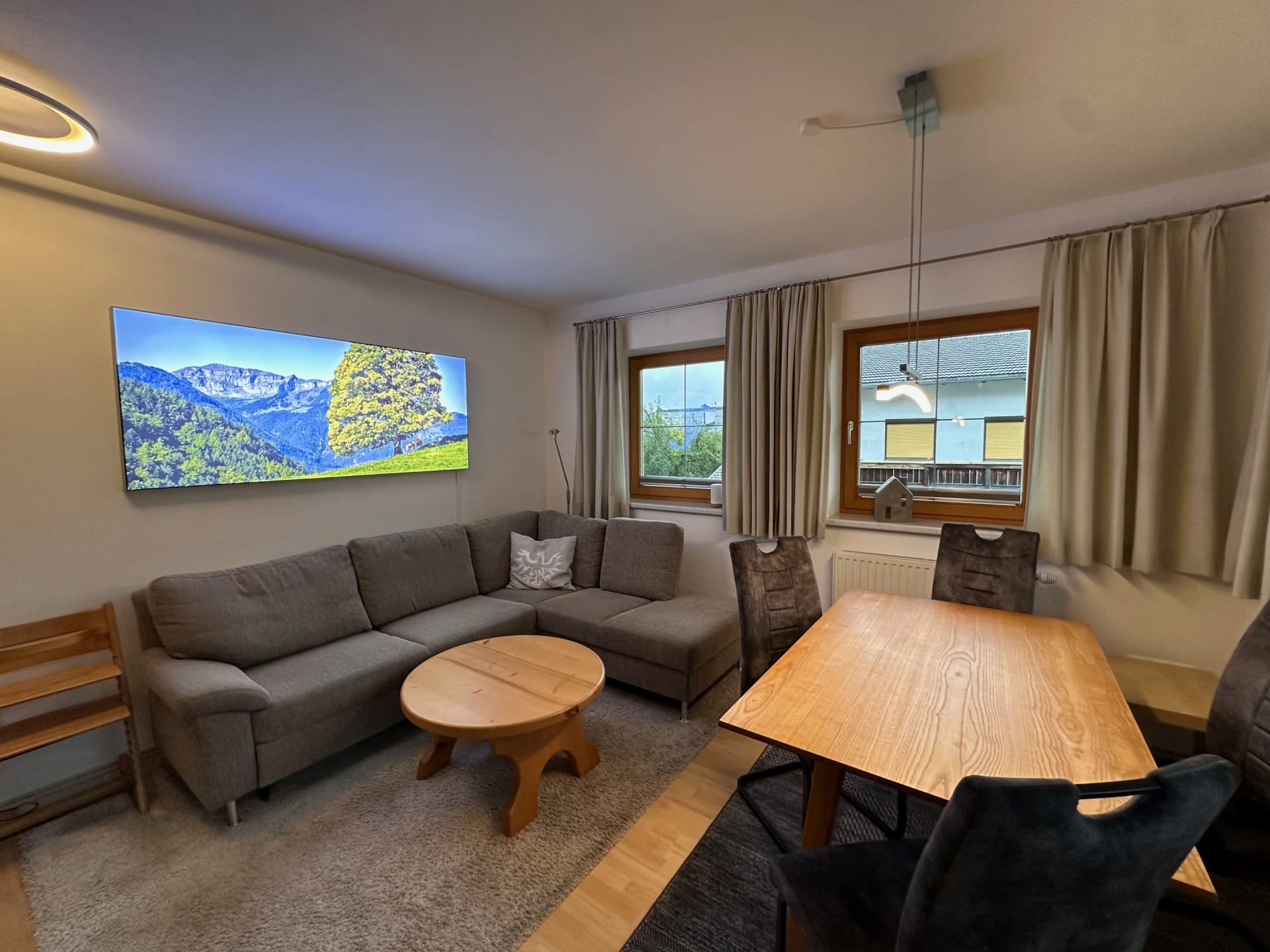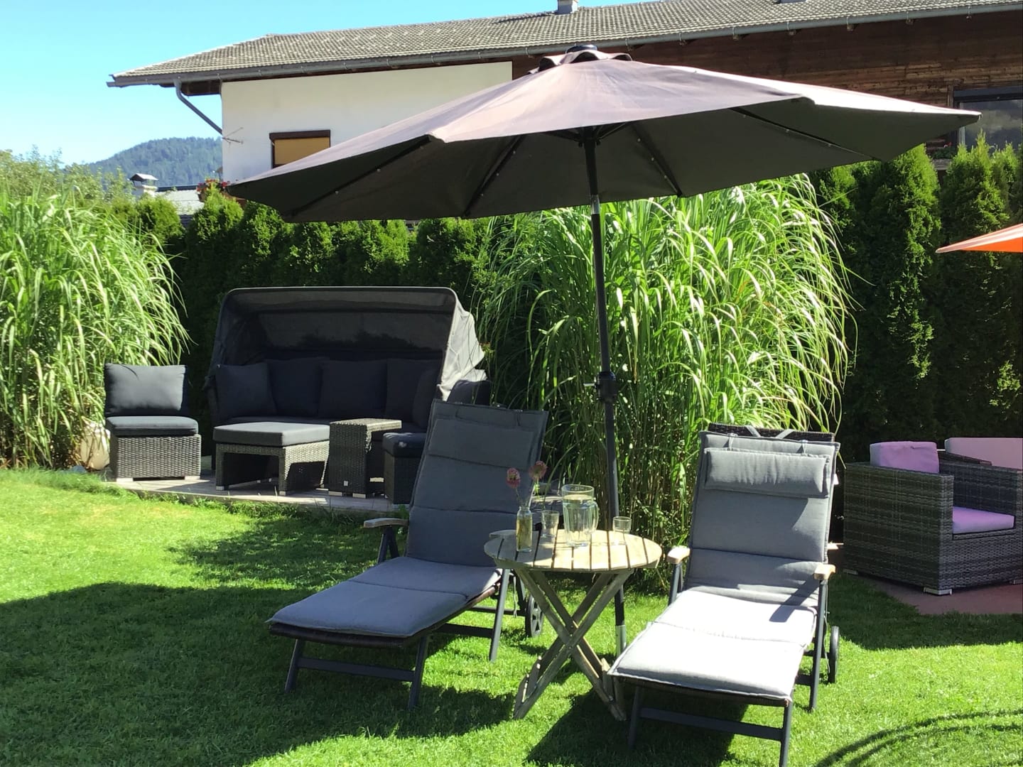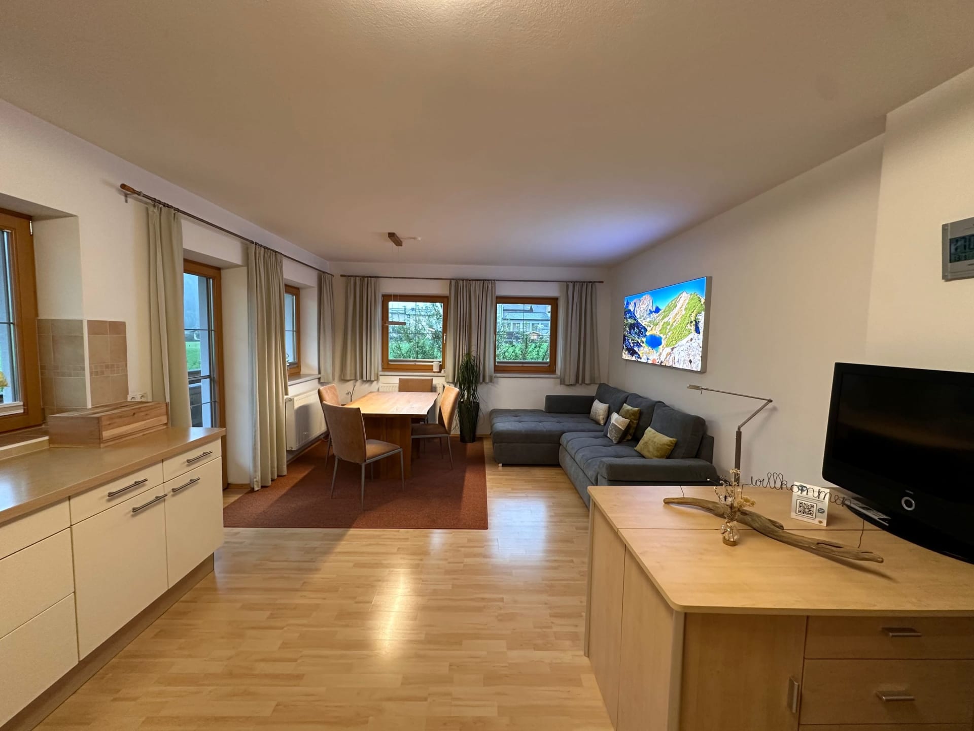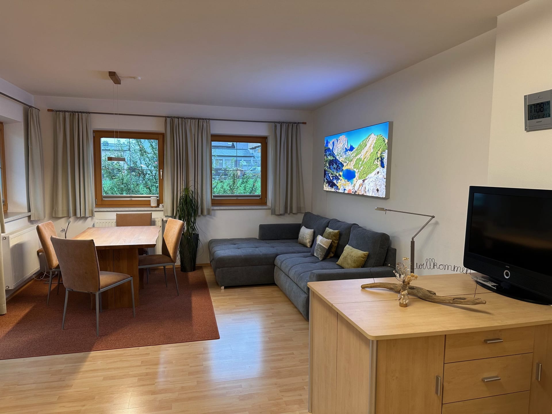 Großes Wohn/Schlafzimmer mit Sitzgarnitur (Schlafmöglichkeit für 2 Personen), SAT-TV, Radio, W-LAN, Essecke, eingebaute, offene Küche mit E-Herd- Ceranfeld, Backrohr, Spülmaschine, Mikrowelle, Kühlschrank mit Gefrierfach, Kaffeemaschine, Wasserkocher und Ausgang zum Balkon mit Gartenmöbeln und Blick auf´s Grüne und die Berge. Schlafzimmer mit großen Kleiderschrank und ebenso Ausgang zum Balkon.