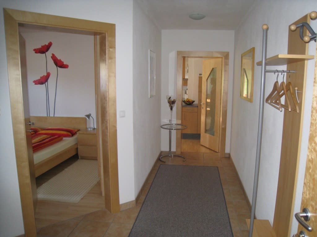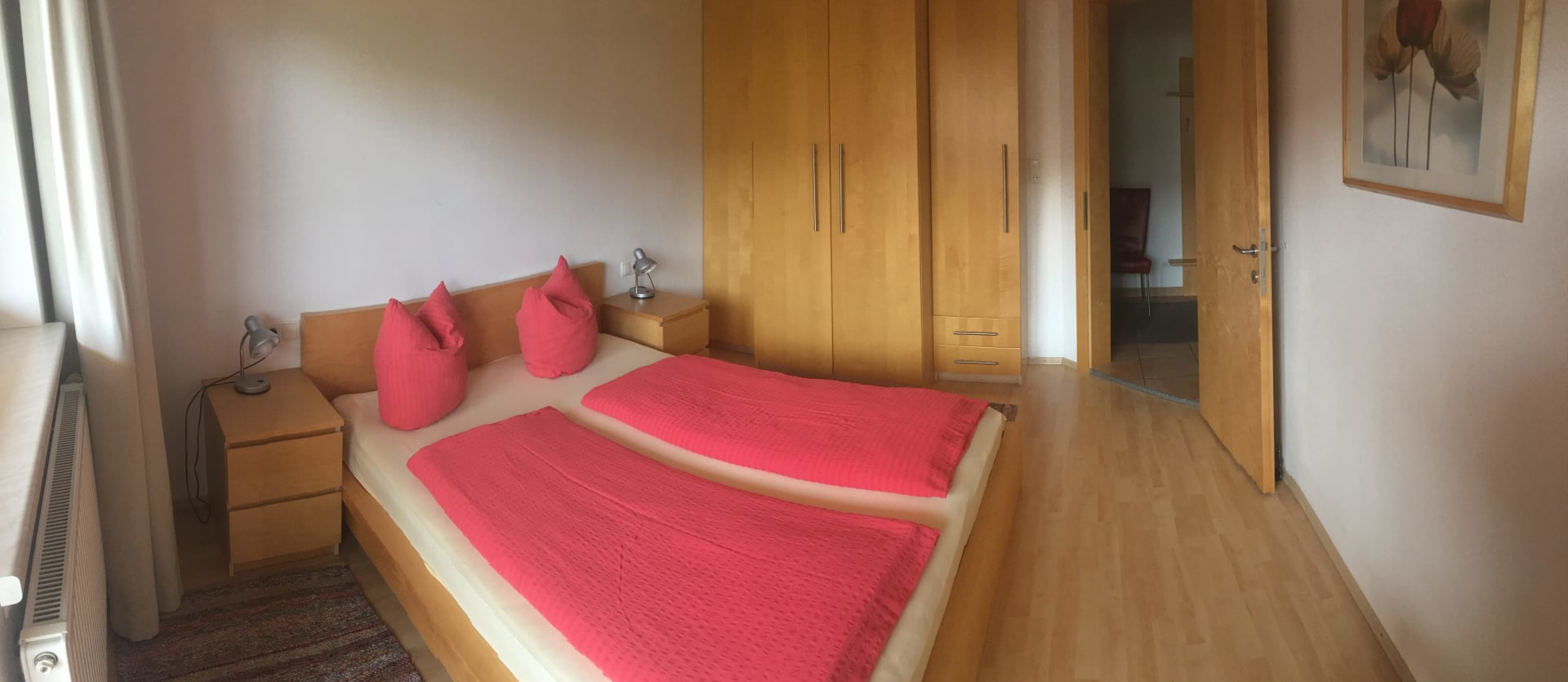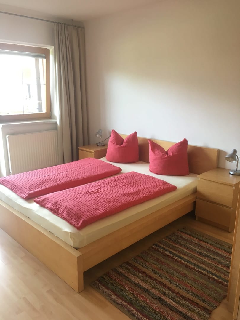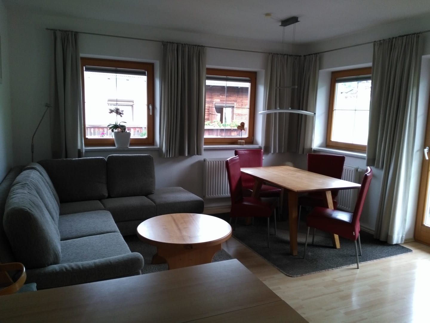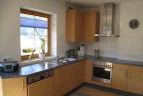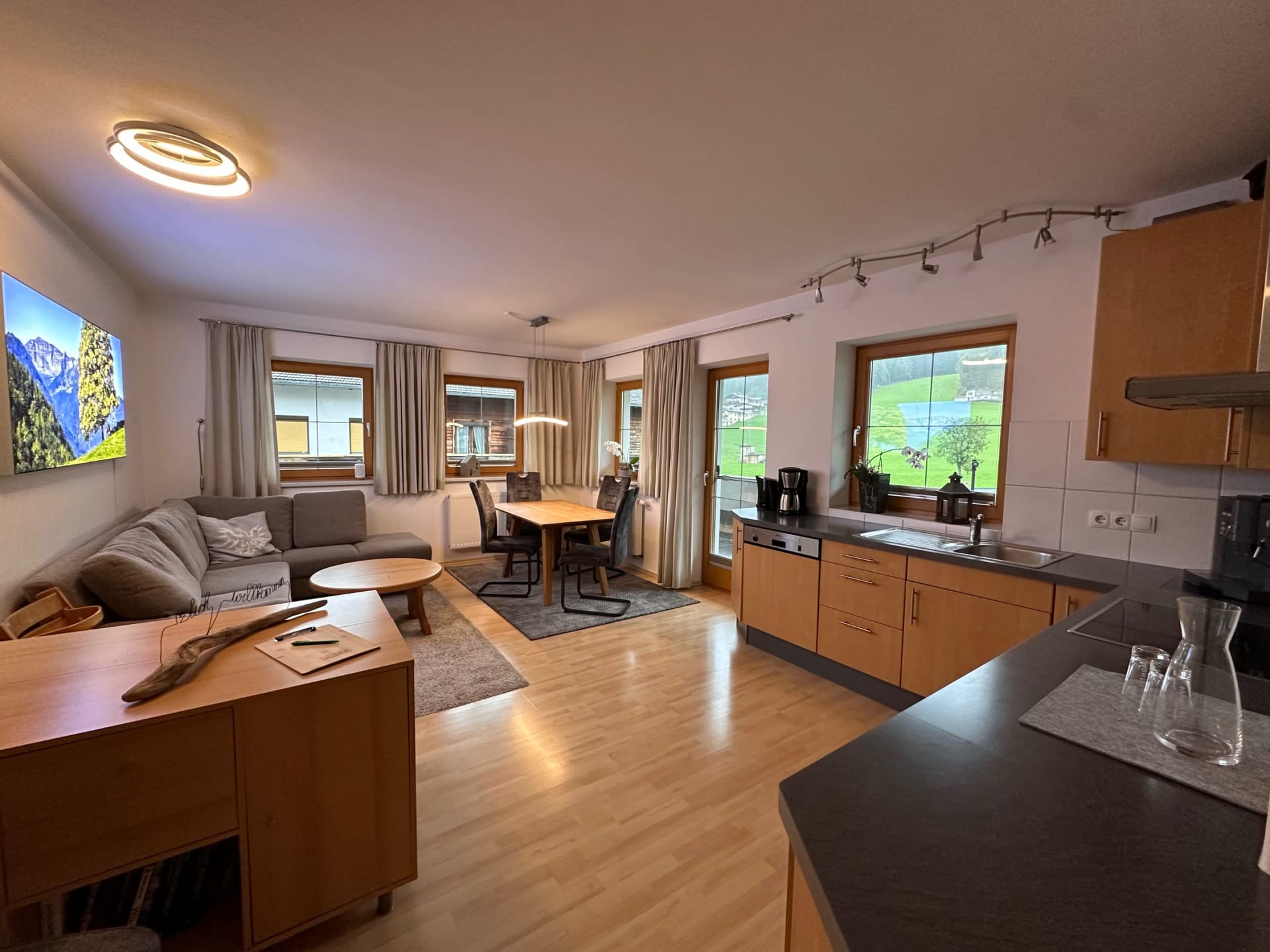 Großes Wohn/Schlafzimmer mit Sitzgarnitur (Schlafmöglichkeit für 2 Personen), SAT-TV, Radio, W-LAN, Essecke, eingebaute, offene Küche mit E-Herd- Ceranfeld, Backrohr, Spülmaschine, Mikrowelle, Kühlschrank mit Gefrierfach, Kaffeemaschine, Wasserkocher und Ausgang zum Balkon mit Gartenmöbeln und Blick auf´s Grüne und die Berge. Schlafzimmer mit großen Kleiderschrank und ebenso Ausgang zum Balkon.