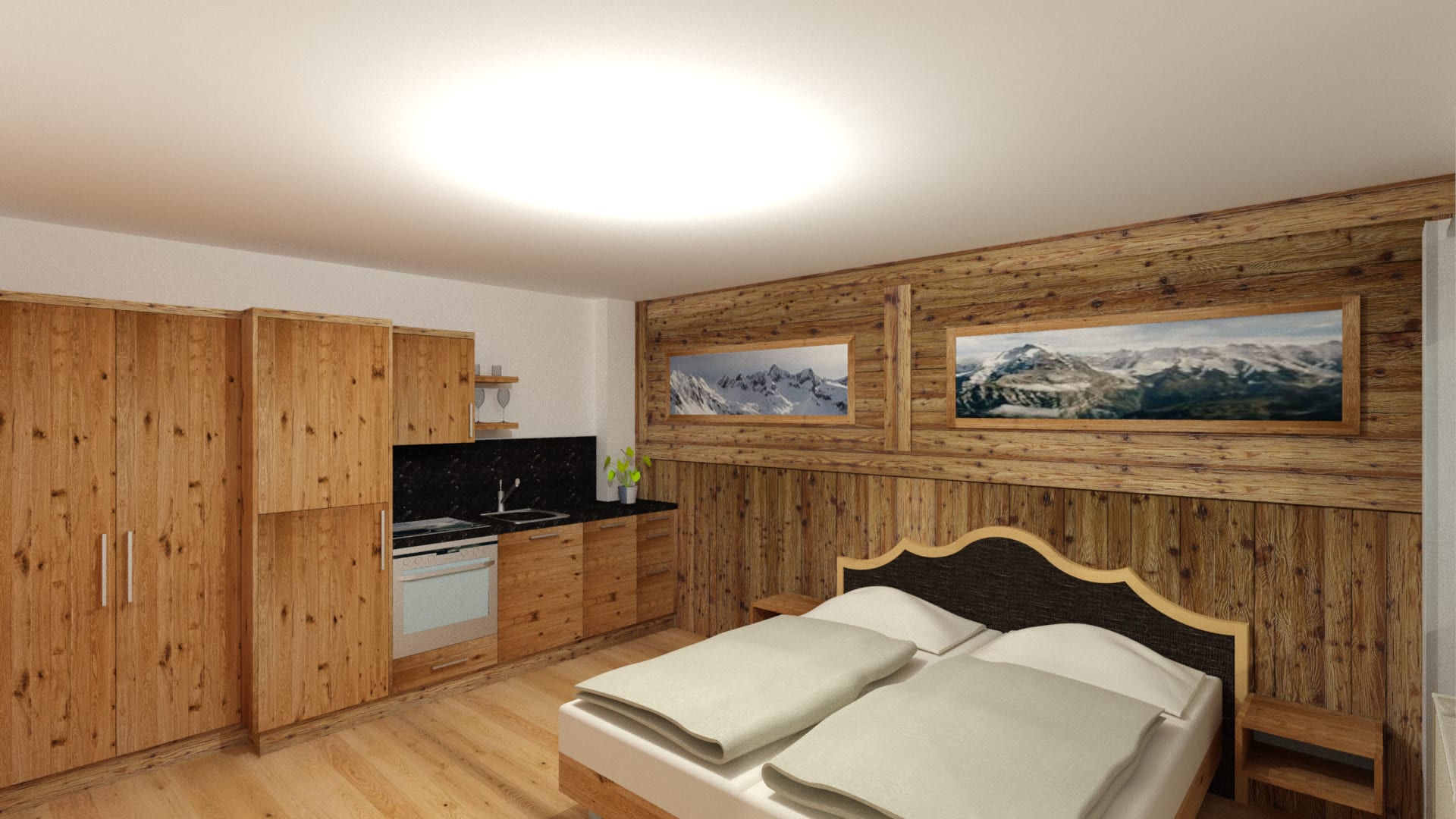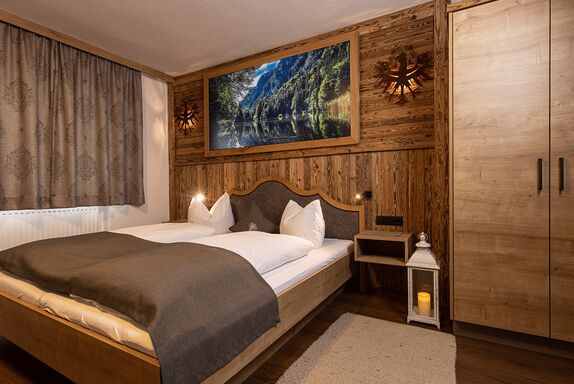 Edles heimisches Holz und natürliche Materialien verleihen dem traditionell, im Tiroler Stil, eingerichteten Doppelzimmer eine wohlig heimelige Atmosphäre. Das Zimmer verfügt über eine separate Dusche mit WC und einem Balkon.