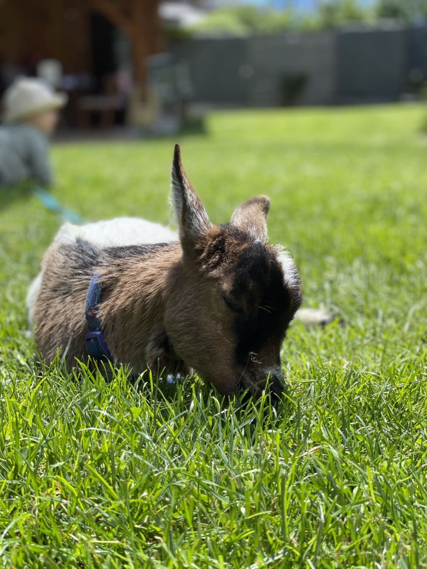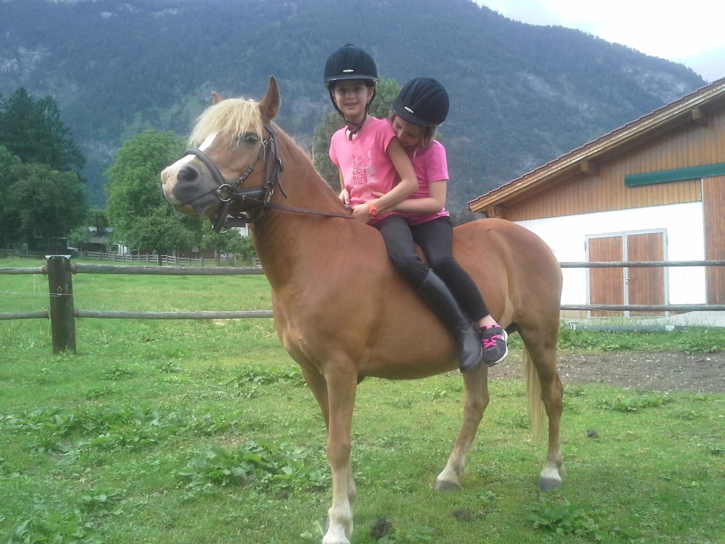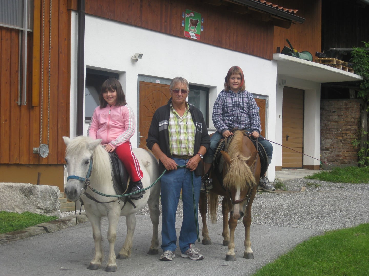 Tiere am Hof: Pferde, Kühe, Kälber, Kaninchen, eine Ziege und eine Katze.