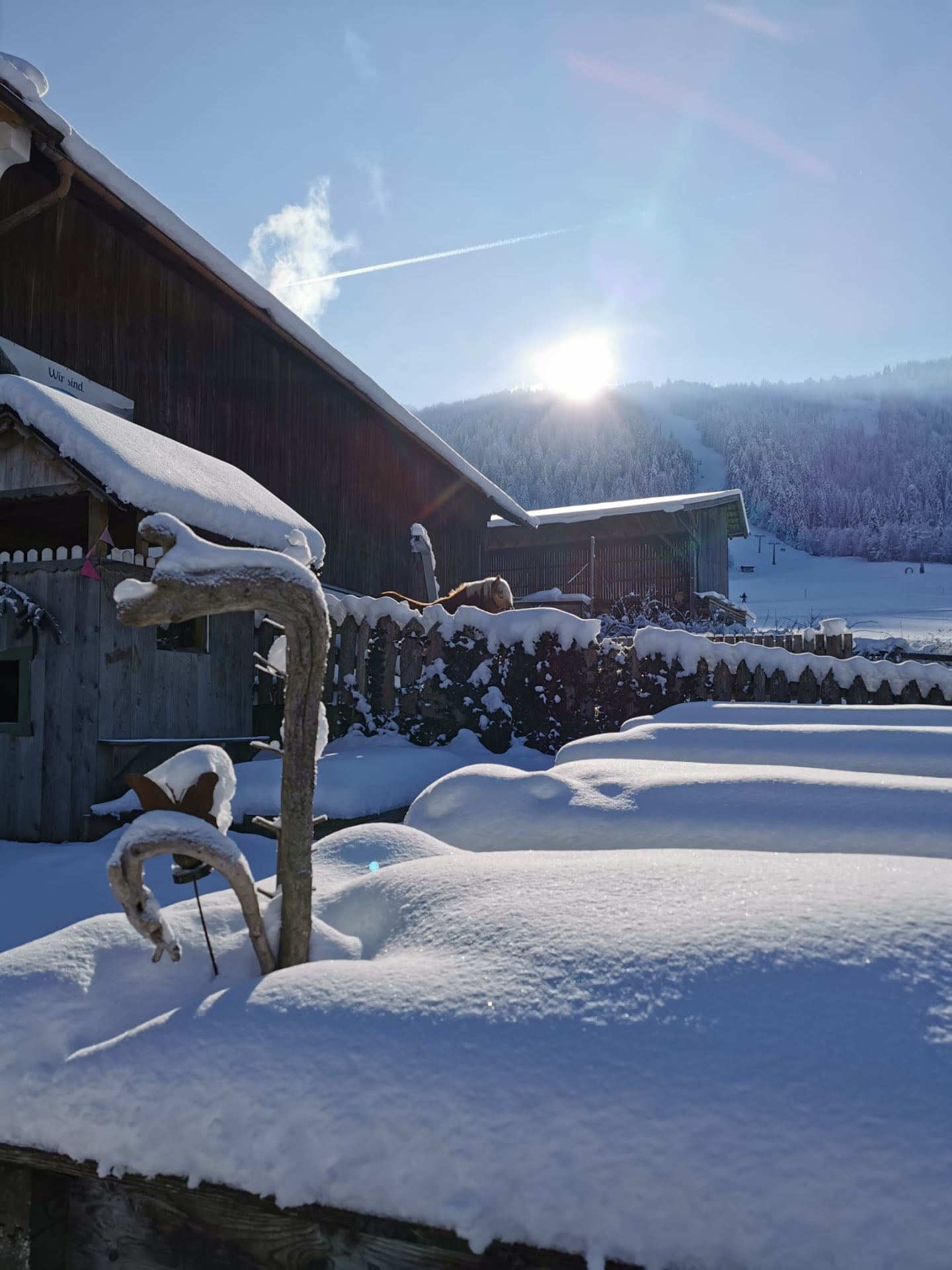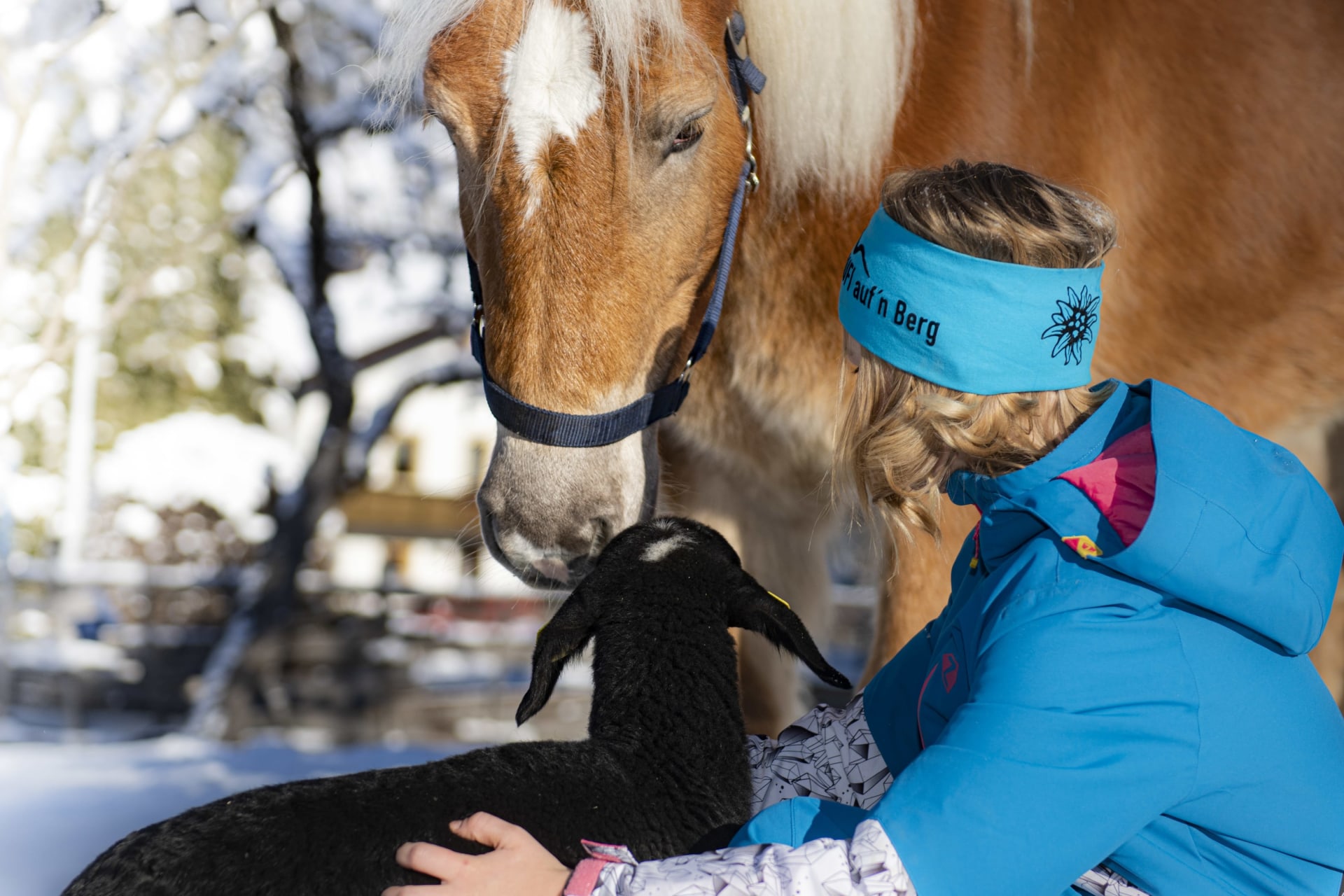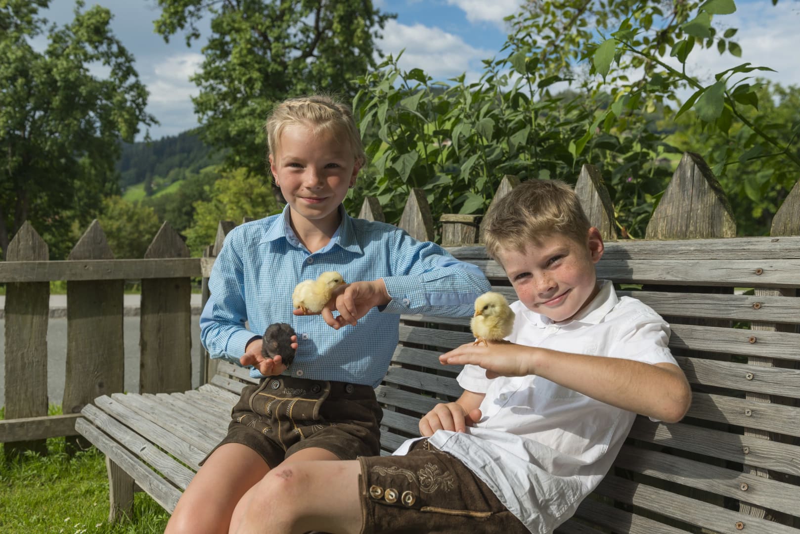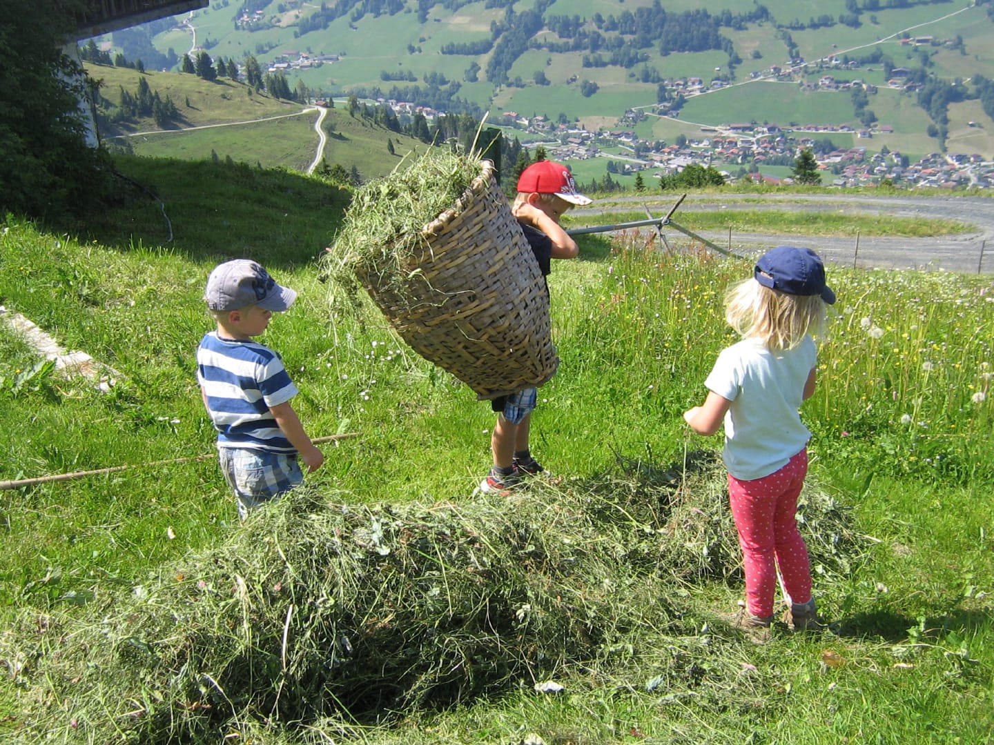Auf unserem Bauernhof ist auch nach dem Skifahren noch einiges geboten. Im Stall sind die Kühe, Kälber, Hühner, Kaninchen und Enten zu versorgen.