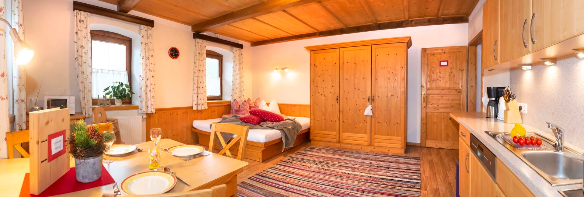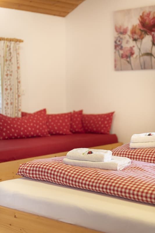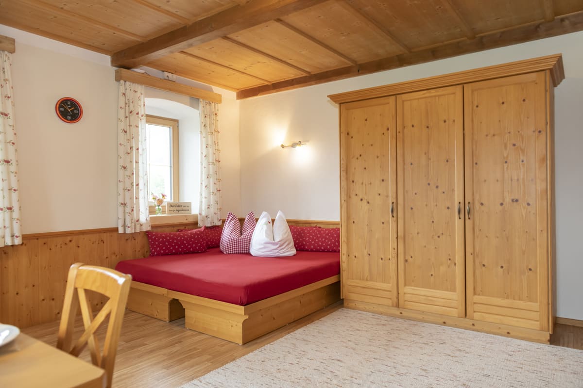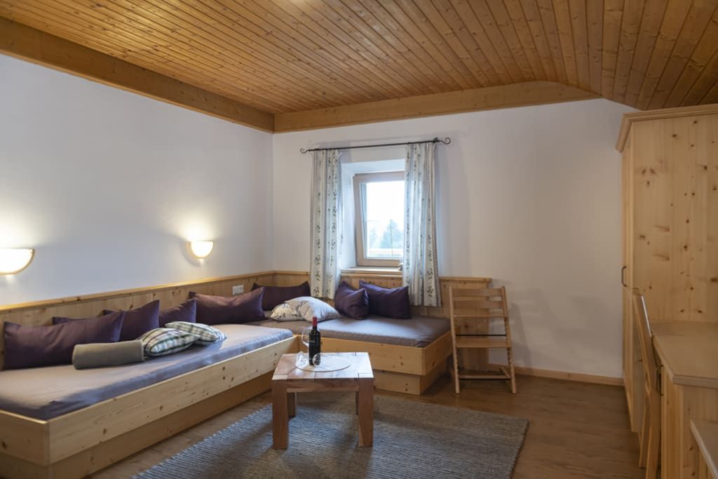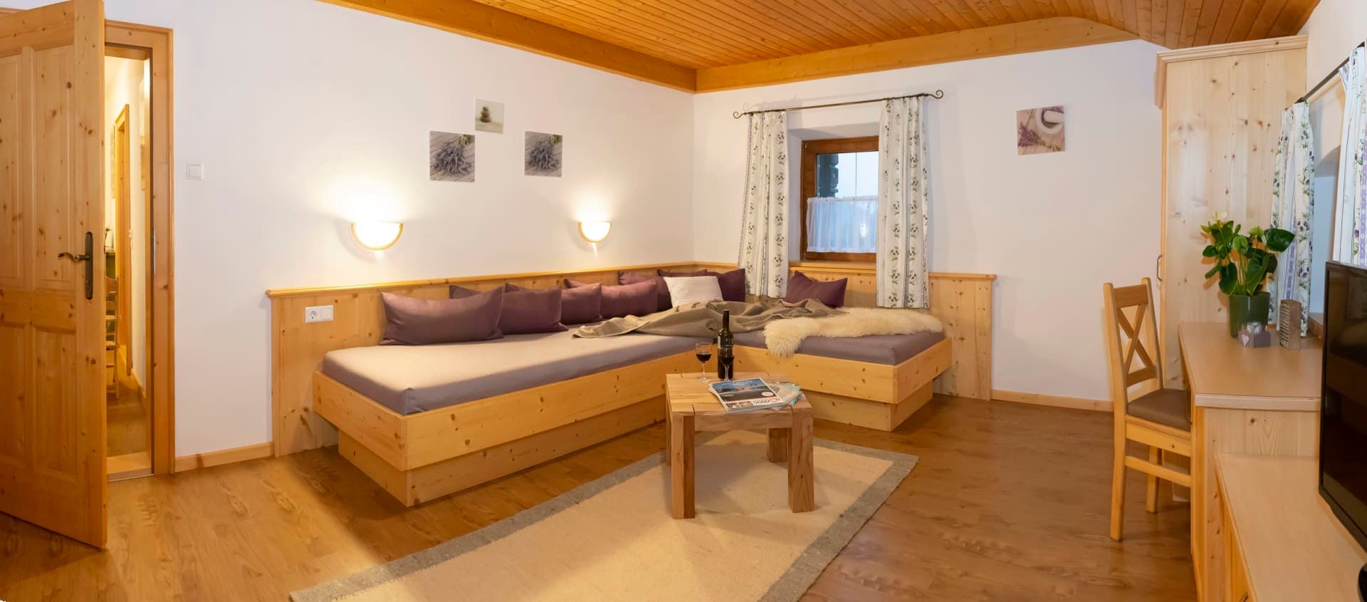 Unser Appartement für 2-4 Personen im ersten Stock des Bauernhauses. Die großen, hellen Räume (insbesondere Wohnraum) schaffen eine freundliche Atmosphäre. Die Wohnung kann wahlweise für 2-4 Personen genutzt werden. Bei 4 Personen steht neben dem Schlafzimmer auch im Wohnzimmer noch zwei Betten zur Verfügung.