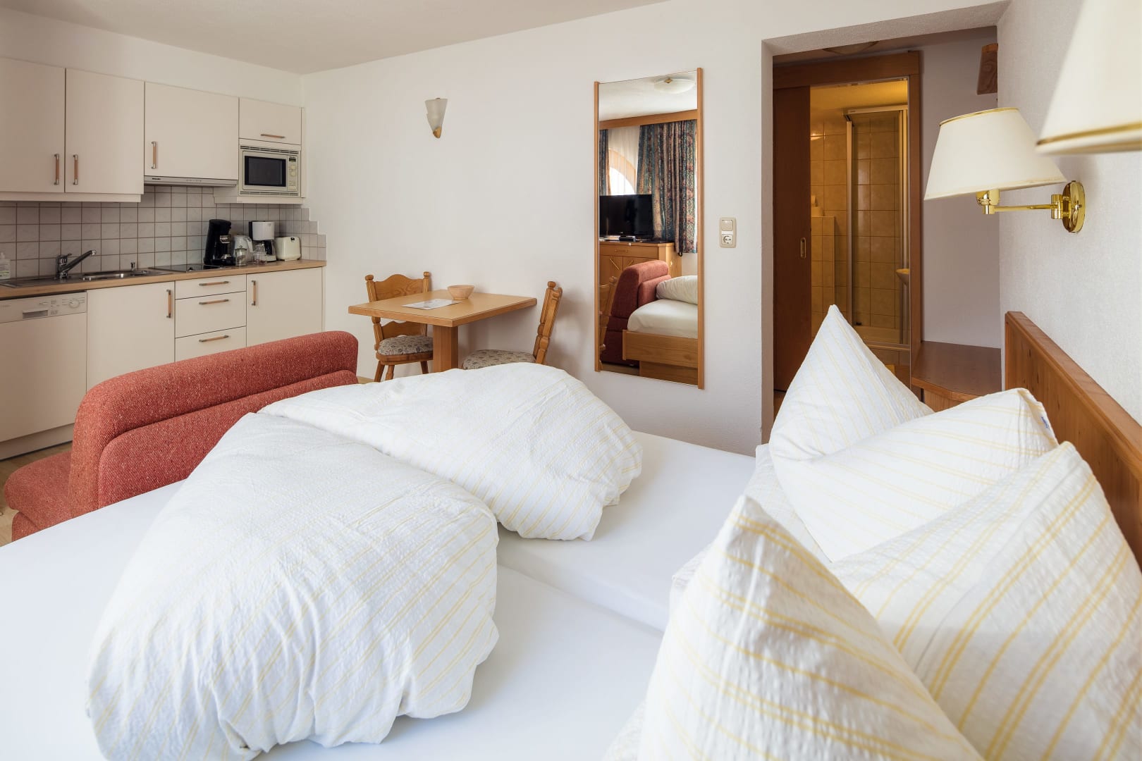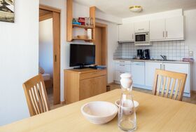 Gemütlicher Wohnraum mit Küchenblock und Sofa, Kabel-TV, Safe, Radio, Telefon, CD-Player mit Radiowecker und Balkon Kücheneinrichtung mit Geschirrspülmaschine, Mikrowelle, E-Herd, Kühlschrank mit Gefrierfach, Kaffeemaschine, Wasserkocher, Geschirr, Besteck, Toaster, usw.