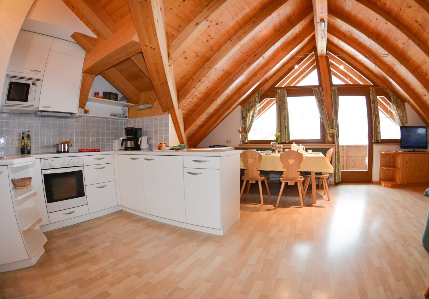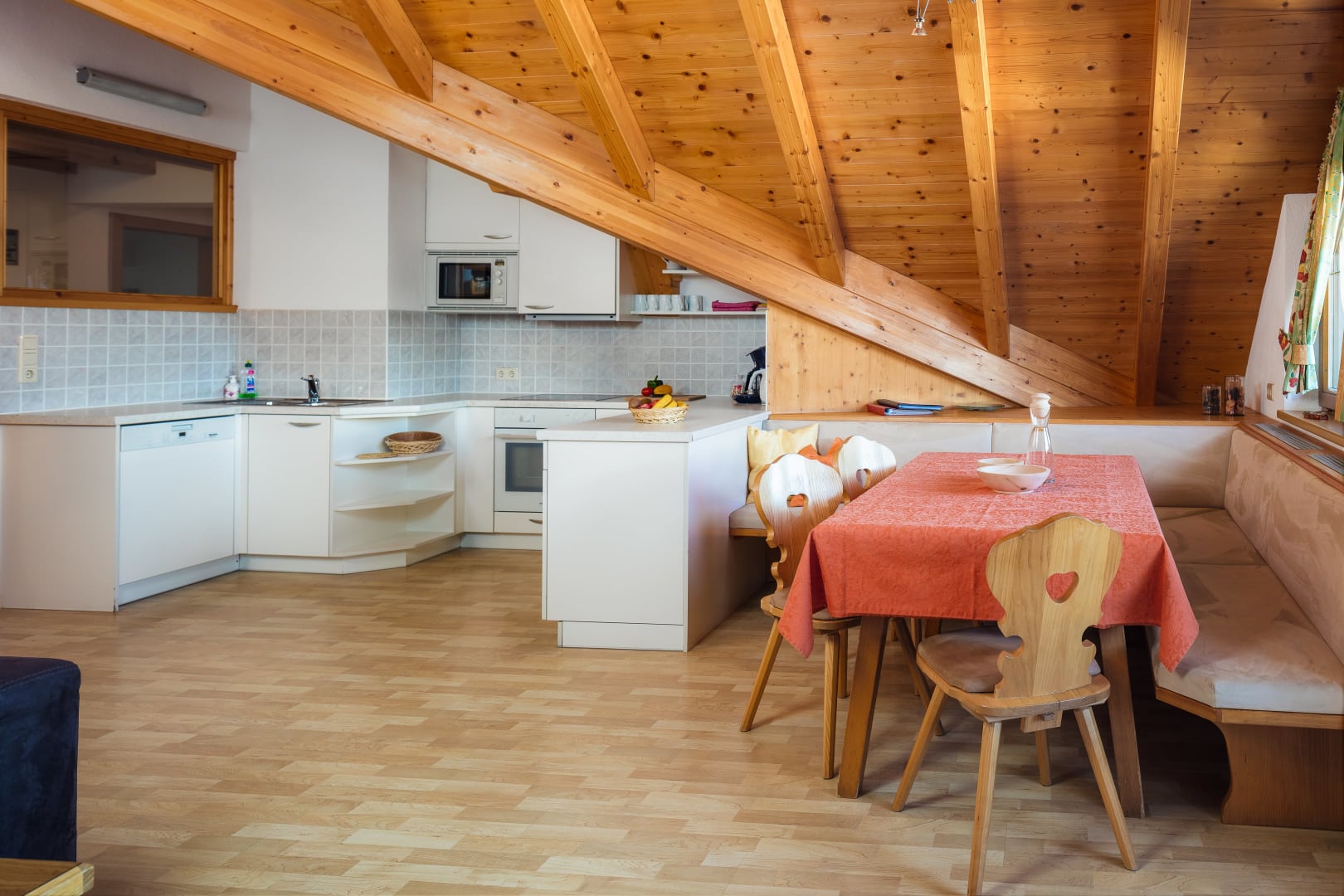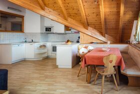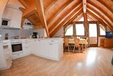Küche mit E-Herd, Backrohr, Geschirrspülmaschine, Mikrowelle, Kaffeemaschine, Wasserkocher, Kühlschrank mit Gefrierfach, Toaster, Geschirr, Besteck, usw.