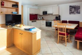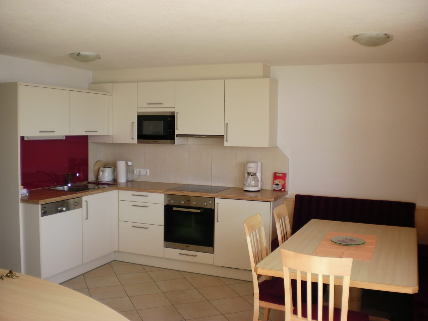 Küche mit E-Herd, Backrohr, Geschirrspülmaschine, Mikrowelle, Kaffeemaschine, Wasserkocher, Kühlschrank mit Gefrierfach, Toaster, Geschirr, Besteck, usw