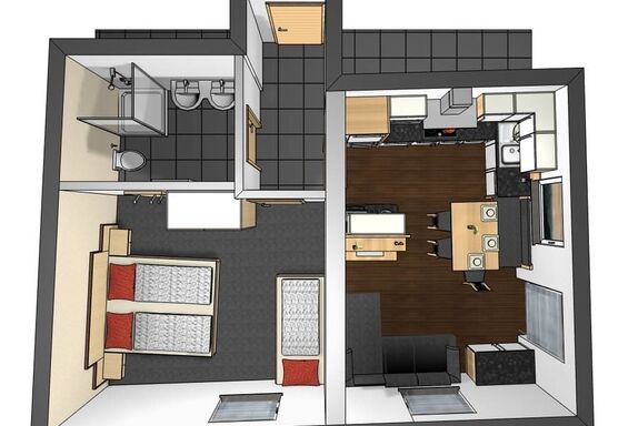 Moderner liebevoll eingerichteter Wohnraum mit 1 Schlafzimmer mit 1 Doppel- und Einzelbett und einer Wohnküche mit ausziehbarer Couch für 2 Personen. Echter Parkettboden (Eiche) besonders geeignet für Allergiker! Ein Bodenbelag aus Echtholz fördert das menschliche Wohlbefinden. Wohnküche: Herd mit Ceranfeld, großem Kühlschrank mit Gefrierfach, Spülmaschine, Mikrowelle, Dunstabzug, Kaffeemaschine, Stereoanlage, Telefon, Tischecke für 5 Personen.