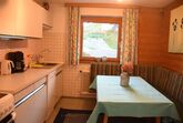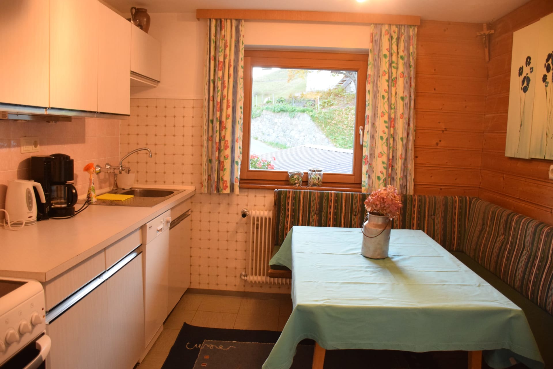 Wohnküche mit Kühlschrank, Spülmaschine, Mikrowellenherd, Herd mit Backrohr, Sitzgruppe, Geschirr, Gläser und Küchenutensilien, Handtücher vorhanden.