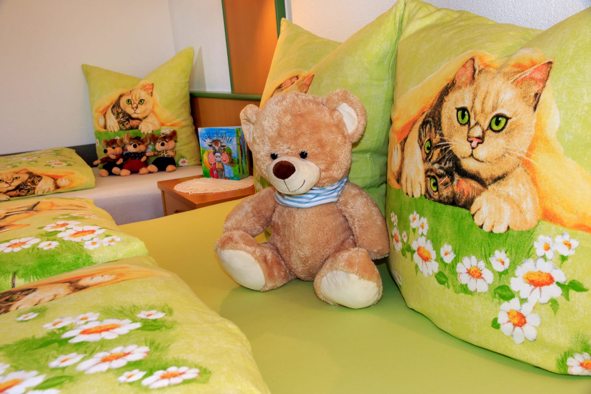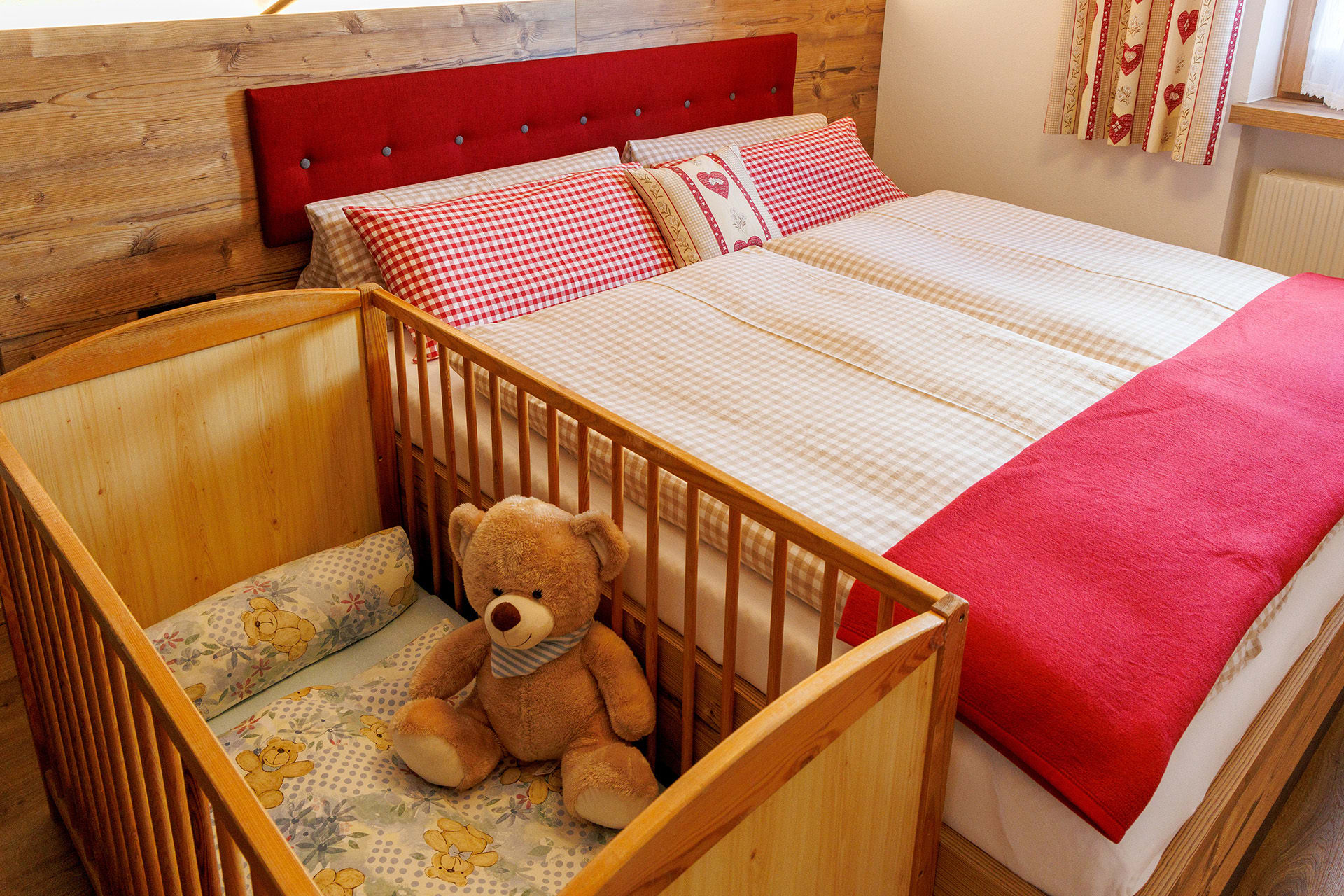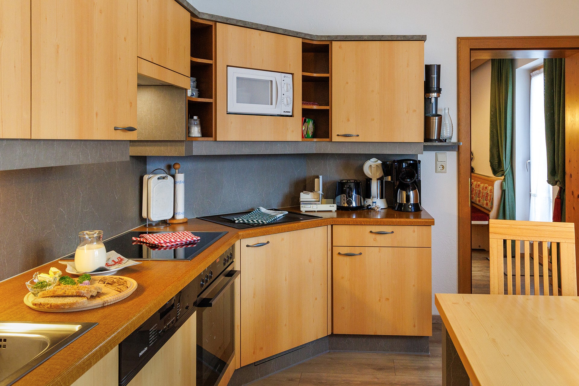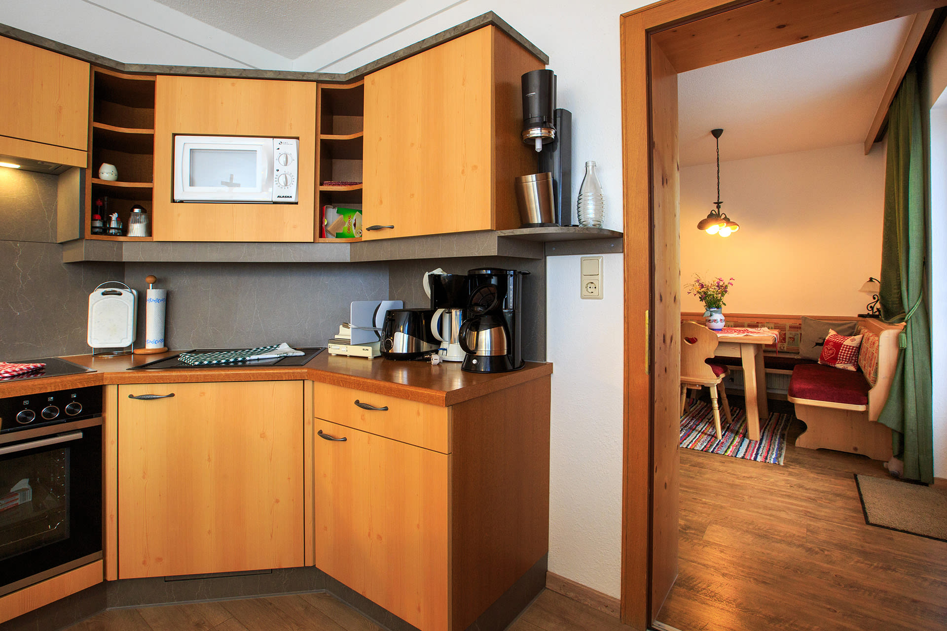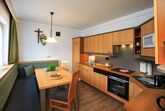 Die voll ausgestattete Küche mit Essbereich lädt zum gemeinsamen Kochen und Genießen ein. Zwei separate Schlafzimmer – ein Doppelzimmer und ein Zweibettzimmer – bieten erholsamen Schlaf; auf Wunsch stellen wir gerne ein Gitterbett bereit.