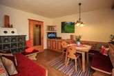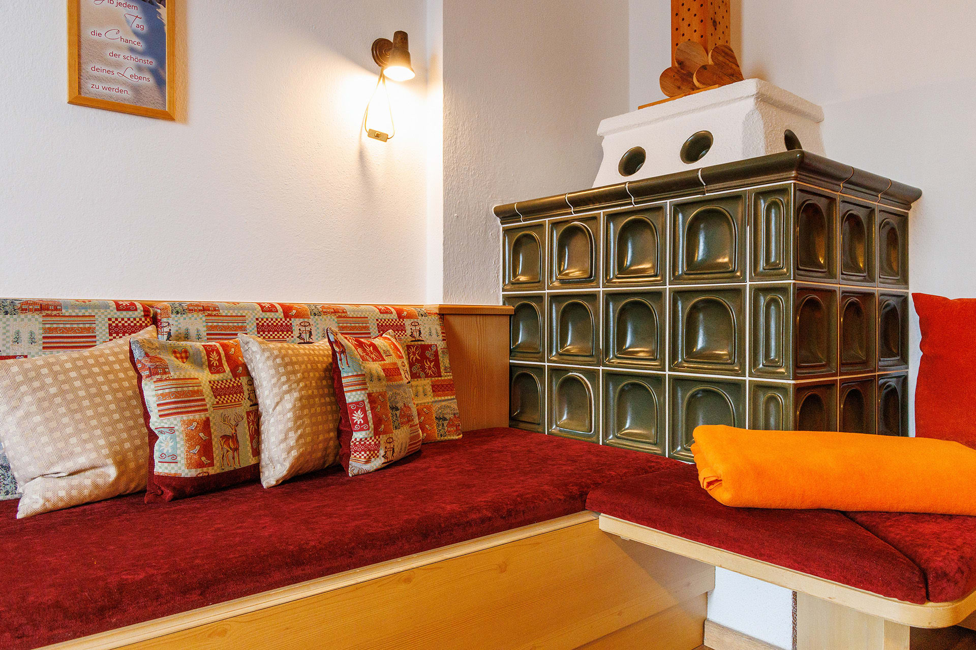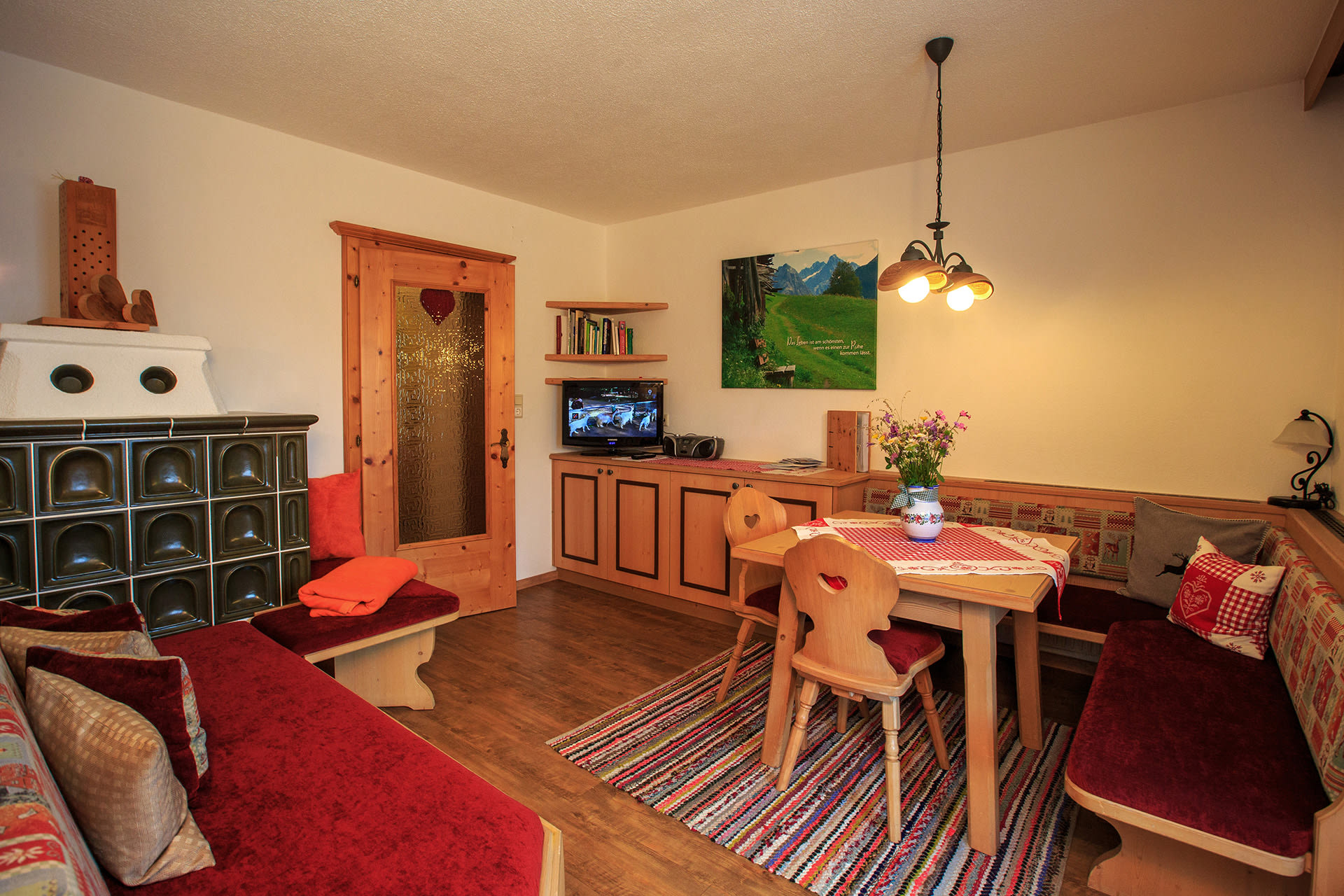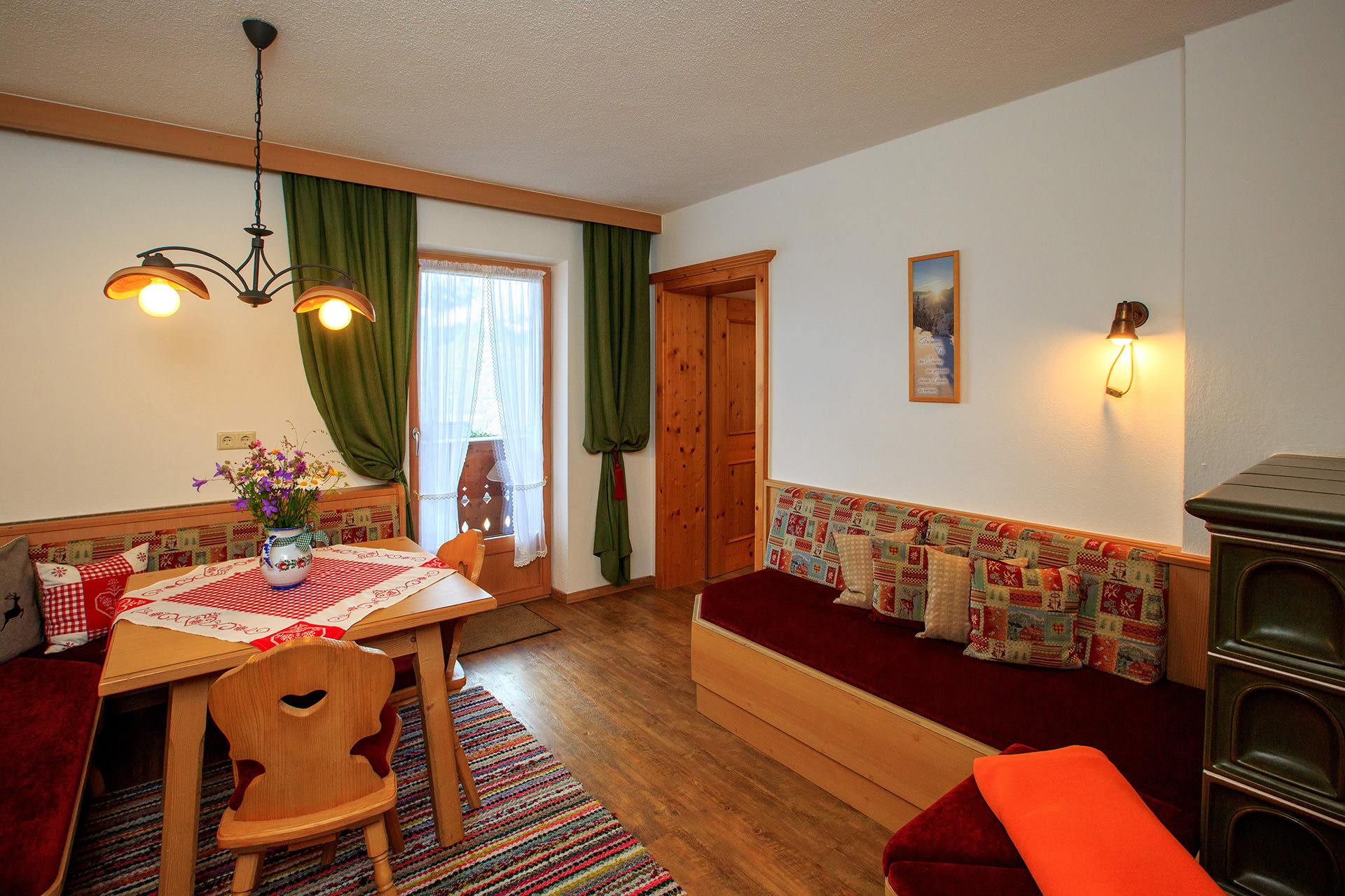 Das Apartment Enzian bietet auf 80 m² Platz für bis zu 4 Personen – ideal für Familien und Naturfreunde. Die im Landhausstil eingerichtete Ferienwohnung besticht durch warme Farben und liebevolle Details. Im Wohnzimmer sorgt ein Kachelofen für wohlige Wärme und eine entspannte Atmosphäre.