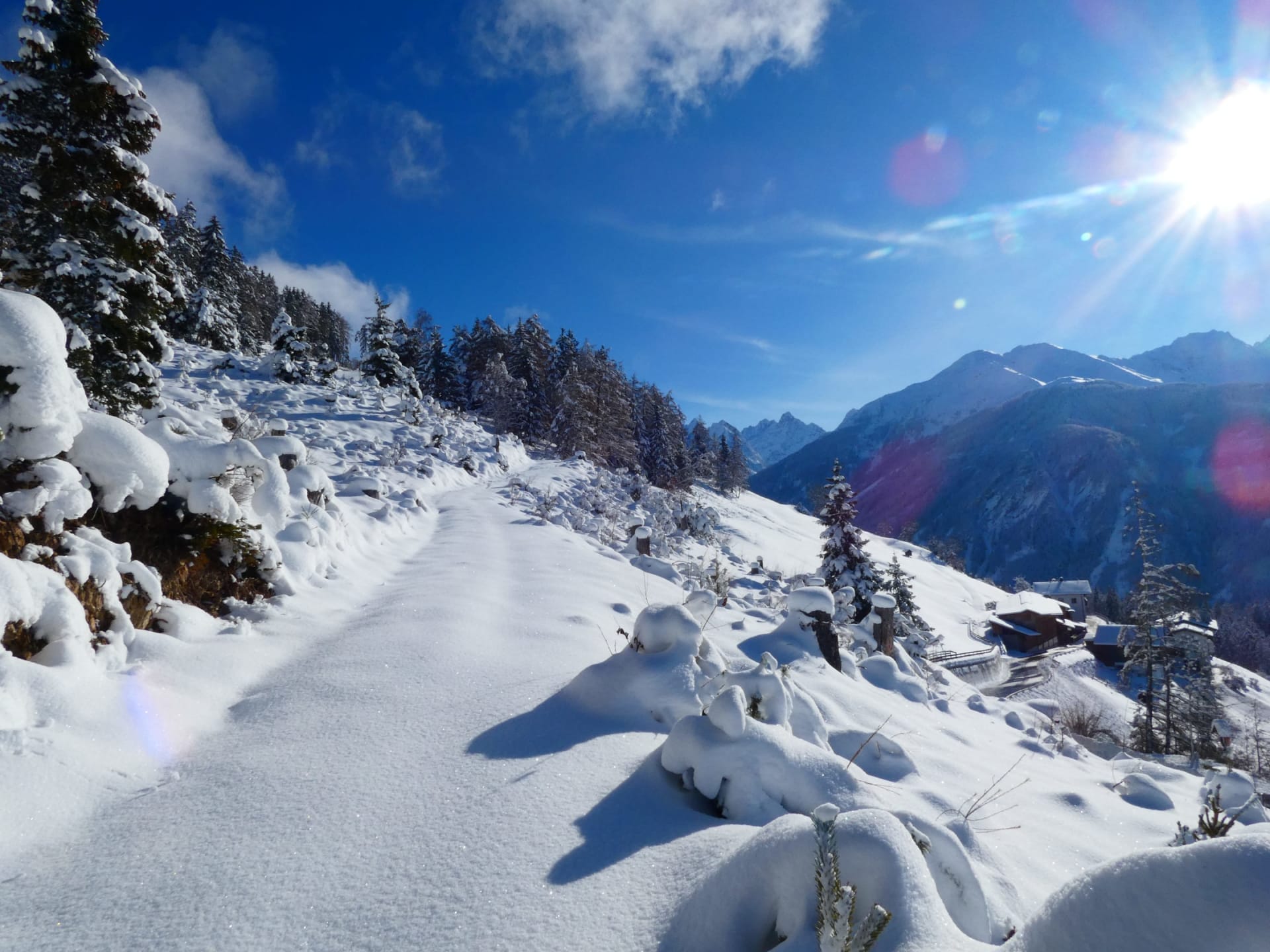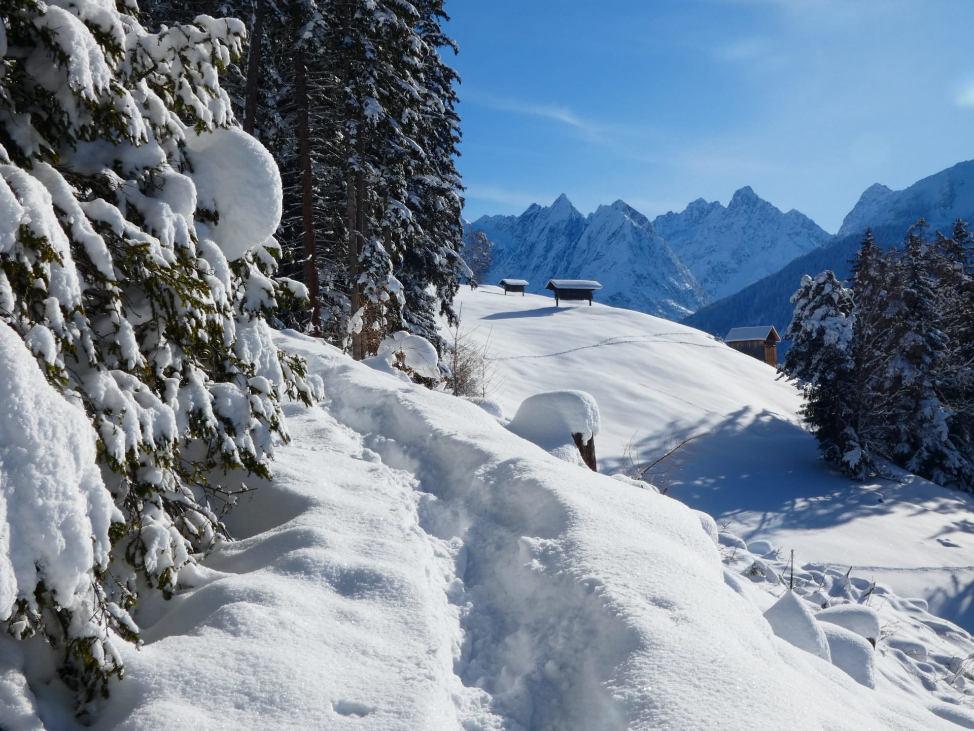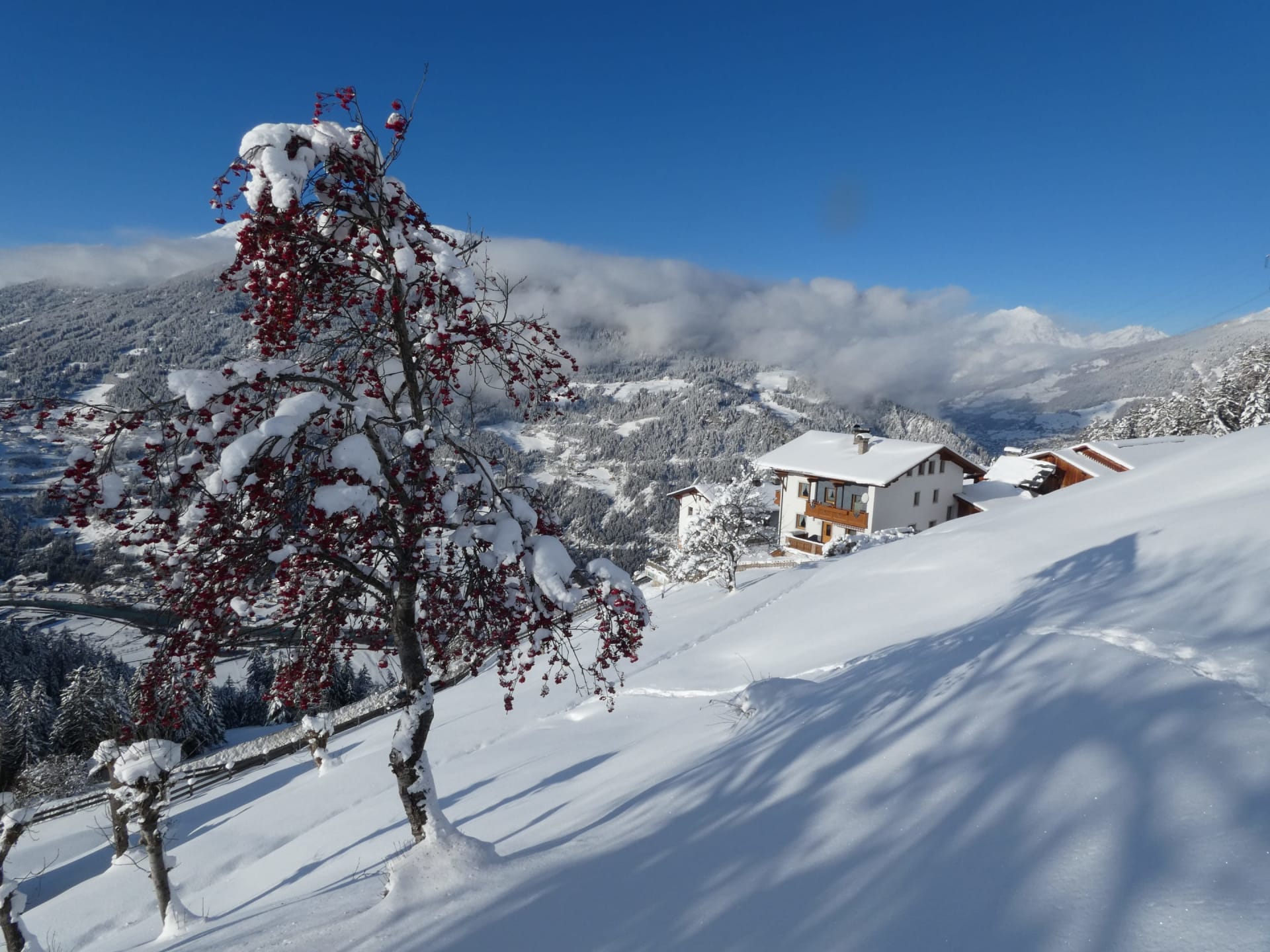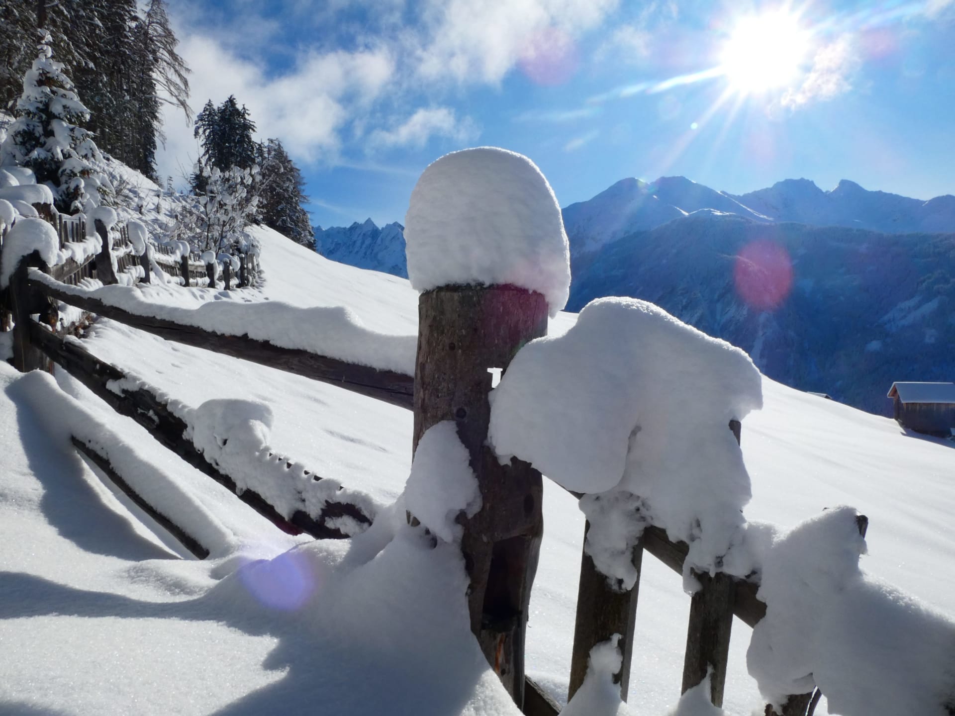 Pulverschnee, klare Bergluft und ein traumhaftes Panorama: Schneemann bauen, Schneeballschlachten, Schneeschuhwandern oder eine fröhliche Rodelpartie – direkt rund um unseren Hof.