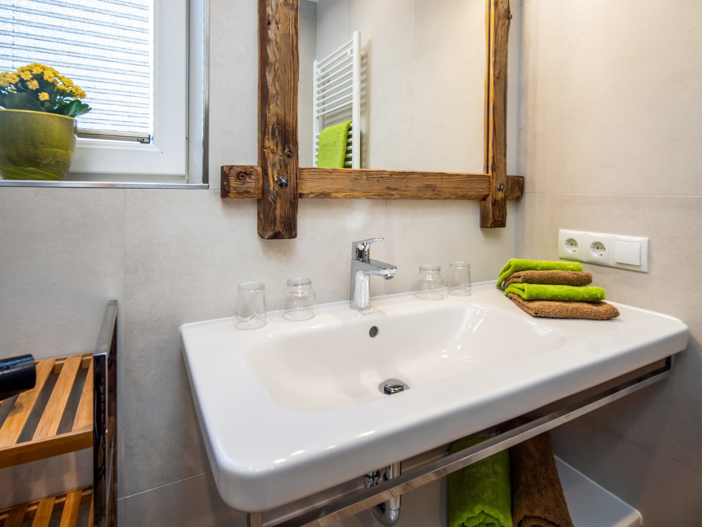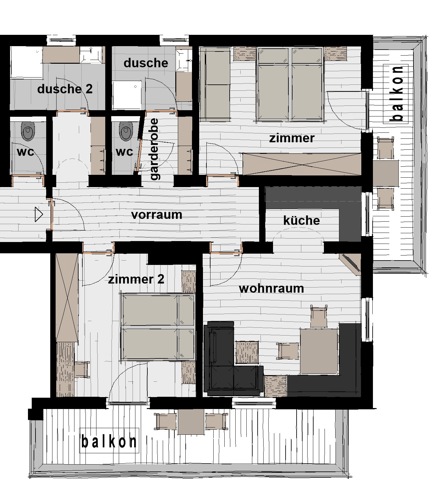 Das Apartment bietet zwei gemütliche Doppelzimmer, eines davon mit zusätzlichem Schlafsofa – perfekt für Familien mit Kindern oder kleine Reisegruppen. Beide Schlafzimmer verfügen über einen eigenen Balkon, zwei moderne Badezimmer mit Dusche und separatem WC sorgen für zusätzlichen Komfort.