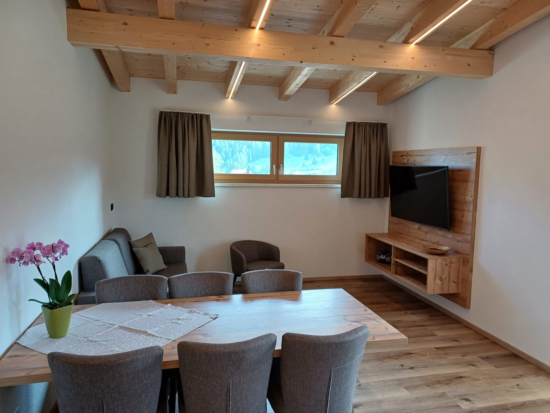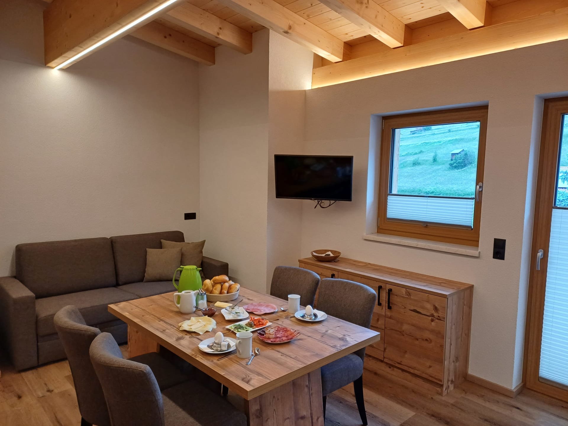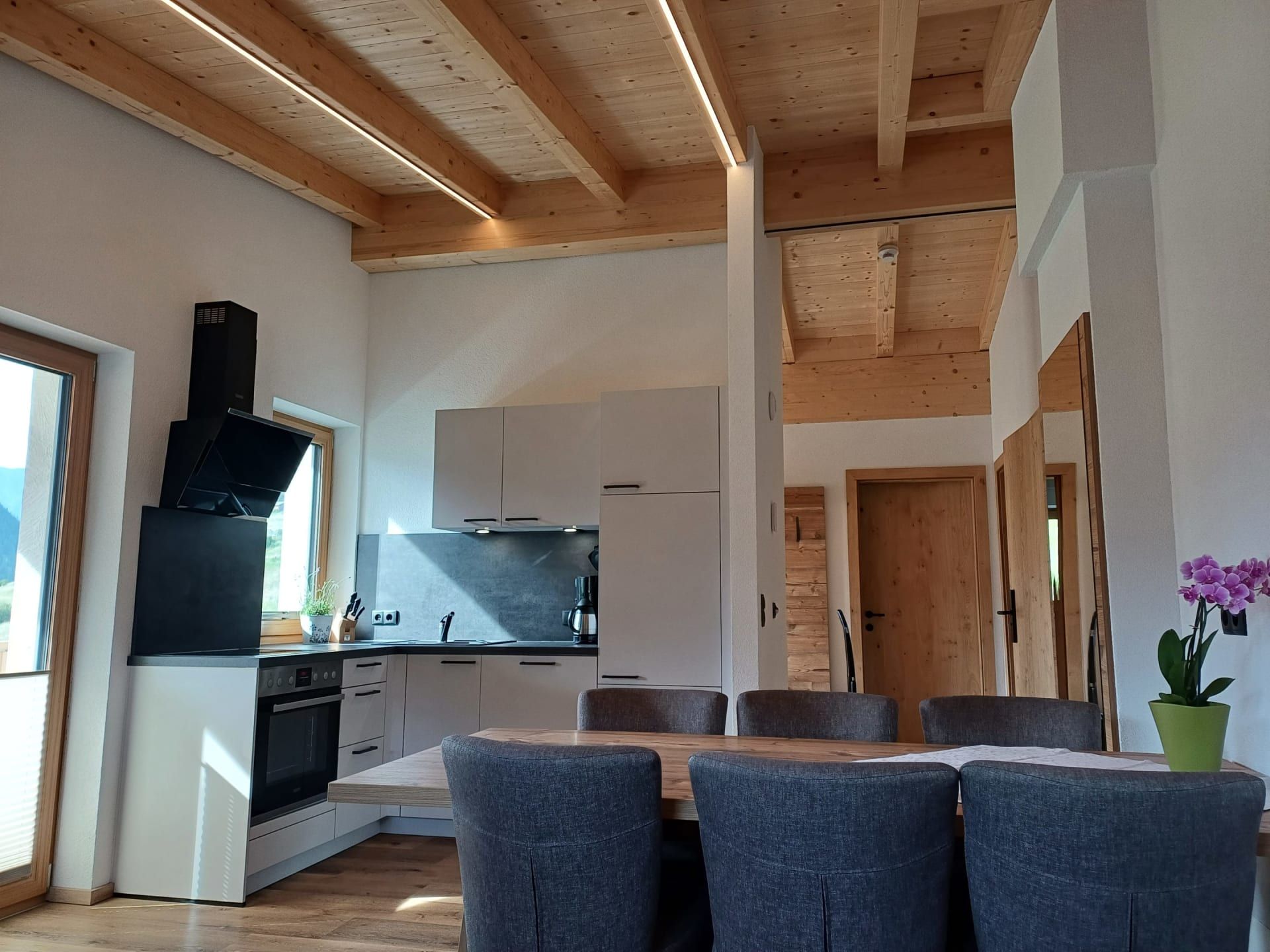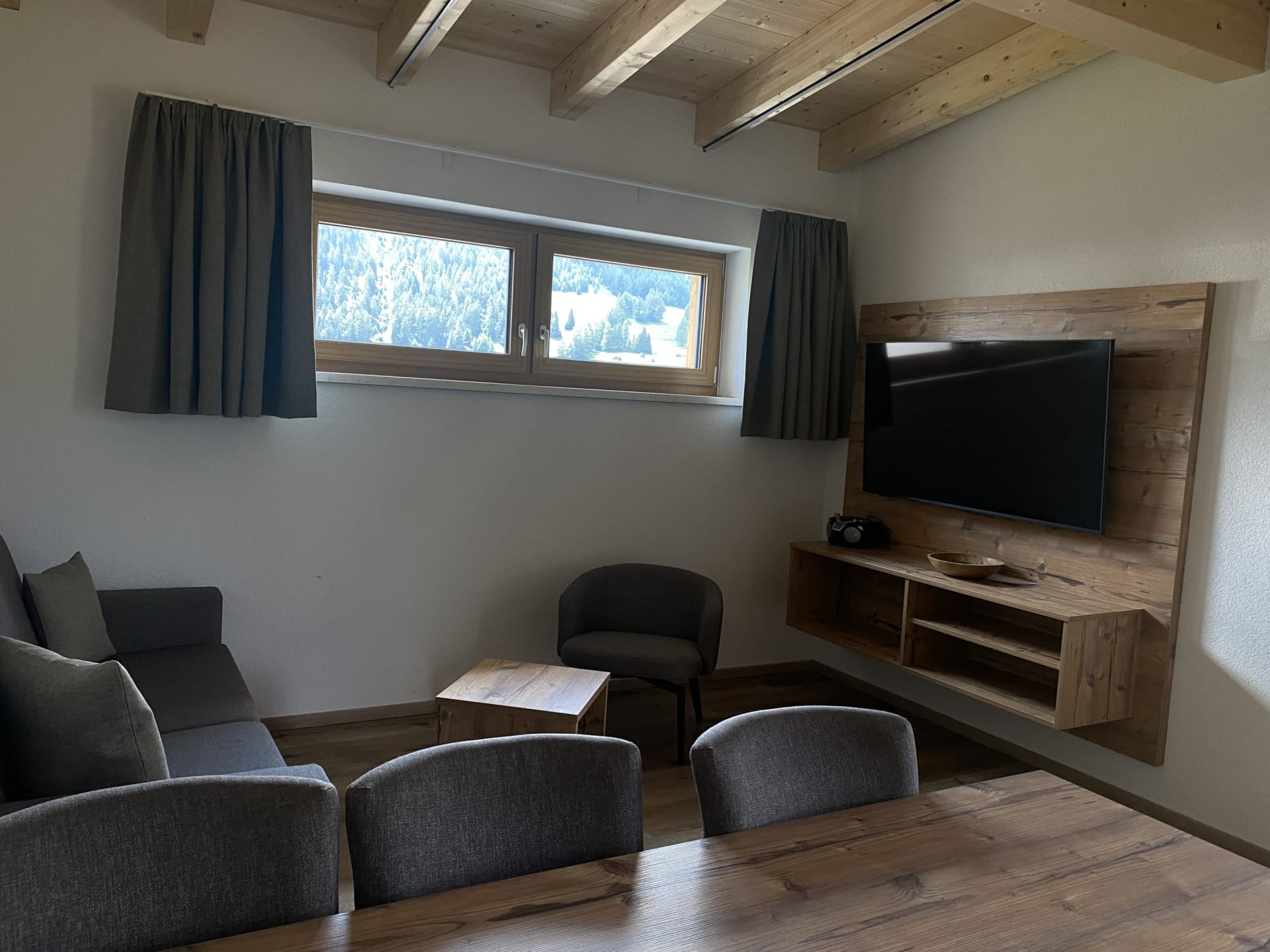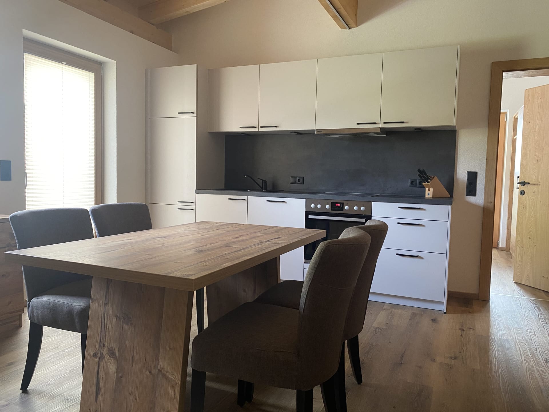 Die Ferienwohnung Engadin befindet sich zwar noch immer im dritten Stock – doch ansonsten ist sie kaum wiederzuerkennen. Ein offener Sichtdachstuhl aus hellem Fichtenholz verleiht den Räumen eine freundliche, großzügige Atmosphäre. Neue Möbel, ein großer Esstisch, bequeme Stühle und viel Platz zum Durchatmen lassen das Urlaubsherz höherschlagen.