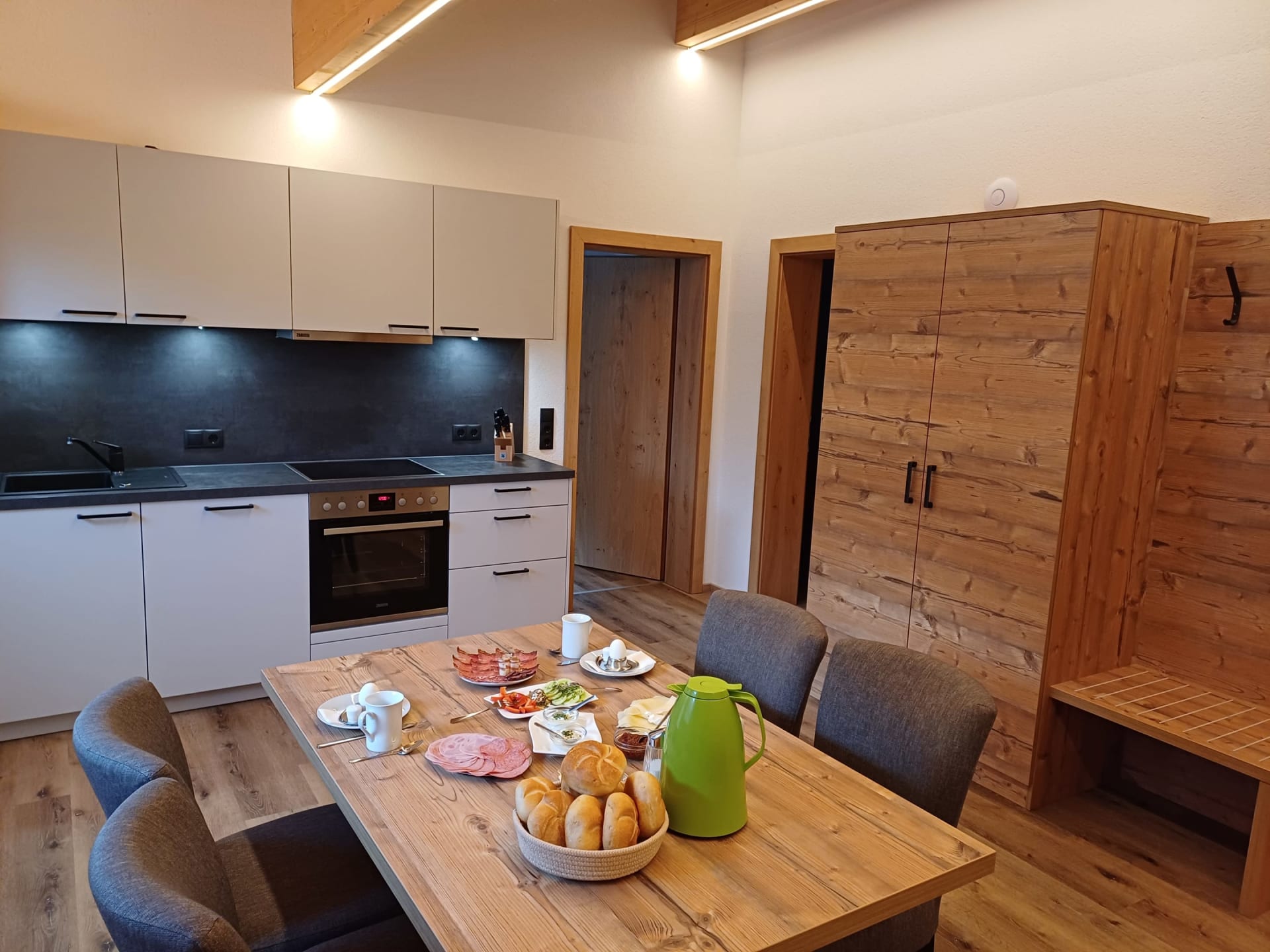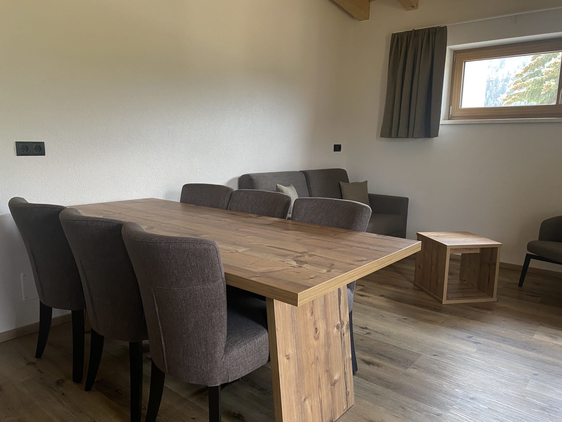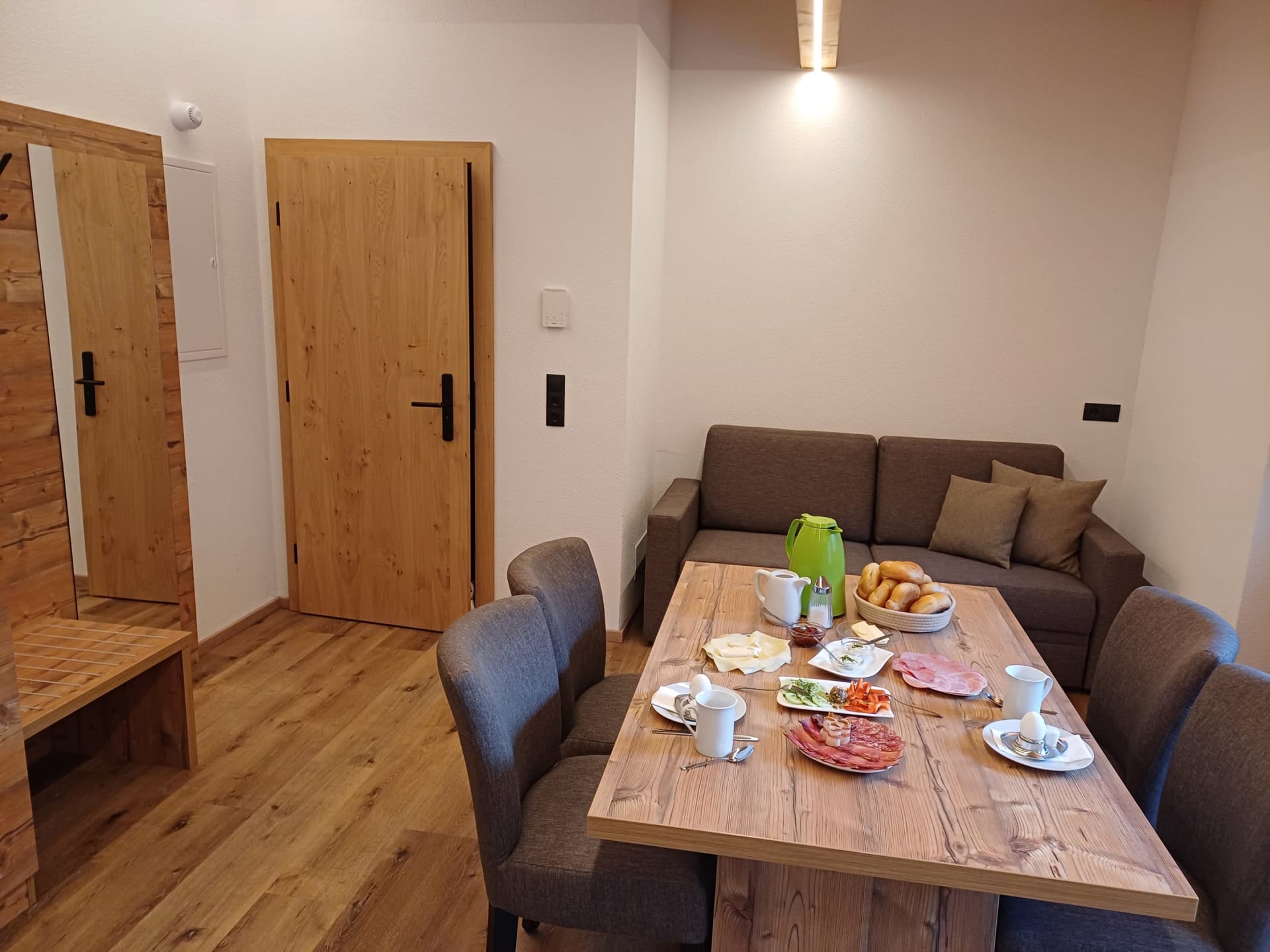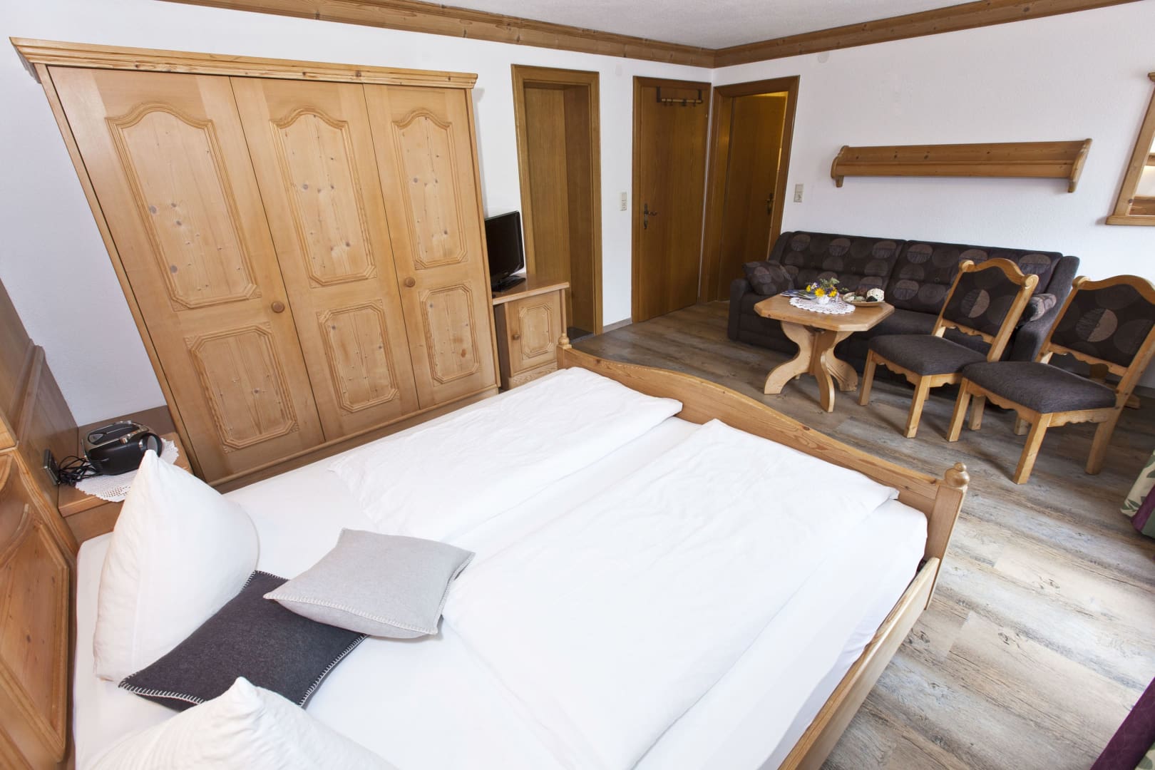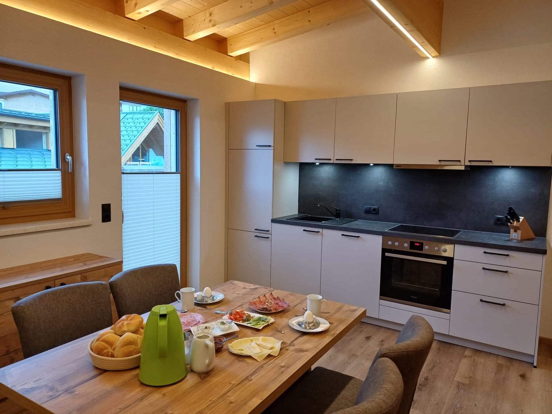 Die Ferienwohnung Engadin befindet sich zwar noch immer im dritten Stock – doch ansonsten ist sie kaum wiederzuerkennen. Ein offener Sichtdachstuhl aus hellem Fichtenholz verleiht den Räumen eine freundliche, großzügige Atmosphäre. Neue Möbel, ein großer Esstisch, bequeme Stühle und viel Platz zum Durchatmen lassen das Urlaubsherz höherschlagen.