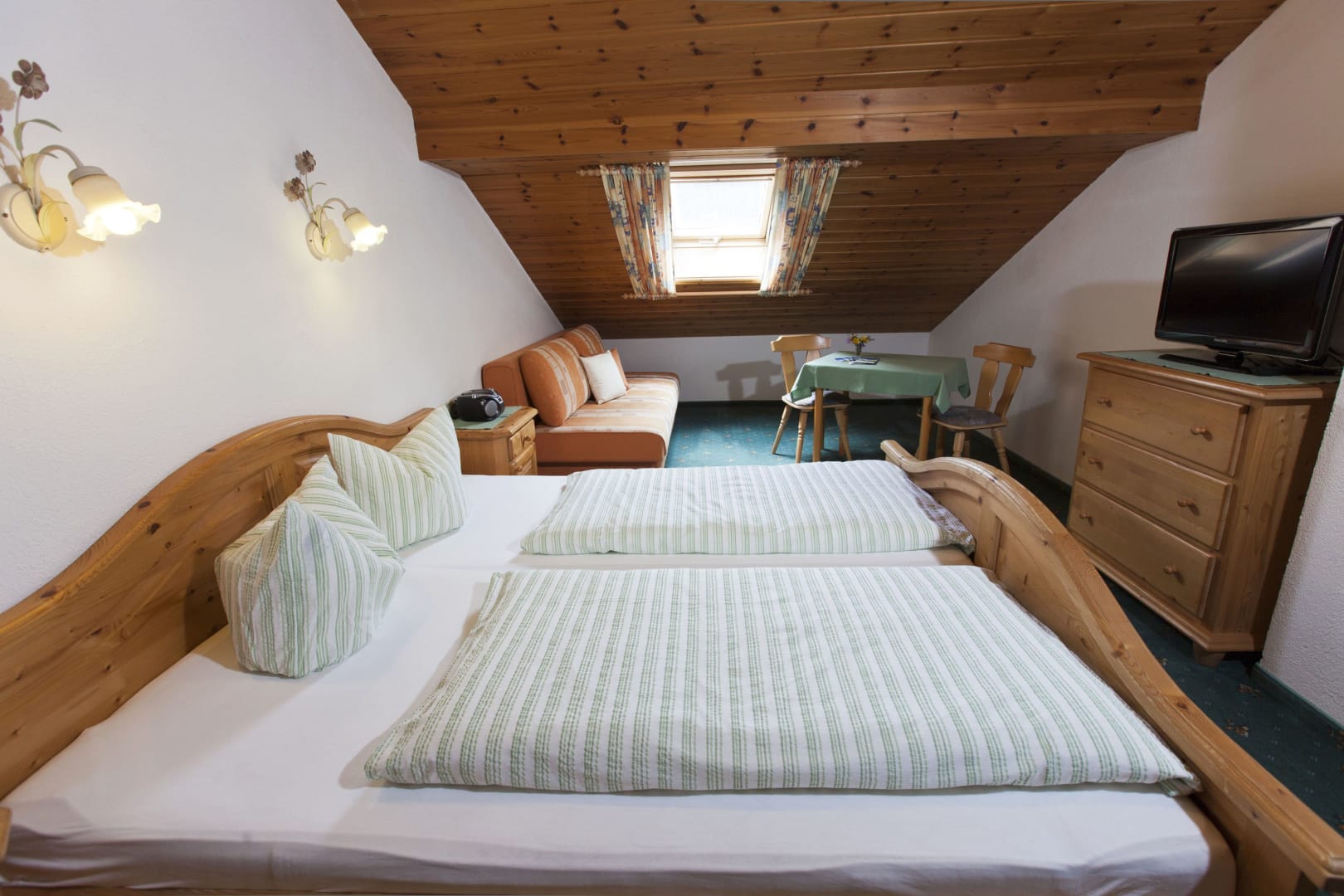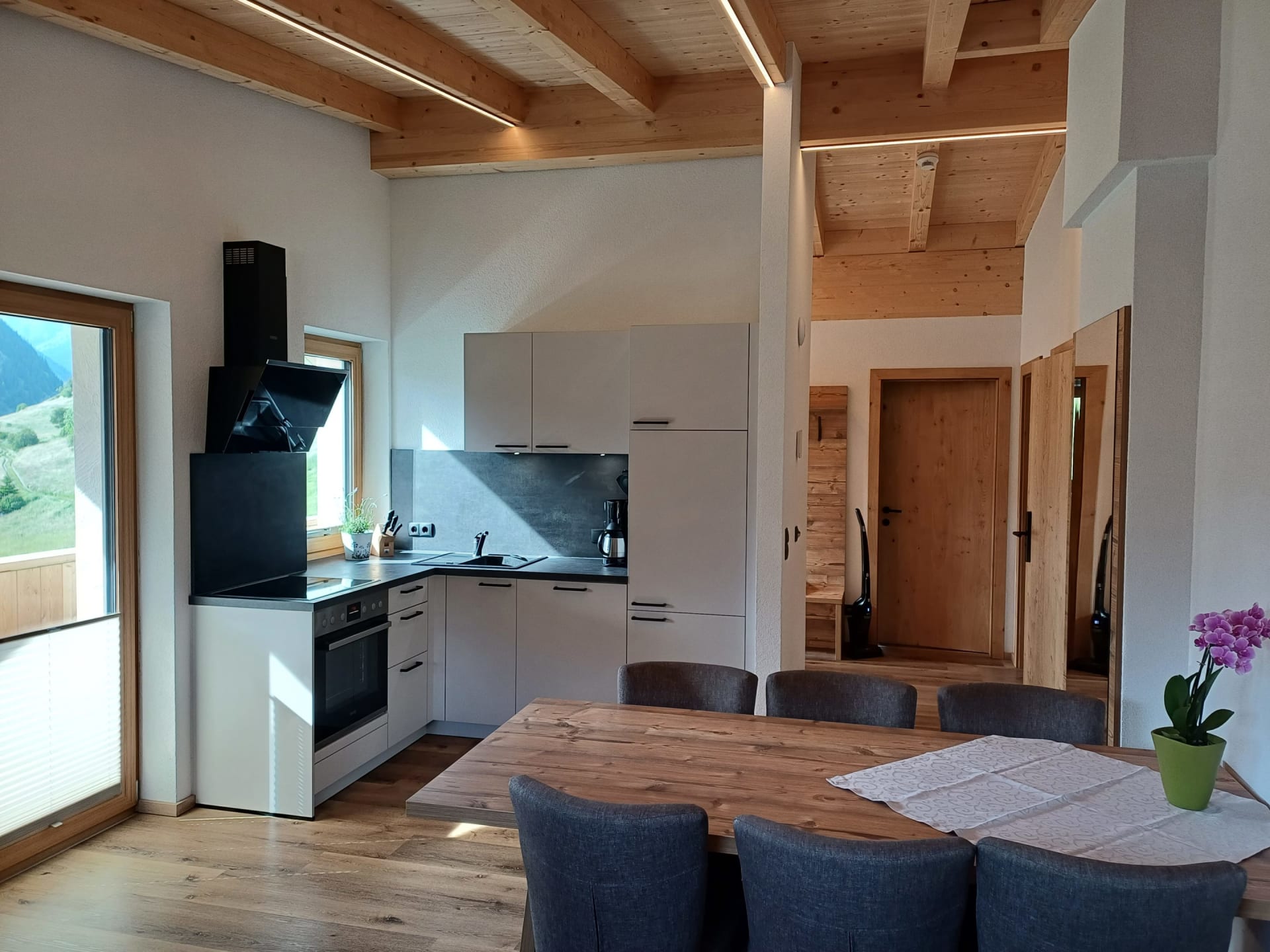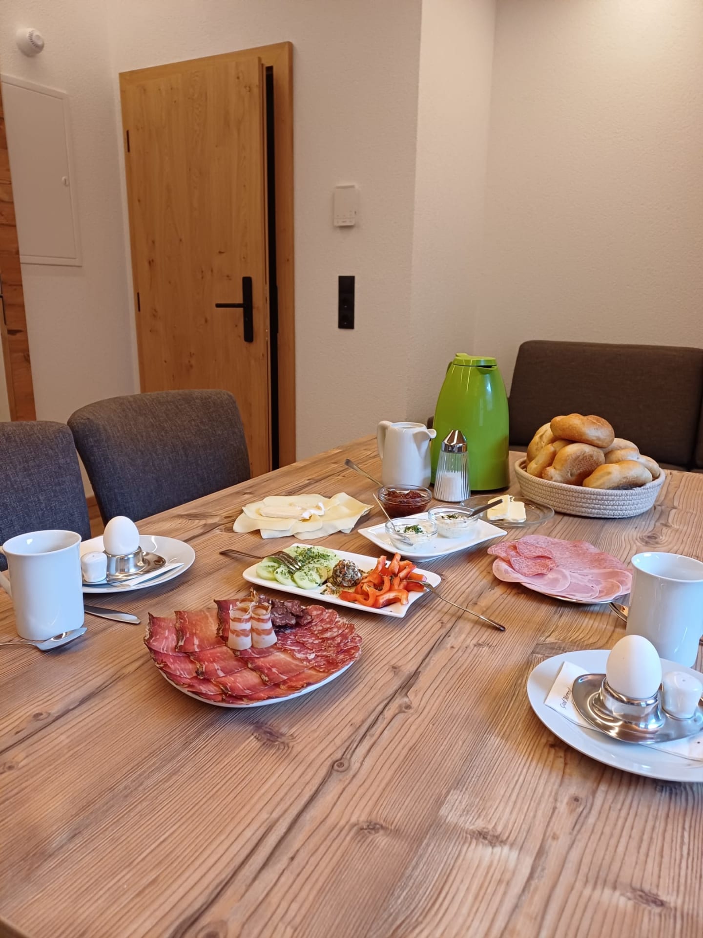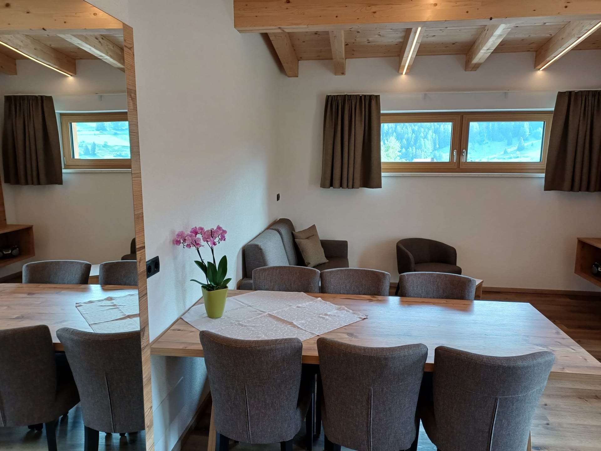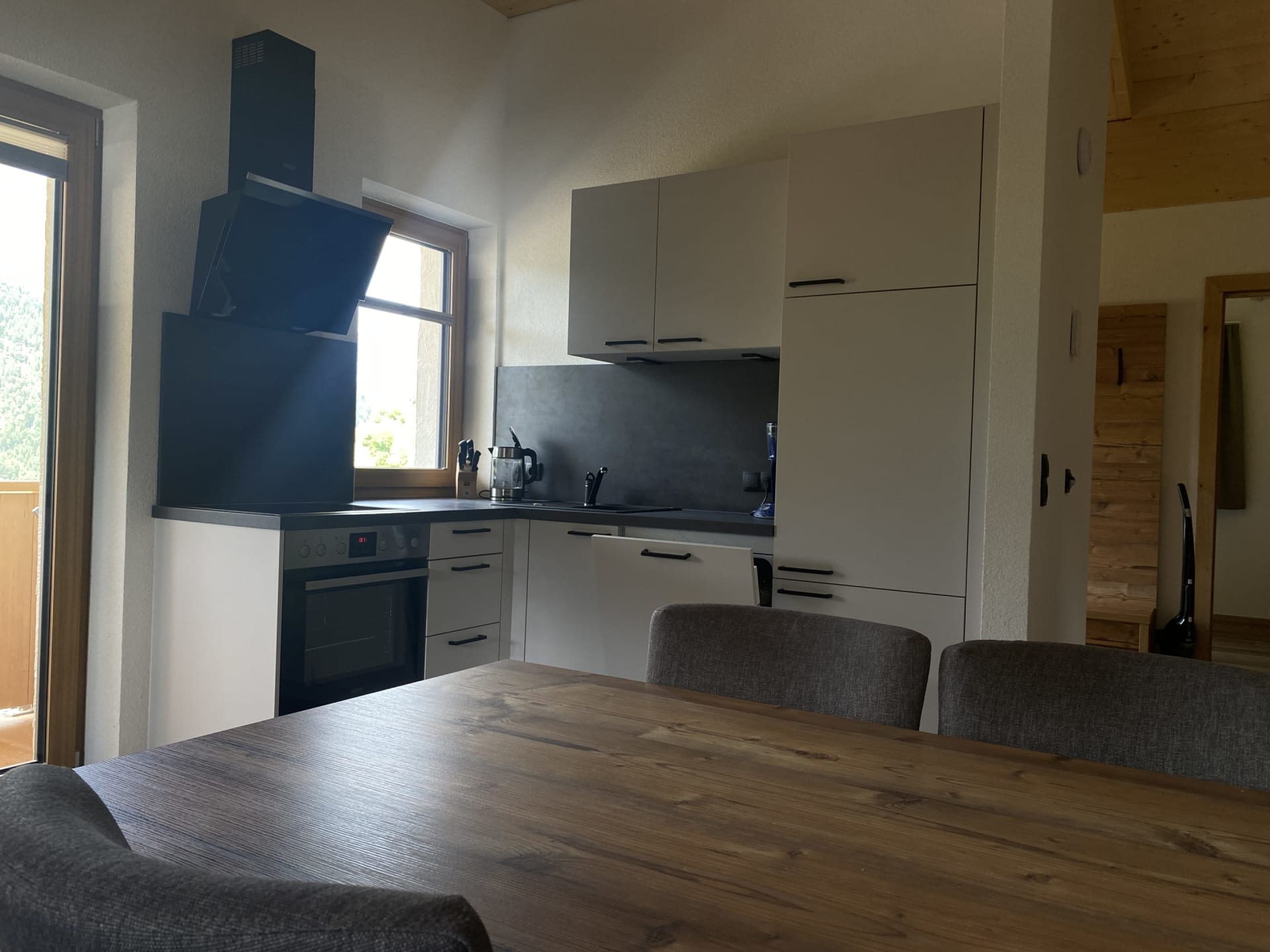 Die Ferienwohnung Engadin befindet sich zwar noch immer im dritten Stock – doch ansonsten ist sie kaum wiederzuerkennen. Ein offener Sichtdachstuhl aus hellem Fichtenholz verleiht den Räumen eine freundliche, großzügige Atmosphäre. Neue Möbel, ein großer Esstisch, bequeme Stühle und viel Platz zum Durchatmen lassen das Urlaubsherz höherschlagen.