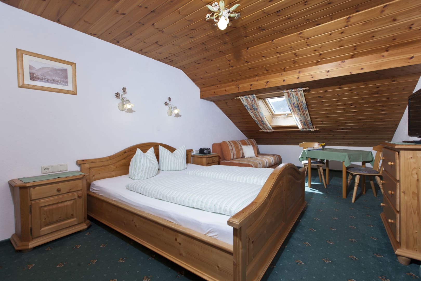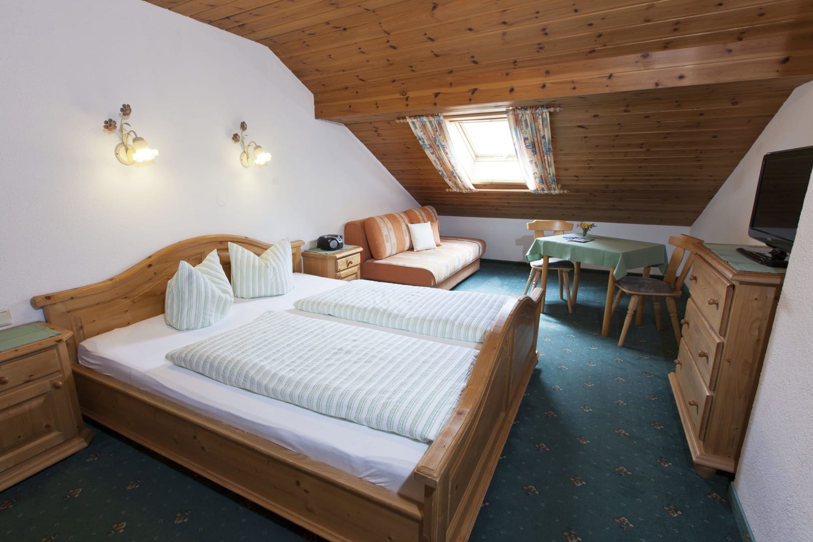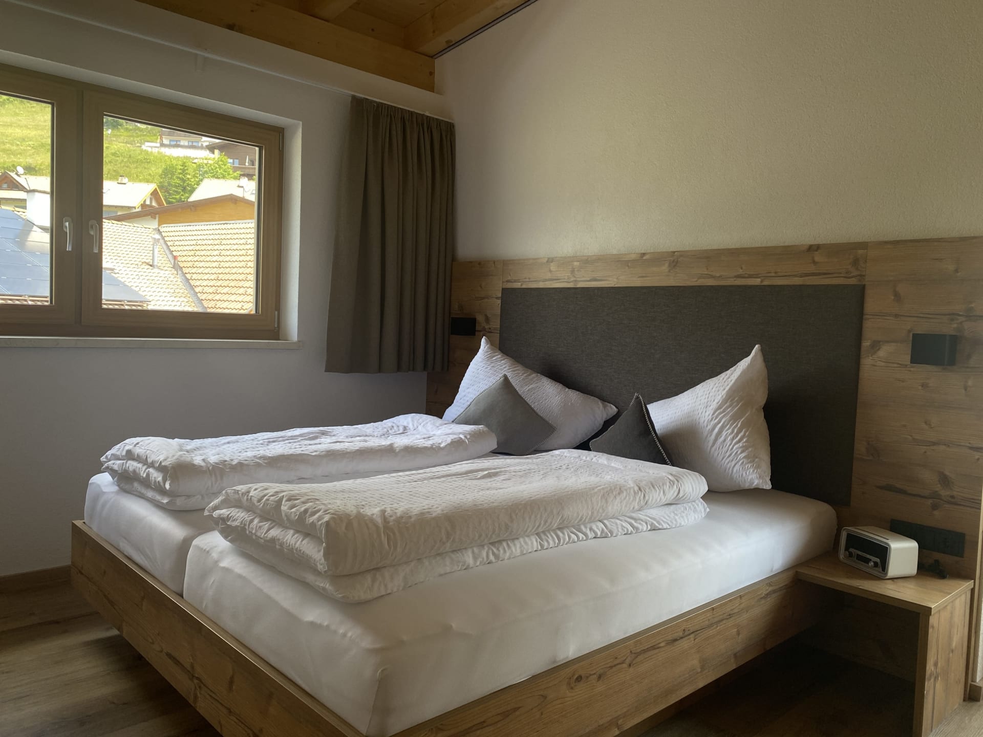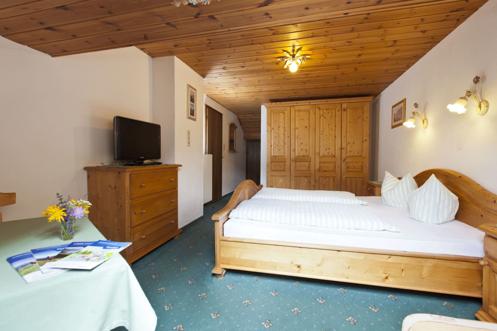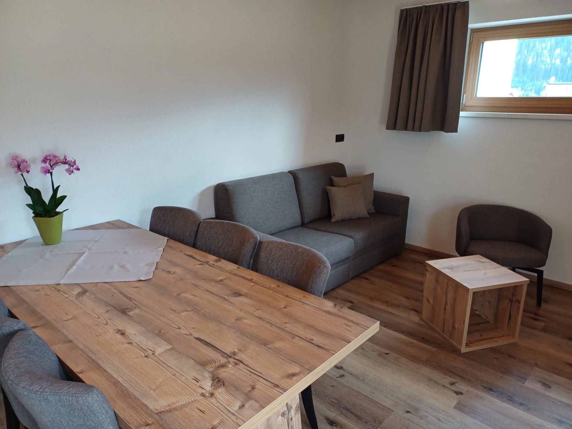 Die Ferienwohnung Engadin befindet sich zwar noch immer im dritten Stock – doch ansonsten ist sie kaum wiederzuerkennen. Ein offener Sichtdachstuhl aus hellem Fichtenholz verleiht den Räumen eine freundliche, großzügige Atmosphäre. Neue Möbel, ein großer Esstisch, bequeme Stühle und viel Platz zum Durchatmen lassen das Urlaubsherz höherschlagen.