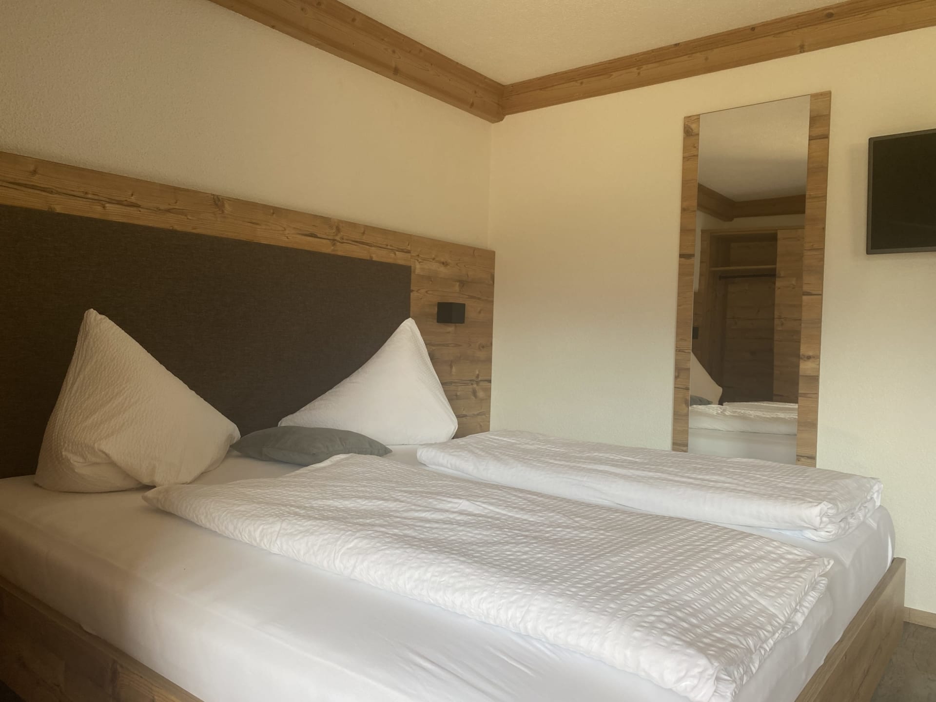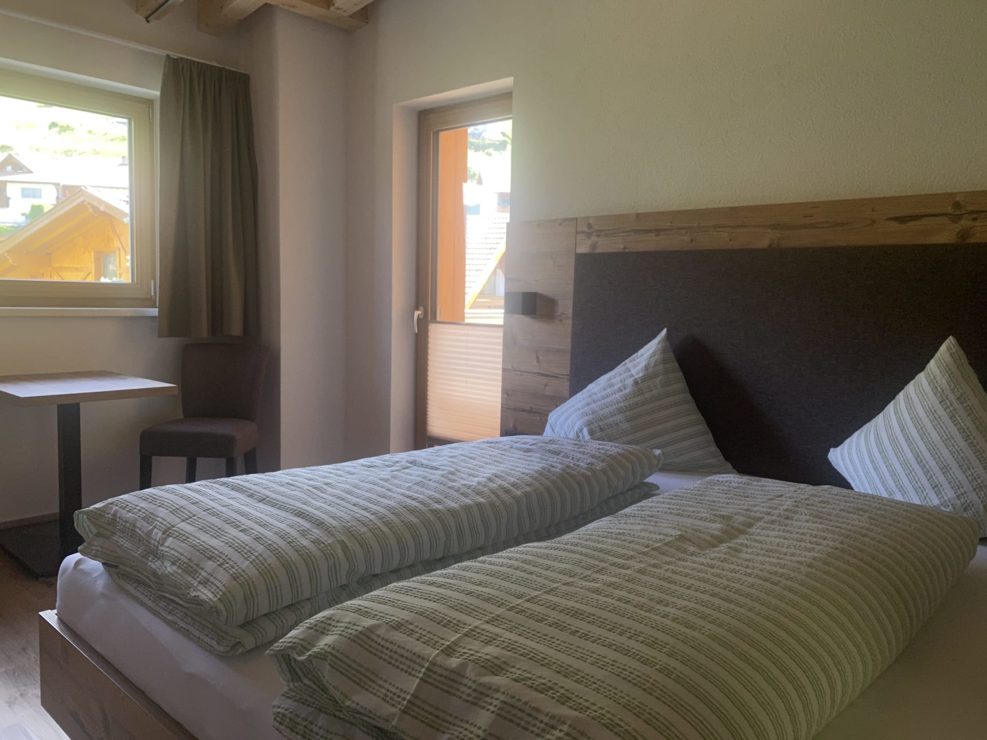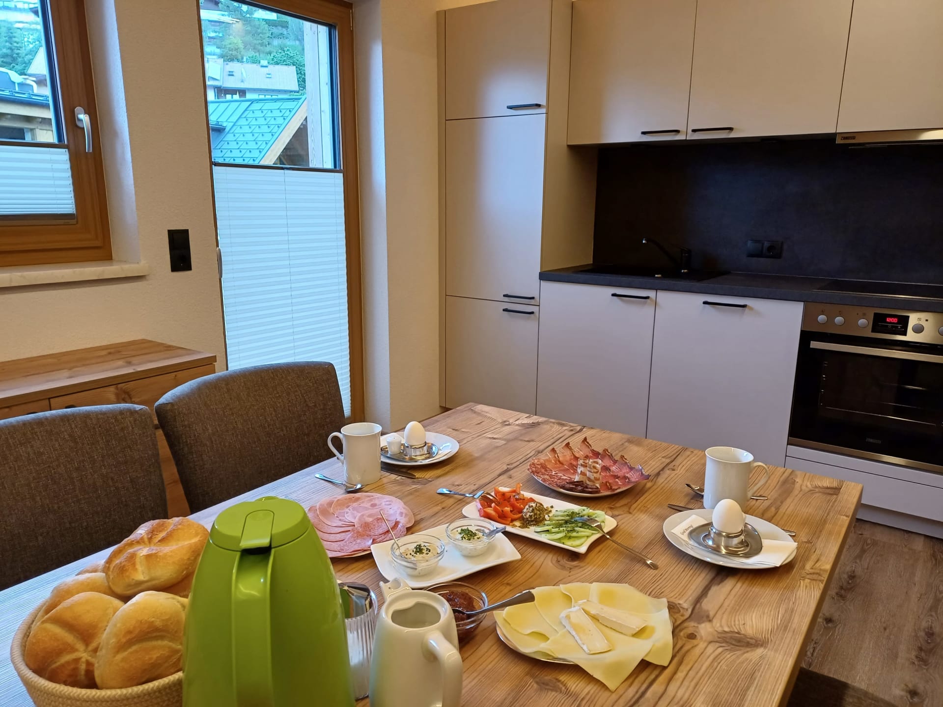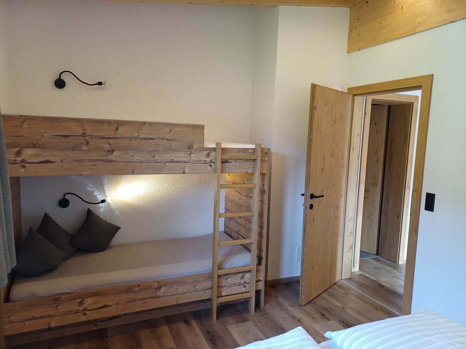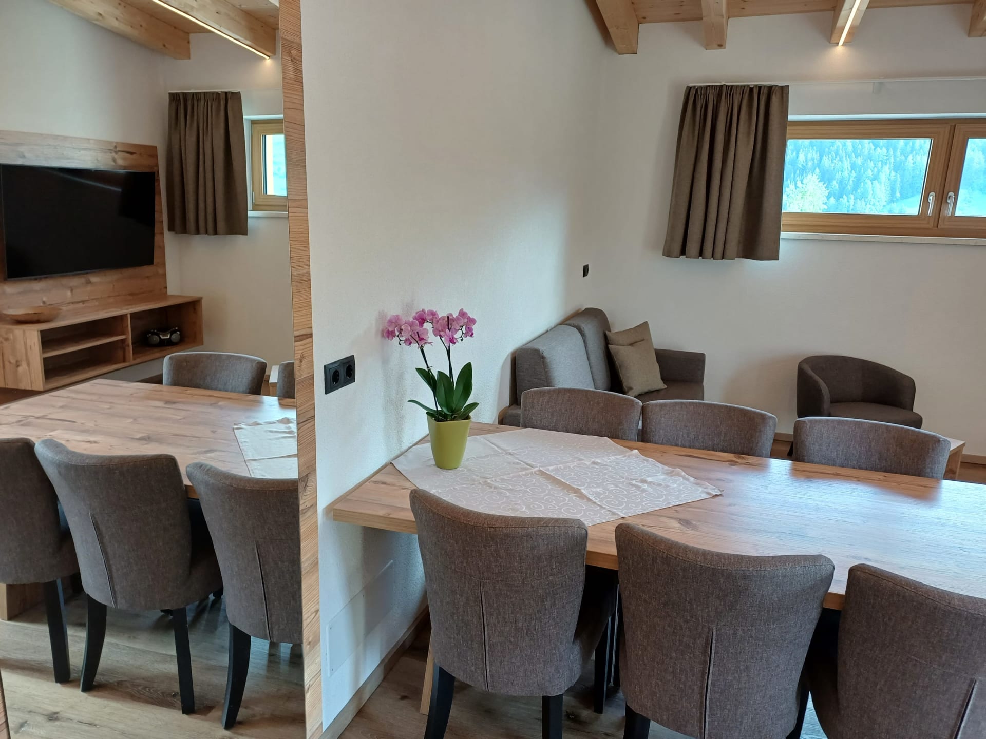 Die Ferienwohnung Engadin befindet sich zwar noch immer im dritten Stock – doch ansonsten ist sie kaum wiederzuerkennen. Ein offener Sichtdachstuhl aus hellem Fichtenholz verleiht den Räumen eine freundliche, großzügige Atmosphäre. Neue Möbel, ein großer Esstisch, bequeme Stühle und viel Platz zum Durchatmen lassen das Urlaubsherz höherschlagen.