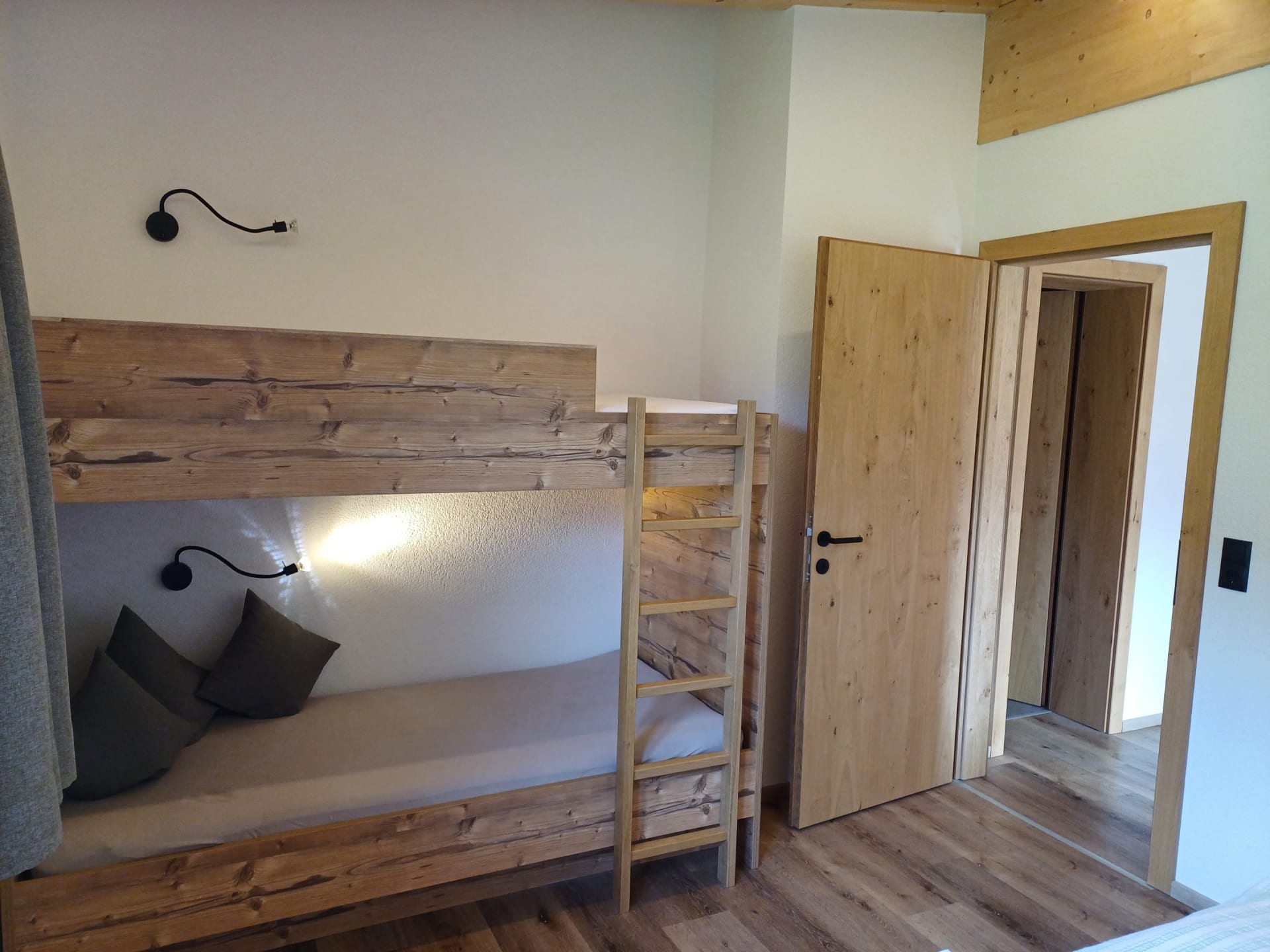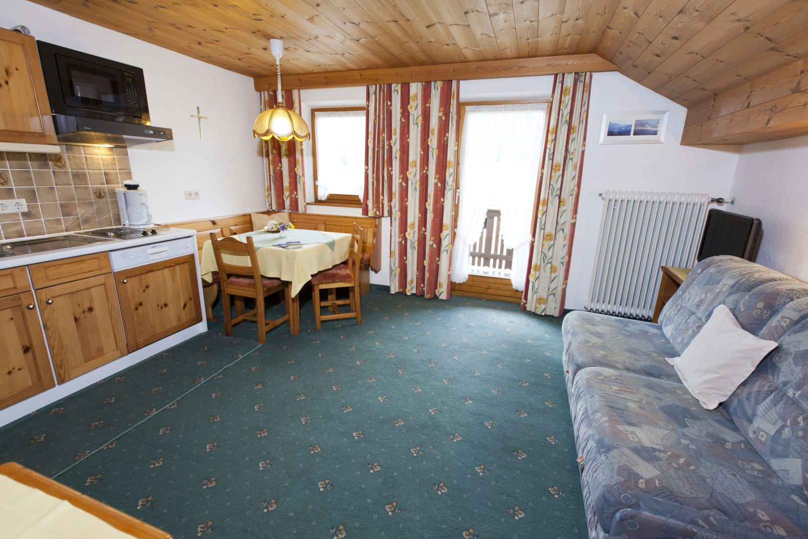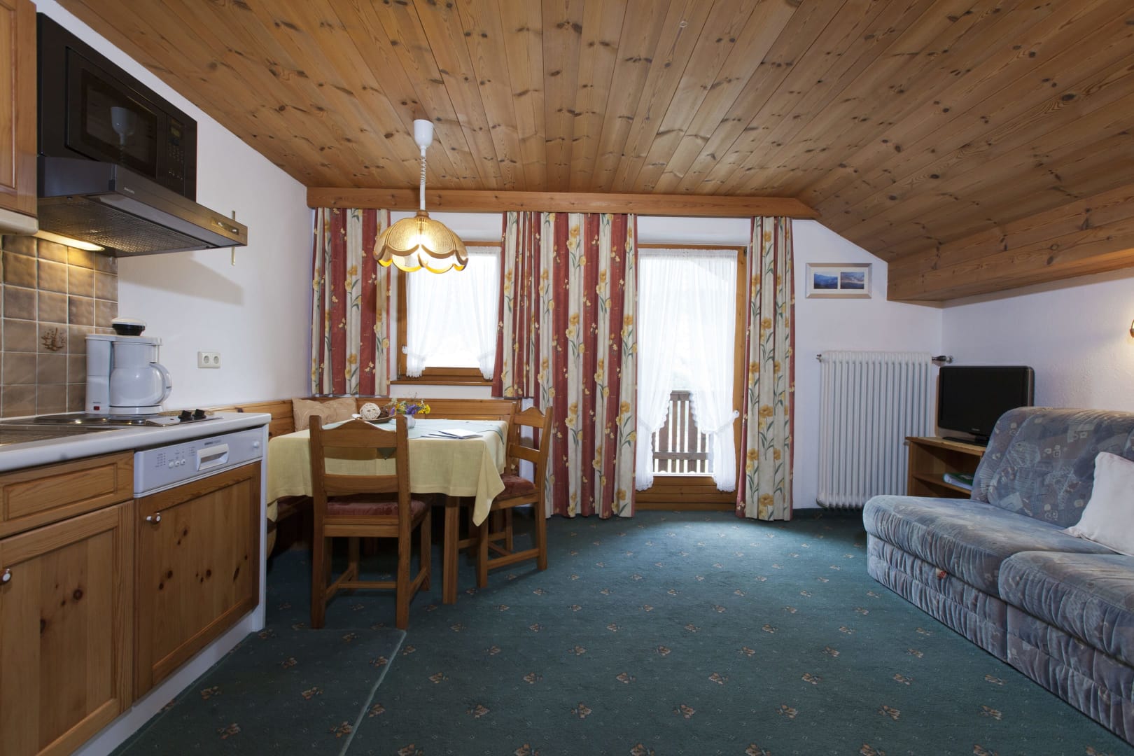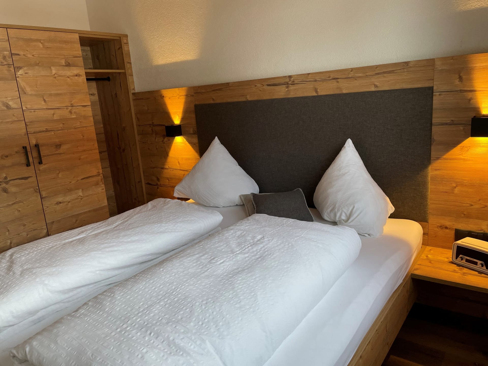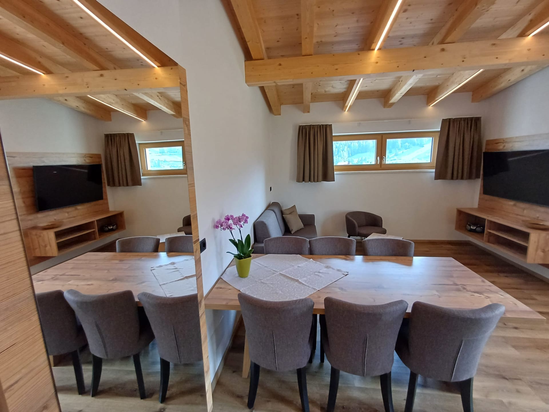 Die Ferienwohnung Engadin befindet sich zwar noch immer im dritten Stock – doch ansonsten ist sie kaum wiederzuerkennen. Ein offener Sichtdachstuhl aus hellem Fichtenholz verleiht den Räumen eine freundliche, großzügige Atmosphäre. Neue Möbel, ein großer Esstisch, bequeme Stühle und viel Platz zum Durchatmen lassen das Urlaubsherz höherschlagen.