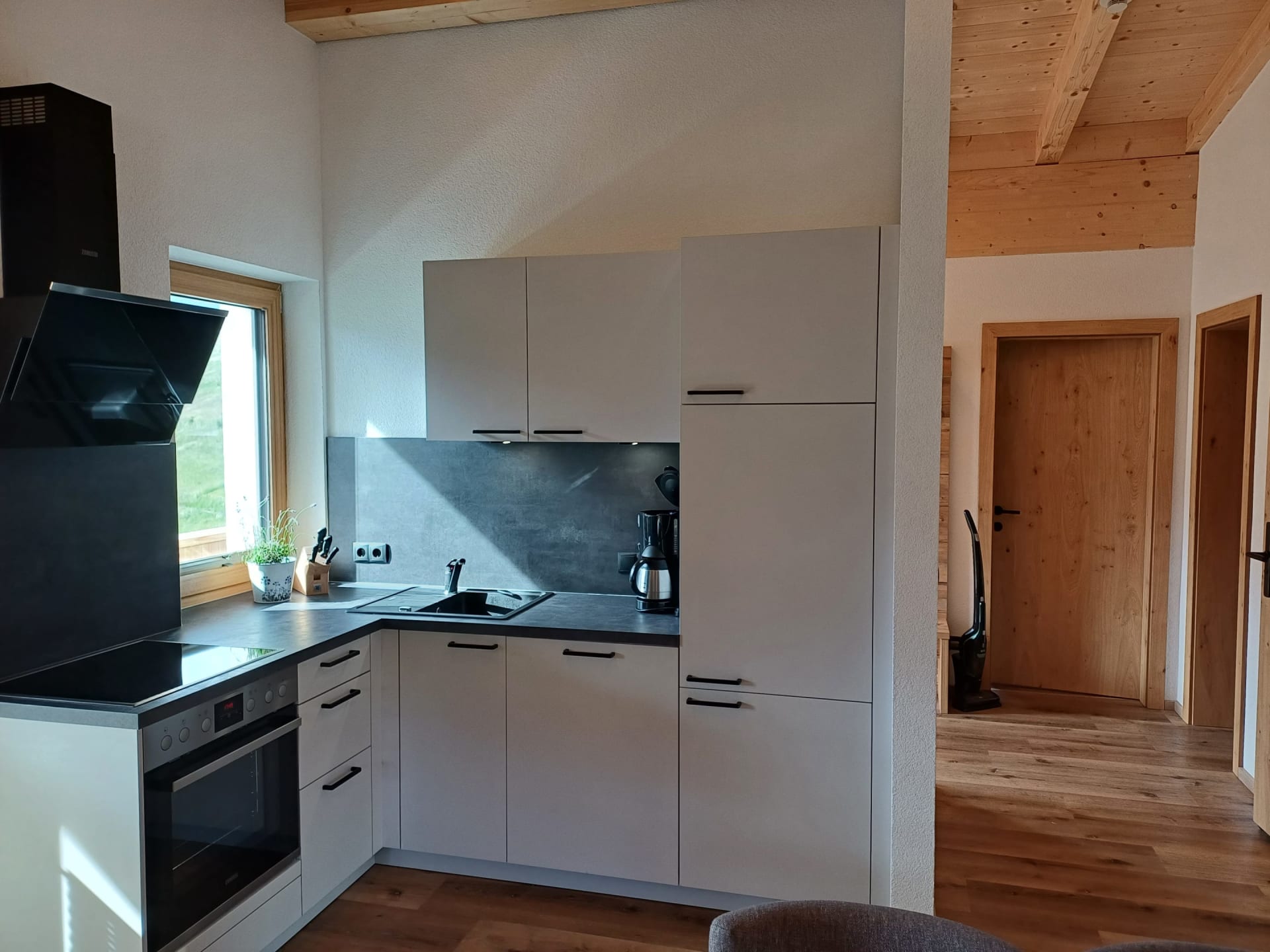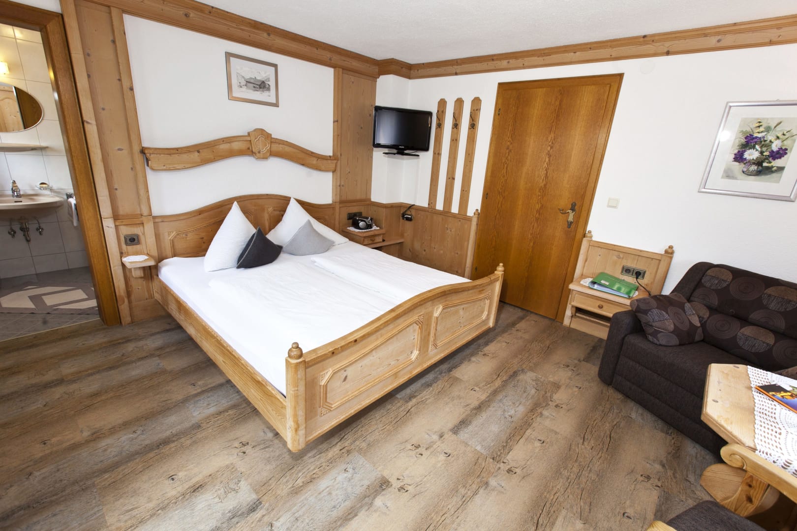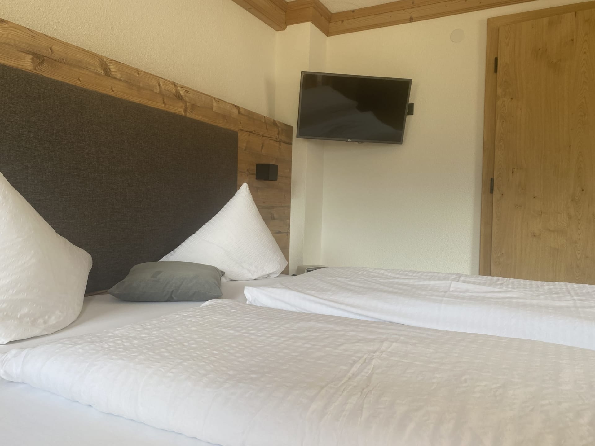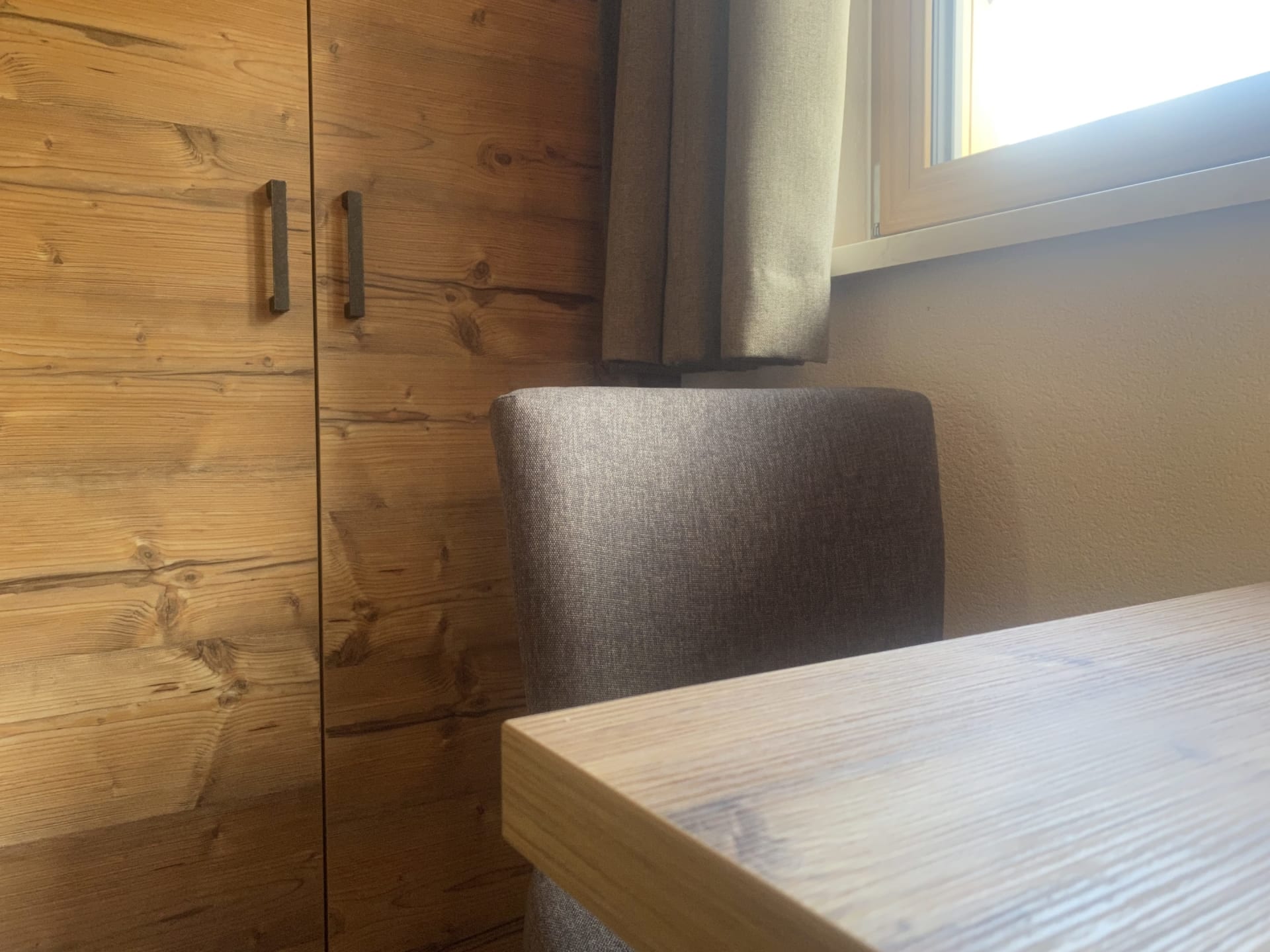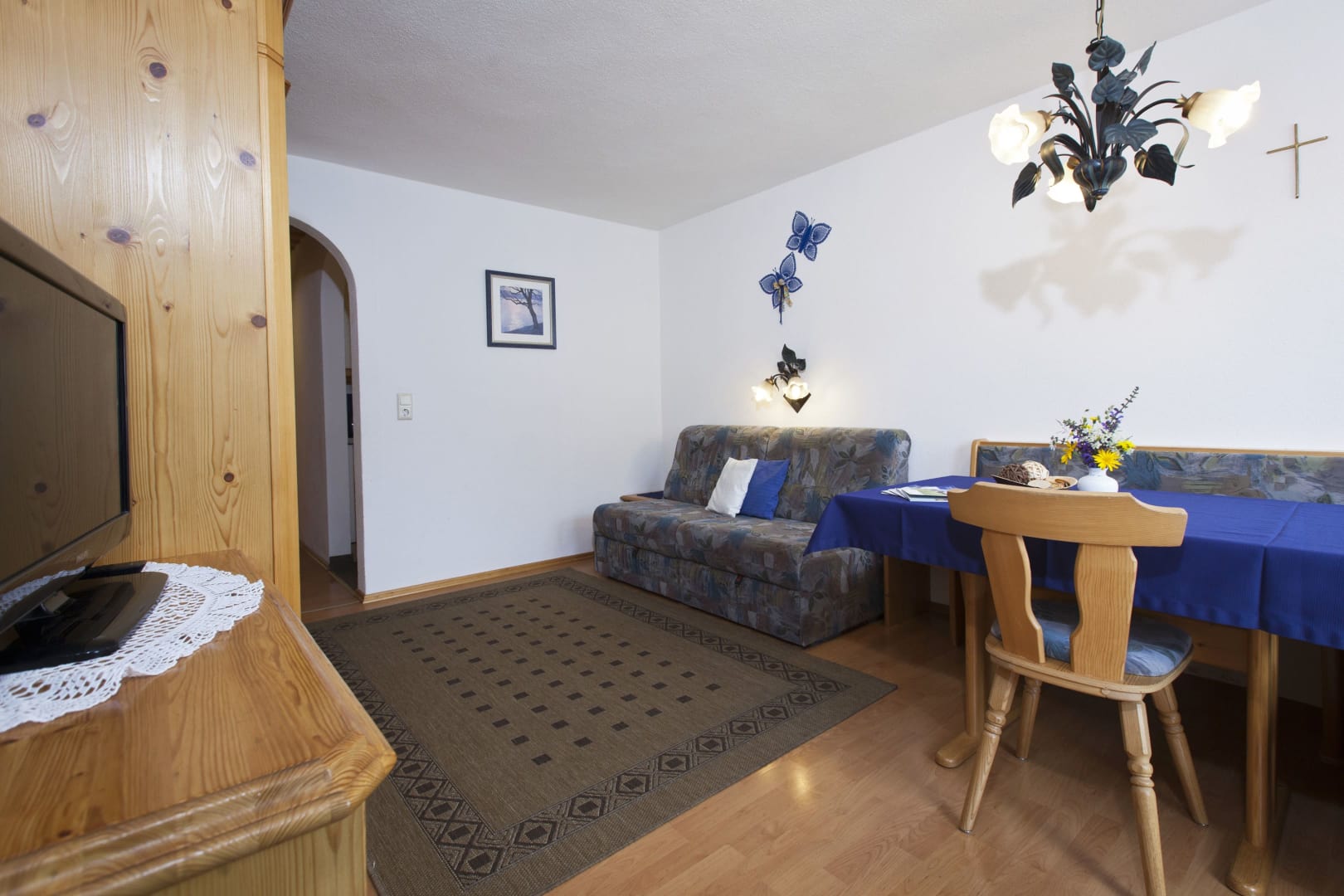 Die Ferienwohnung Engadin befindet sich zwar noch immer im dritten Stock – doch ansonsten ist sie kaum wiederzuerkennen. Ein offener Sichtdachstuhl aus hellem Fichtenholz verleiht den Räumen eine freundliche, großzügige Atmosphäre. Neue Möbel, ein großer Esstisch, bequeme Stühle und viel Platz zum Durchatmen lassen das Urlaubsherz höherschlagen.