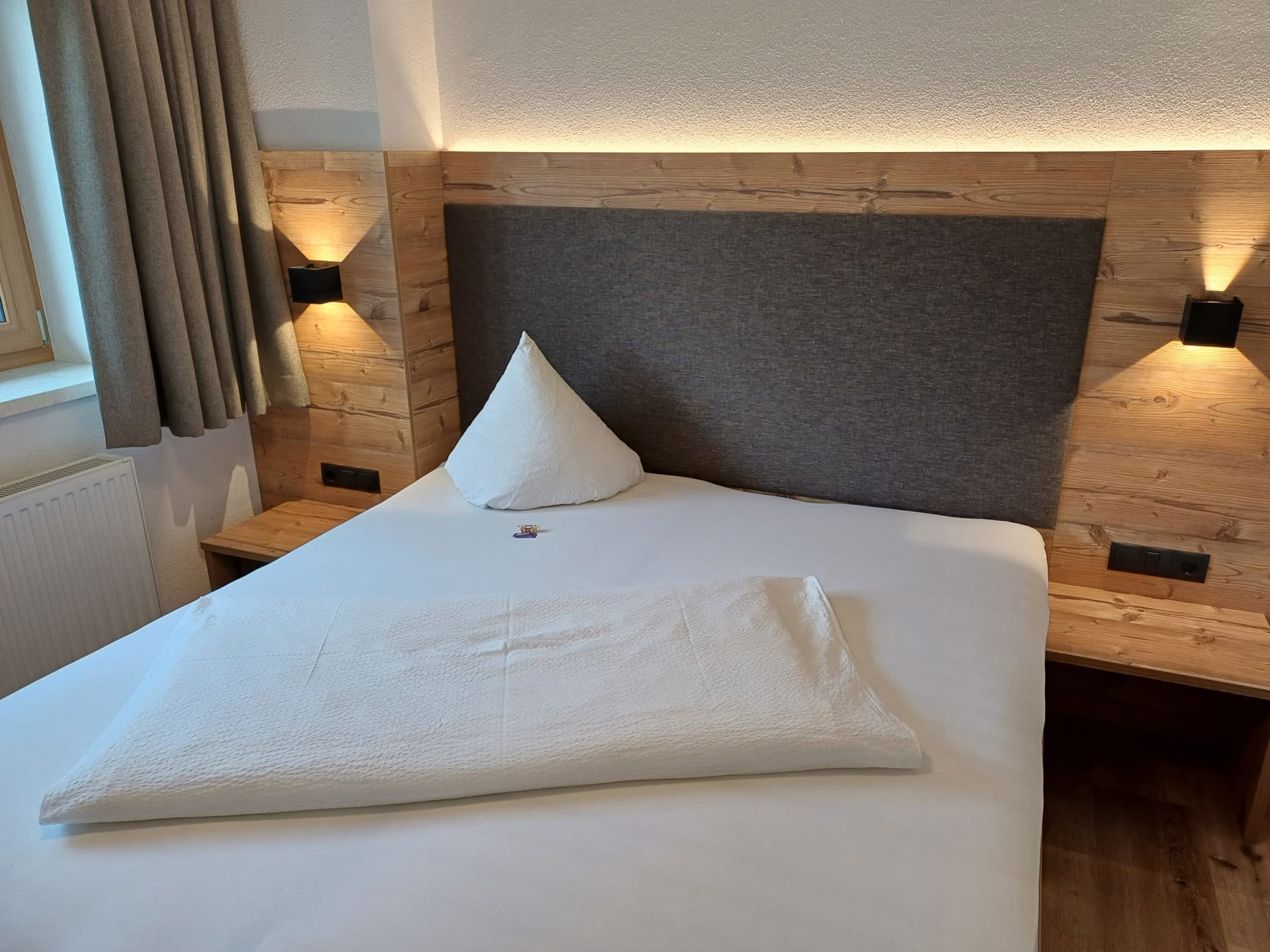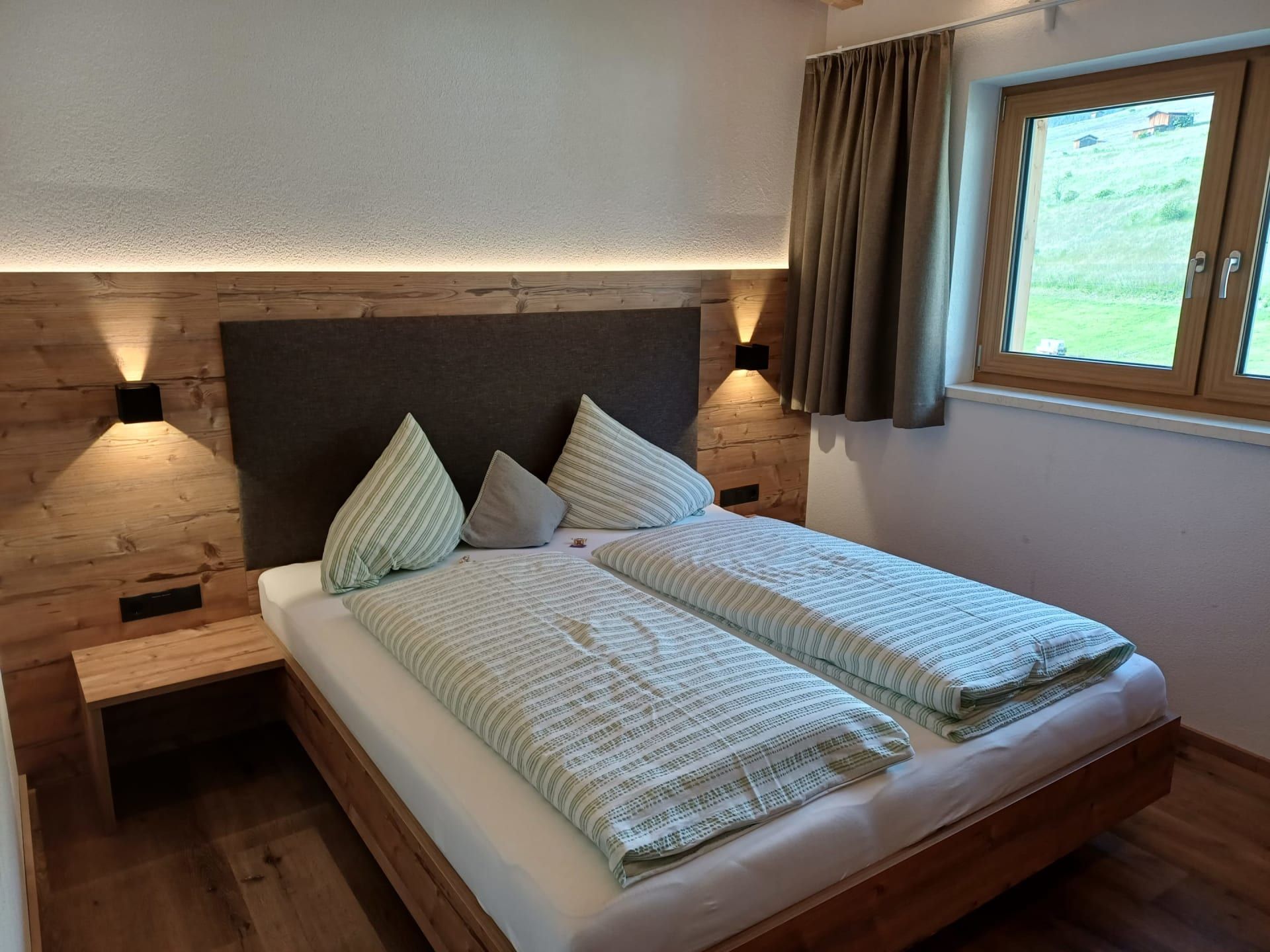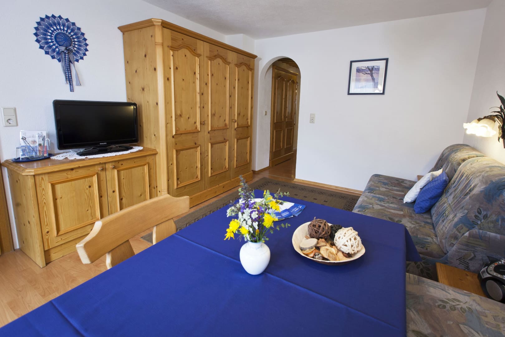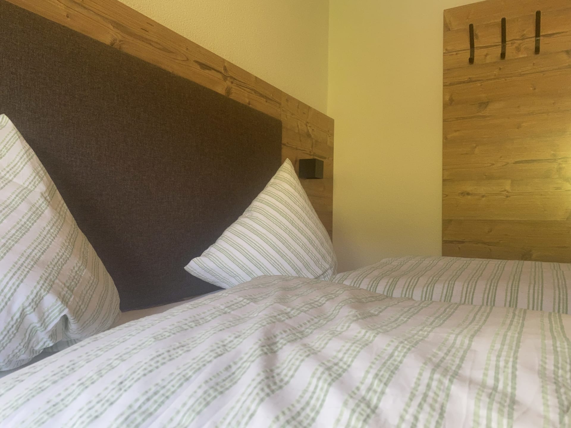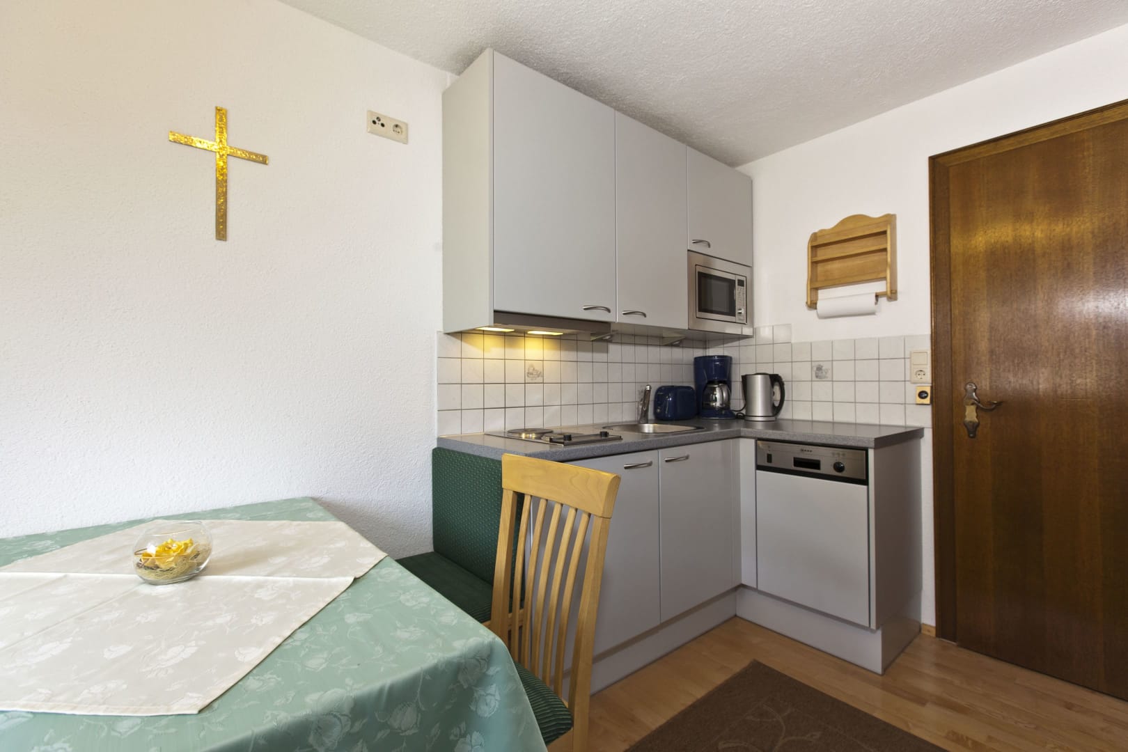 Die Ferienwohnung Engadin befindet sich zwar noch immer im dritten Stock – doch ansonsten ist sie kaum wiederzuerkennen. Ein offener Sichtdachstuhl aus hellem Fichtenholz verleiht den Räumen eine freundliche, großzügige Atmosphäre. Neue Möbel, ein großer Esstisch, bequeme Stühle und viel Platz zum Durchatmen lassen das Urlaubsherz höherschlagen.