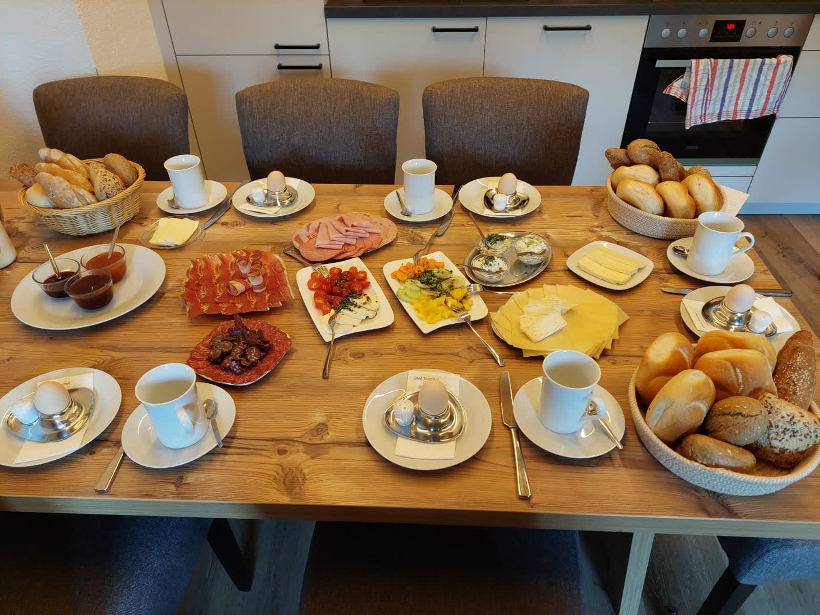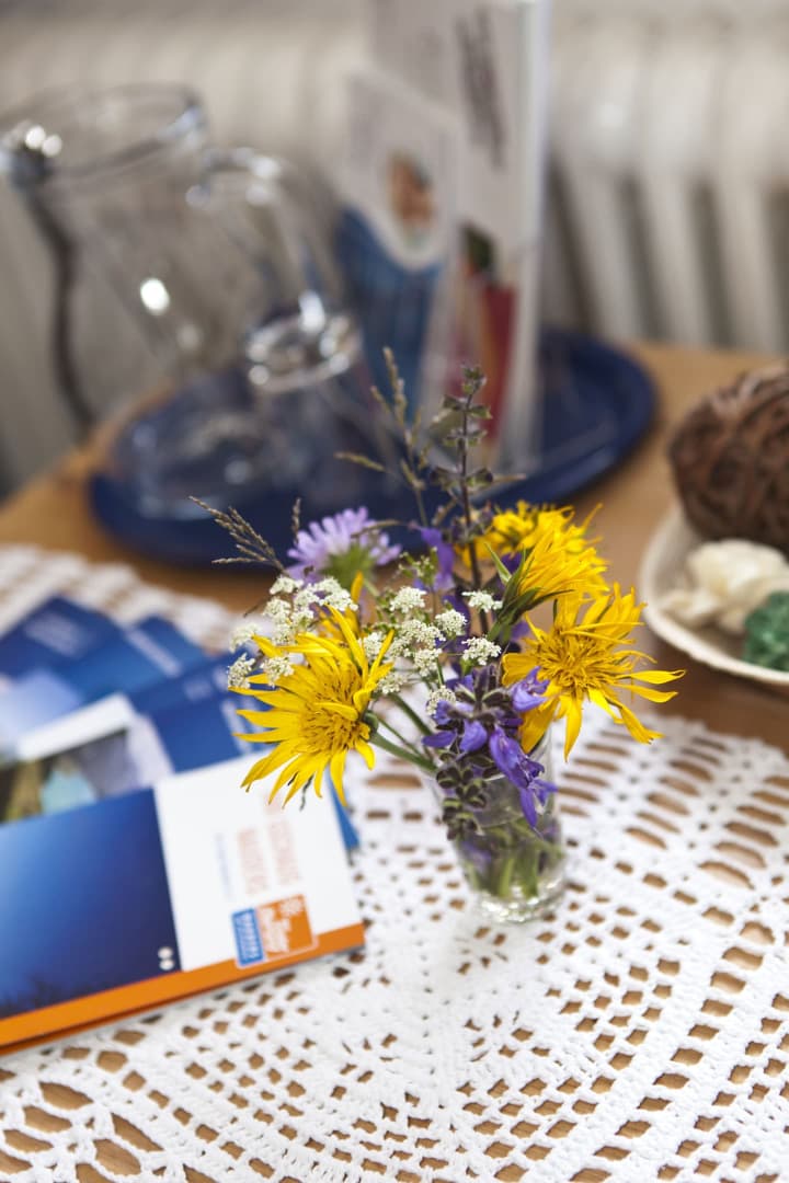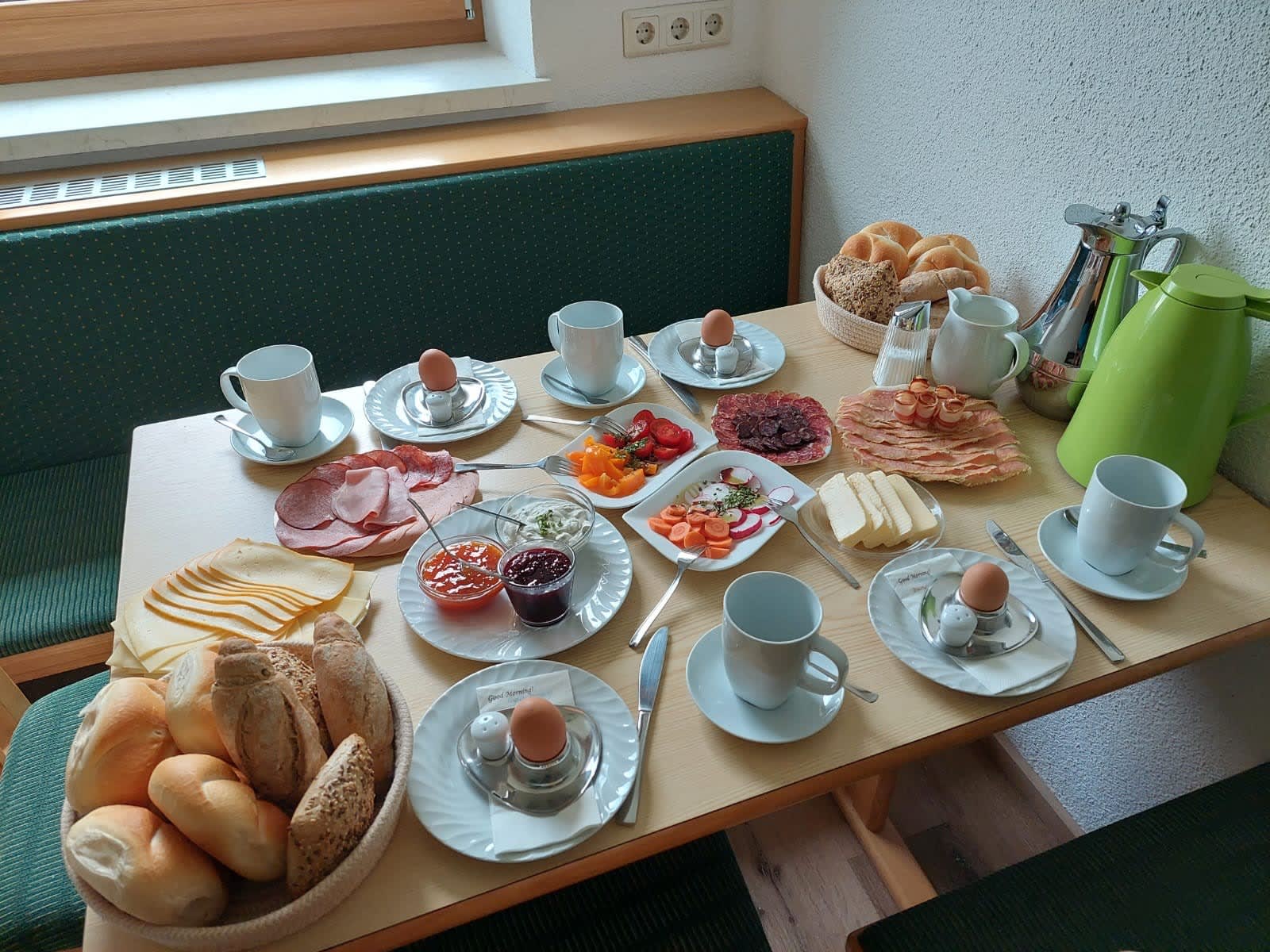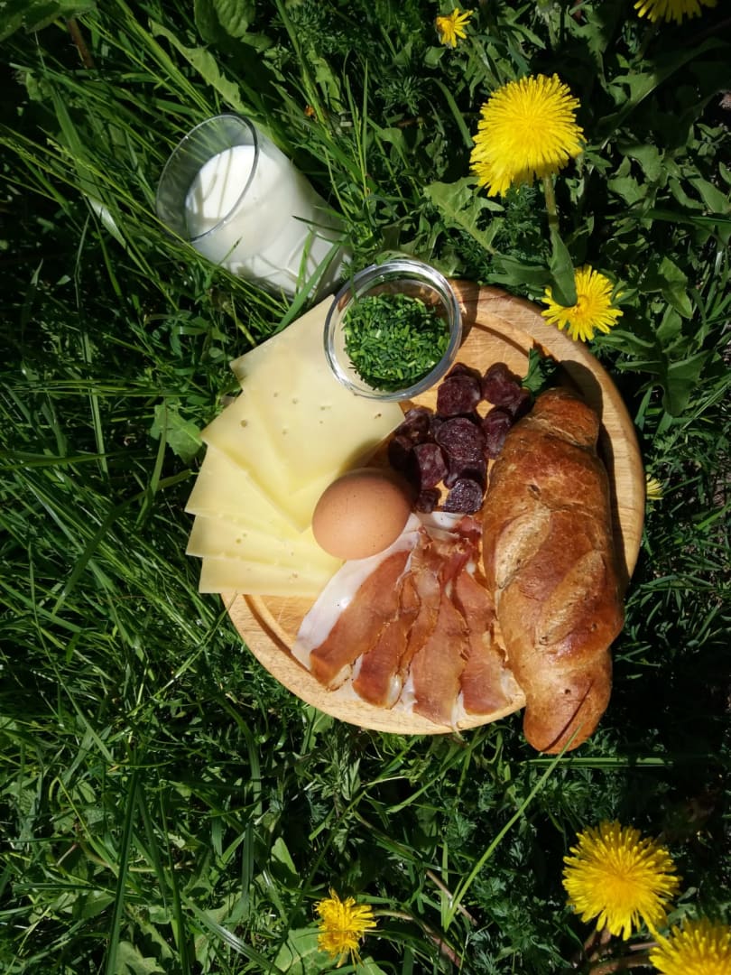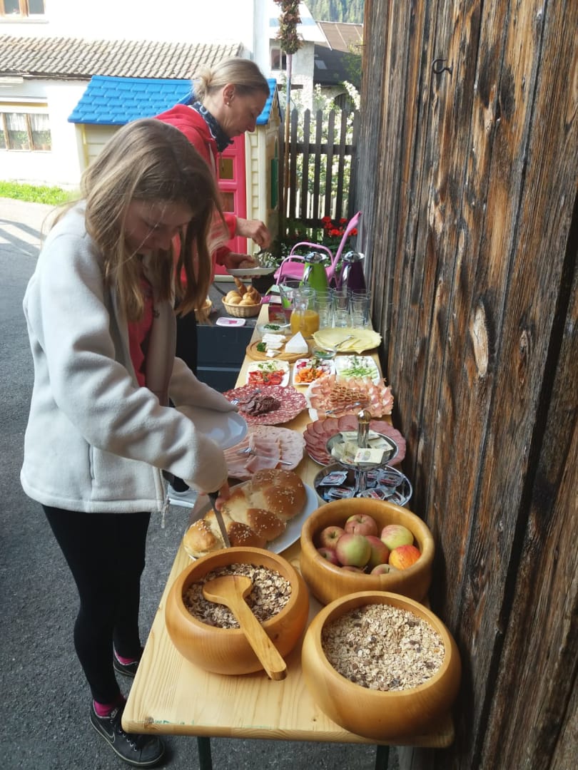 Sie werden mit Produkten und abwechslungsreichem Frühstücksbüffet verwöhnt. (Joghurt - Milch und Brötchenservice für alle) Verkauf von hofeig. Produkten, auch Naturprod.: Ringelblumen-, Arnikacreme u. Arnikatinktur.