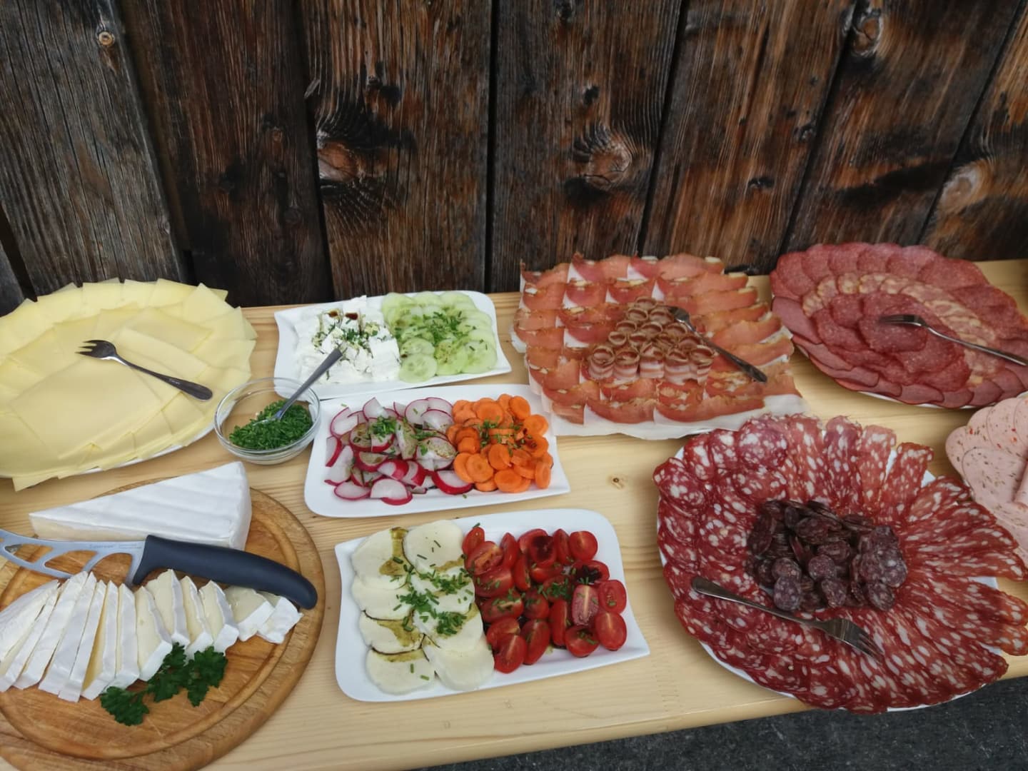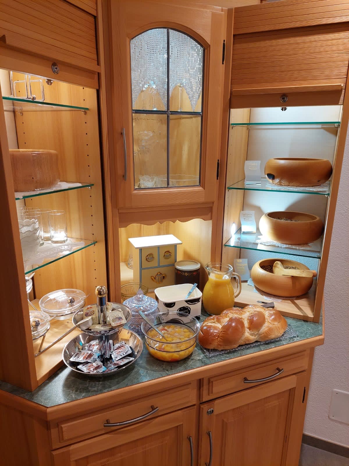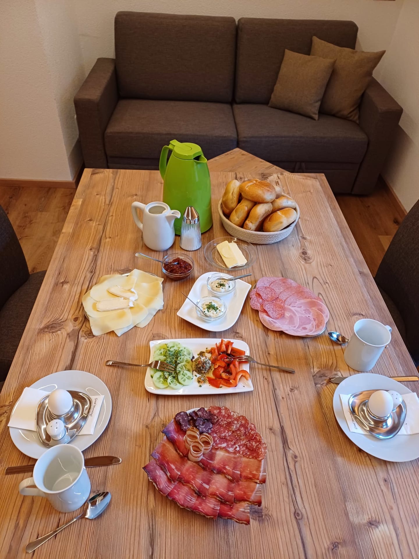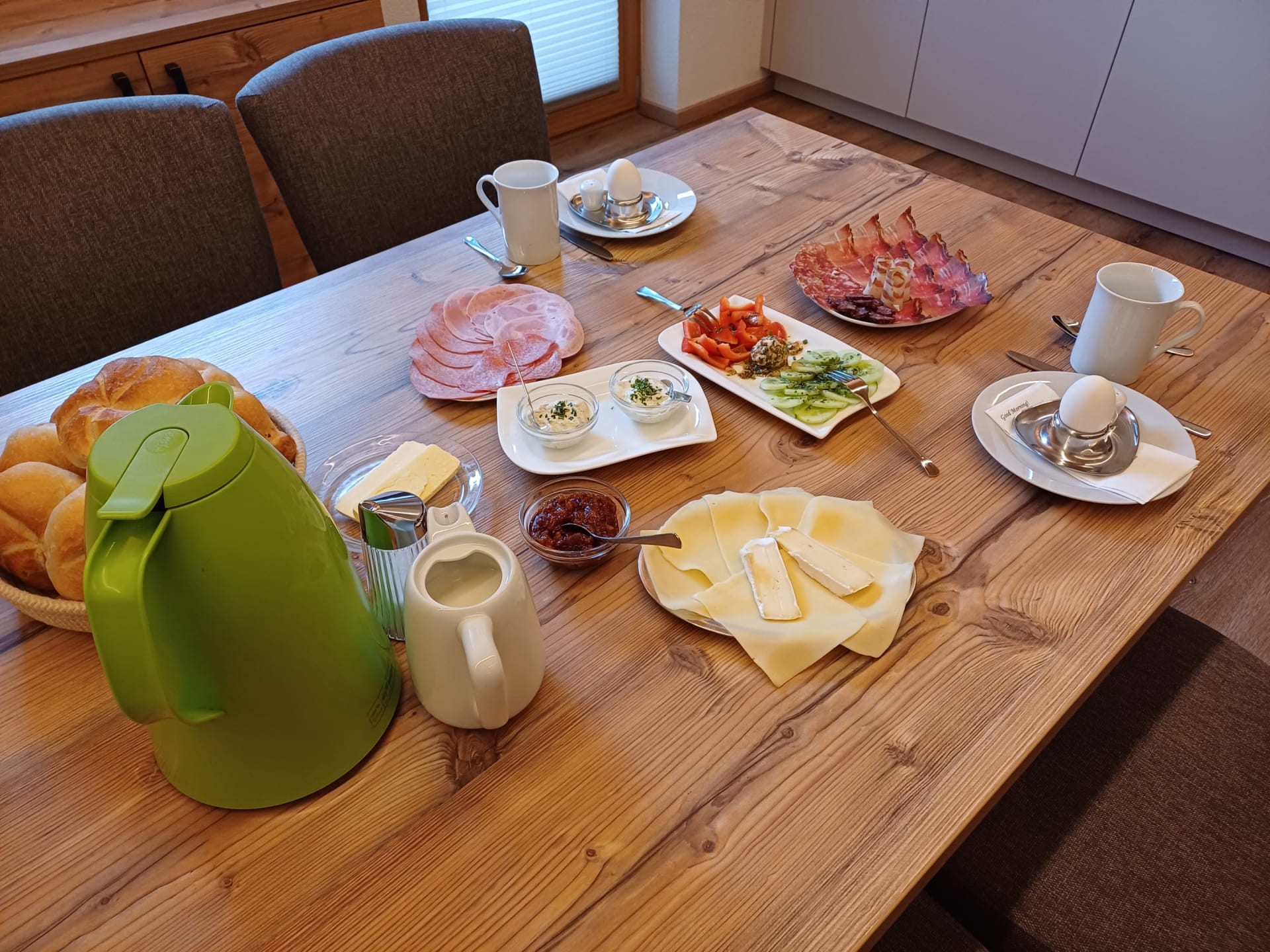 Sie werden mit Produkten und abwechslungsreichem Frühstücksbüffet verwöhnt. (Joghurt - Milch und Brötchenservice für alle) Verkauf von hofeig. Produkten, auch Naturprod.: Ringelblumen-, Arnikacreme u. Arnikatinktur.