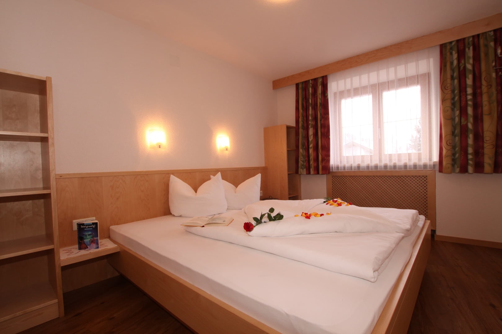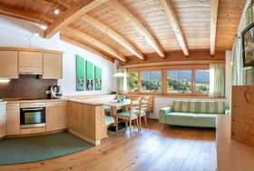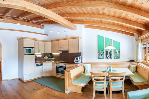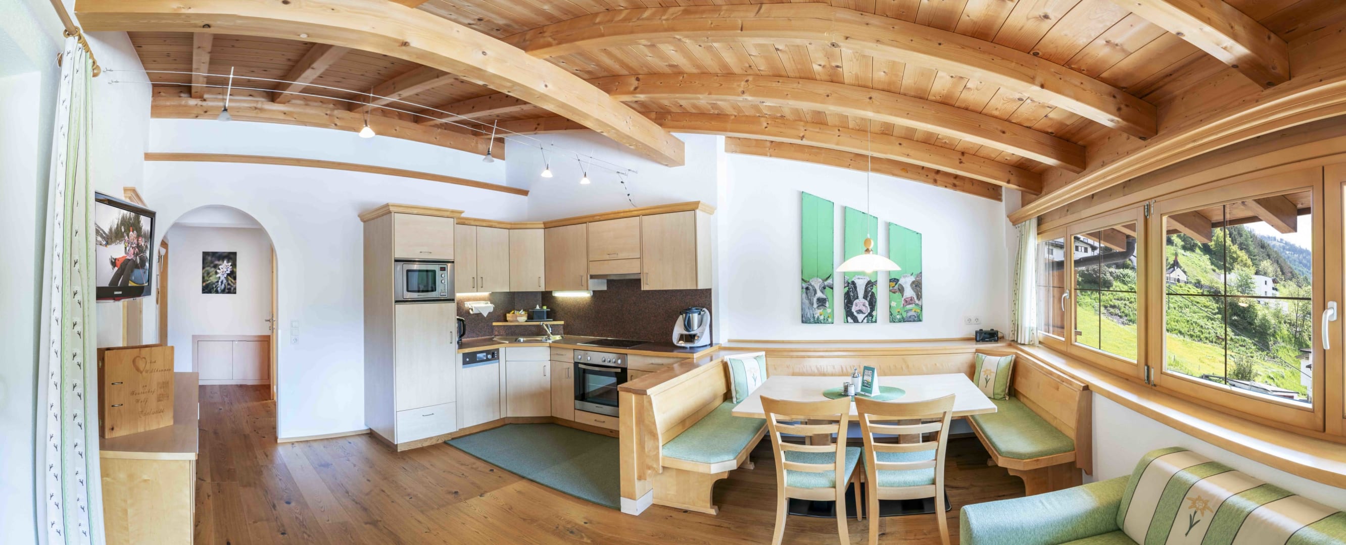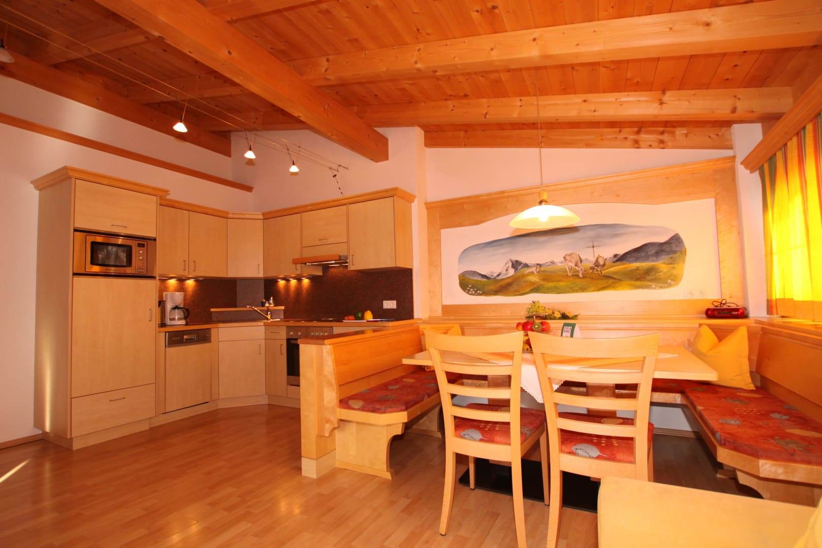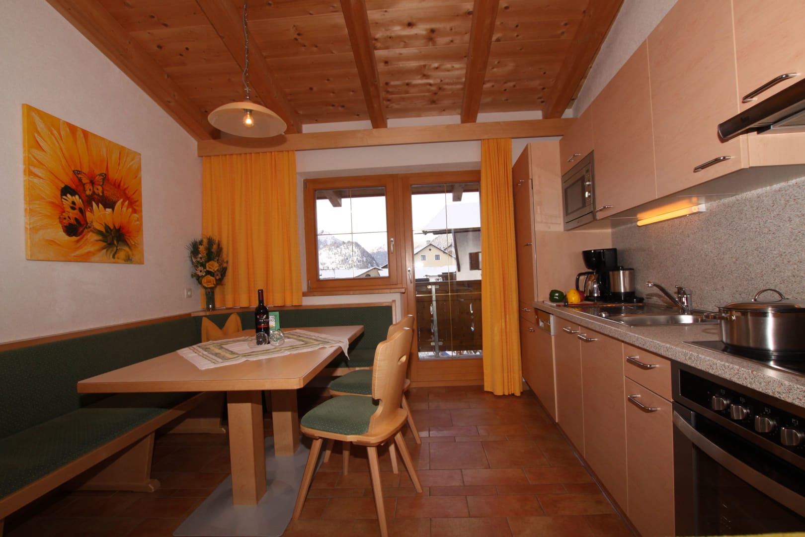 Willkommen in unserer super komfortablen und modernen Ferienwohnung, Ihrem idealen Rückzugsort für einen unvergesslichen Urlaub mit Bergpanorama. Auf großzügigen 85 m² bietet diese helle Nichtraucher-Wohnung Platz für 2 bis 6 Personen und verbindet stilvolles Design mit höchstem Wohnkomfort. Sie verfügt über zwei separate Schlafzimmer, die mit bequemen Doppelbetten sowie zwei zusätzlichen Einzelbetten ausgestattet sind, und somit flexible Schlafmöglichkeiten für bis zu 6 Personen bieten. Für zusätzlichen Komfort sorgen zwei Bäder mit Dusche und WC. Der große, gemütliche Wohnraum lädt mit einem geräumigen Esstisch, der Platz für mindestens 6 bis 8 Personen bietet, zu gemeinsamen Mahlzeiten und geselligen Abenden ein. Die sehr gut ausgestattete Küche lässt keine Wünsche offen und beinhaltet einen 4-Plattenherd, Backofen, Mikrowelle, Kühlschrank, Toaster, Thermomix, Wasserkocher und Radio sowie alle notwendigen Küchenutensilien. Genießen Sie zudem die frische Bergluft und das atemberaubende Bergpanorama von Ihrer 12 m² großen, überdachten Süd-Terrasse – der perfekte Ort für entspannte Stunden.  Ein Kinderbett kann bei Bedarf gerne bereitgestellt werden. Erleben Sie einen Urlaub, der keine Wünsche offenlässt!