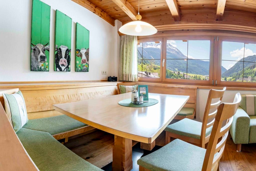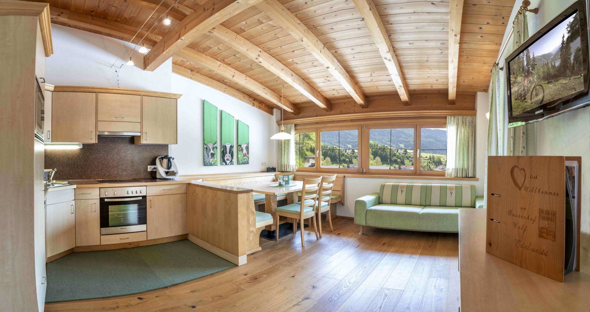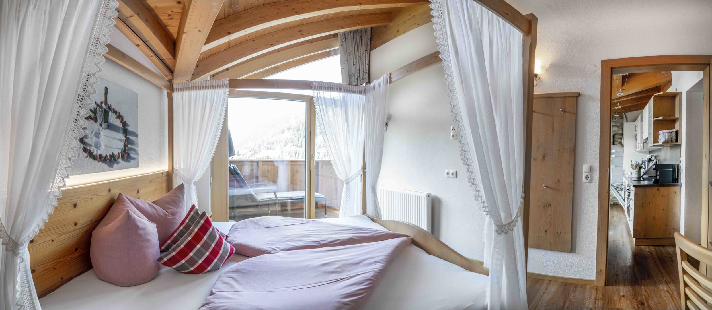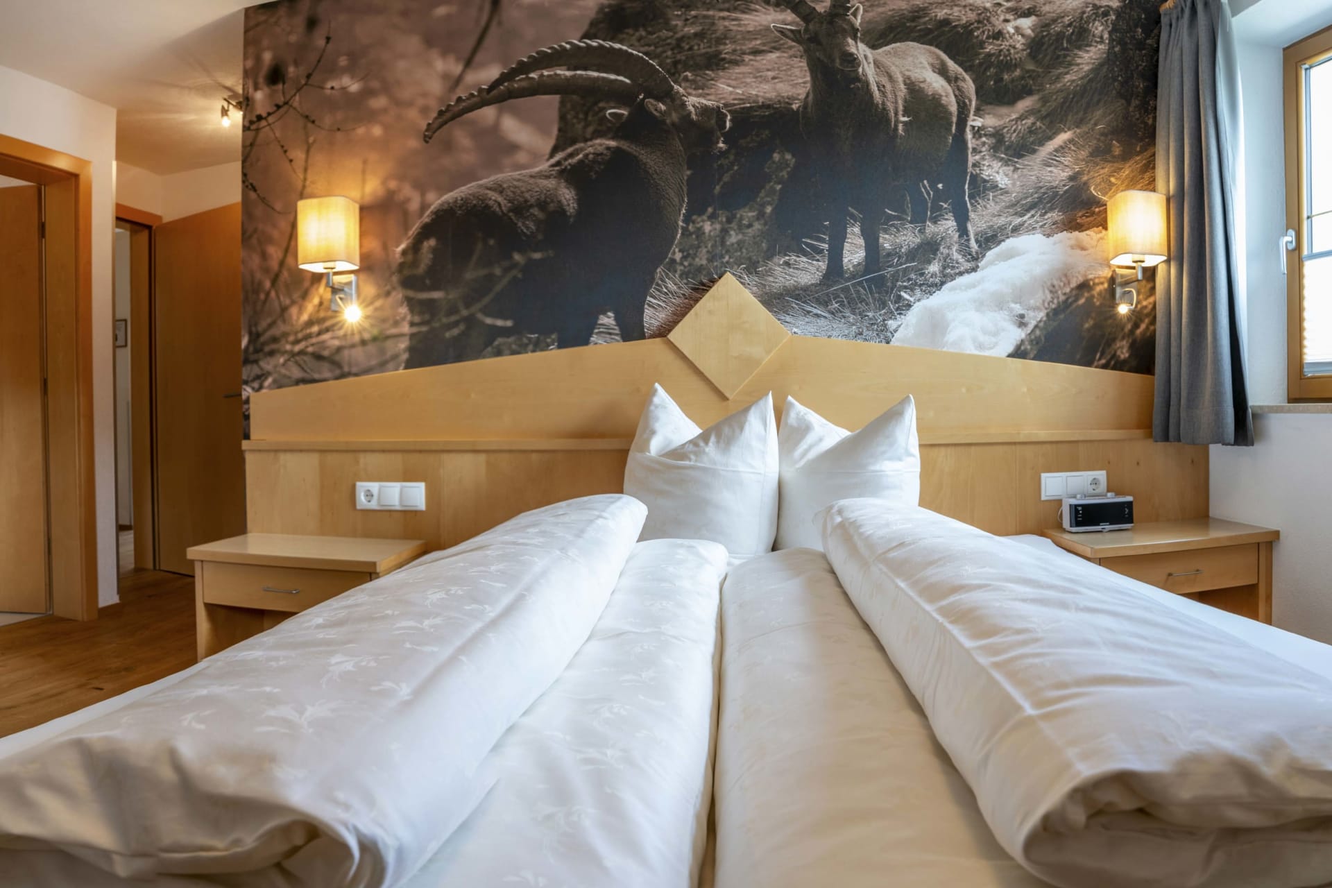 Willkommen in unserer super komfortablen und modernen Ferienwohnung, Ihrem idealen Rückzugsort für einen unvergesslichen Urlaub mit Bergpanorama. Auf großzügigen 85 m² bietet diese helle Nichtraucher-Wohnung Platz für 2 bis 6 Personen und verbindet stilvolles Design mit höchstem Wohnkomfort. Sie verfügt über zwei separate Schlafzimmer, die mit bequemen Doppelbetten sowie zwei zusätzlichen Einzelbetten ausgestattet sind, und somit flexible Schlafmöglichkeiten für bis zu 6 Personen bieten. Für zusätzlichen Komfort sorgen zwei Bäder mit Dusche und WC. Der große, gemütliche Wohnraum lädt mit einem geräumigen Esstisch, der Platz für mindestens 6 bis 8 Personen bietet, zu gemeinsamen Mahlzeiten und geselligen Abenden ein. Die sehr gut ausgestattete Küche lässt keine Wünsche offen und beinhaltet einen 4-Plattenherd, Backofen, Mikrowelle, Kühlschrank, Toaster, Thermomix, Wasserkocher und Radio sowie alle notwendigen Küchenutensilien. Genießen Sie zudem die frische Bergluft und das atemberaubende Bergpanorama von Ihrer 12 m² großen, überdachten Süd-Terrasse – der perfekte Ort für entspannte Stunden.  Ein Kinderbett kann bei Bedarf gerne bereitgestellt werden. Erleben Sie einen Urlaub, der keine Wünsche offenlässt!
