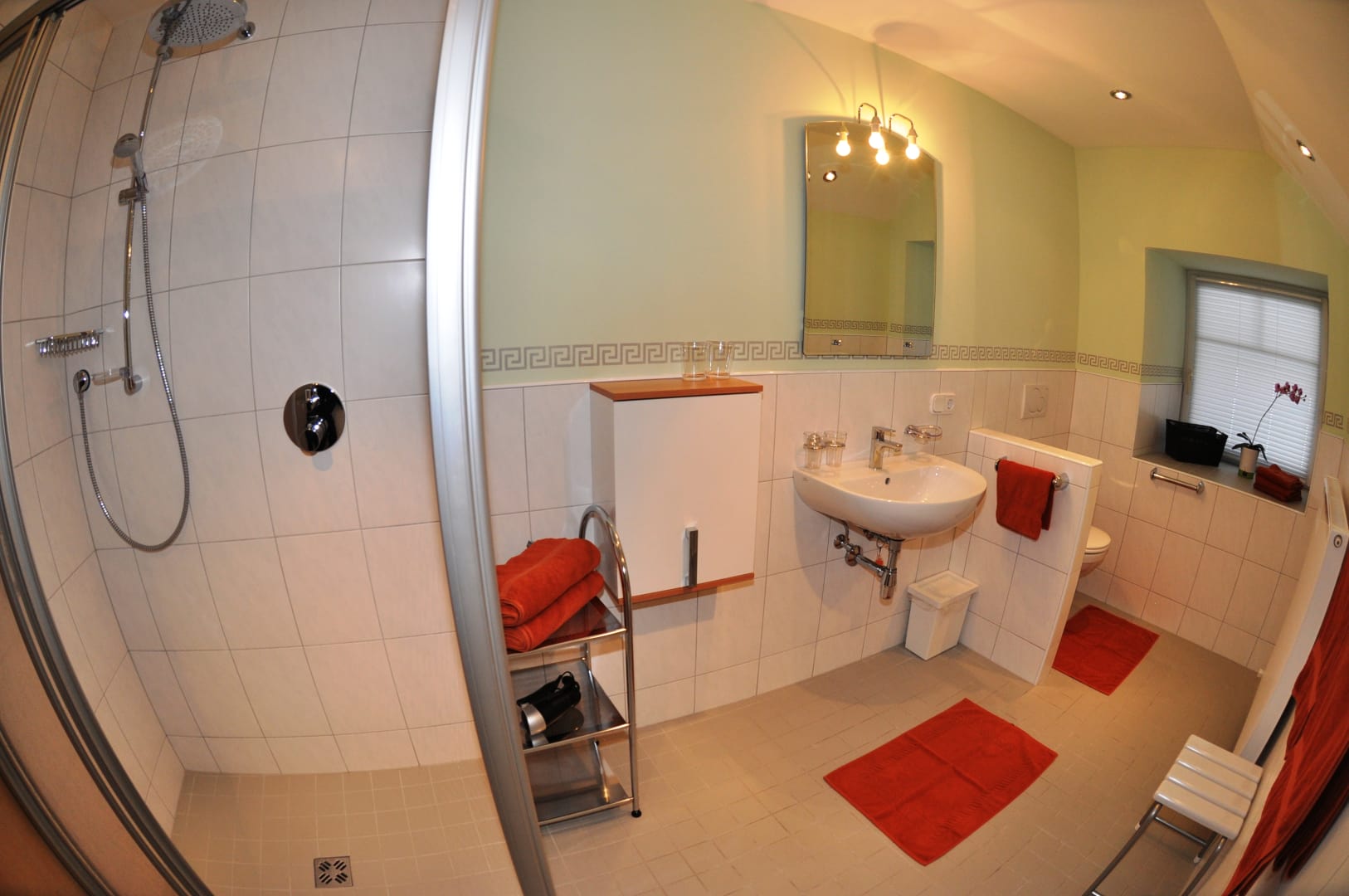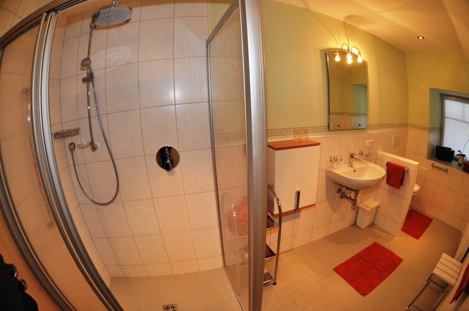 Unsere liebevolle eingerichtete Ferienwohnung besteht aus zwei getrennten Schlafzimmer. Das Wohnzimmer ist mit einer großen Ausziehcouch ausgestattet. Ebenfalls verfügt die Ferienwohnung über ein großes Bad mit WC und Dusche. Die Küche ist vollausgestattet mit einem Ceranfeld, Gefrierfach, Geschierspüler, Mikrowelle, einem großem Holztisch mit 6 Stühlen und einer Lesecouch. Ein GENUSS auf 80 Quadratmeter.