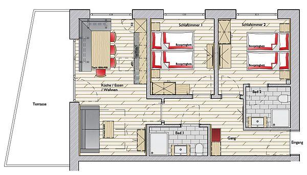 Es besteht aus 2 Doppelzimmern mit Boxspringbetten und 2 Badezimmer mit Dusche/WC. Vollausgestattete und moderne Wohnküche mit Elektroherd, Backofen, Kühlschrank/Gefrierfach, Kaffeemaschine, Geschirrspülmaschine, Mikrowelle, Toaster uvm. sowie einem gemütlichen Essbereich mit Sofa (Schlafmöglichkeit für die 5. und 6. Person). Größe ca. 60 m². Genießen Sie das herrliche Bergpanorama der Ötztaler Alpen auf der möblierten Terrasse.