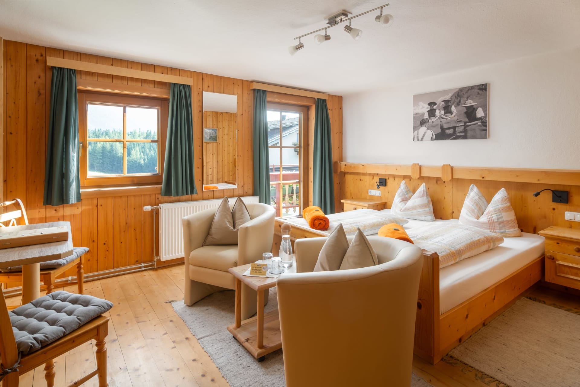 Im Zimmer Teischnitz die kostbarsten Augenblicke genießen. Die Düfte des Bauernhofes, die naturbelassenen Fichtenmöbel und der Holzfußboden lassen dich tief durchatmen.