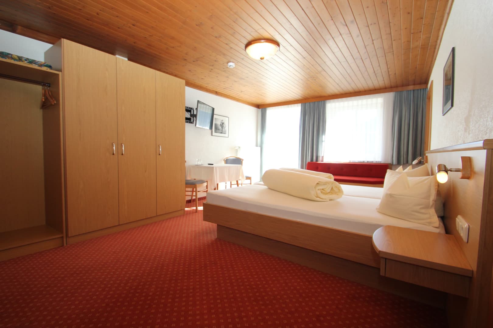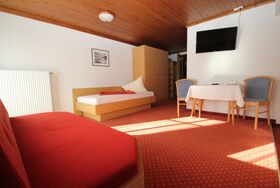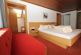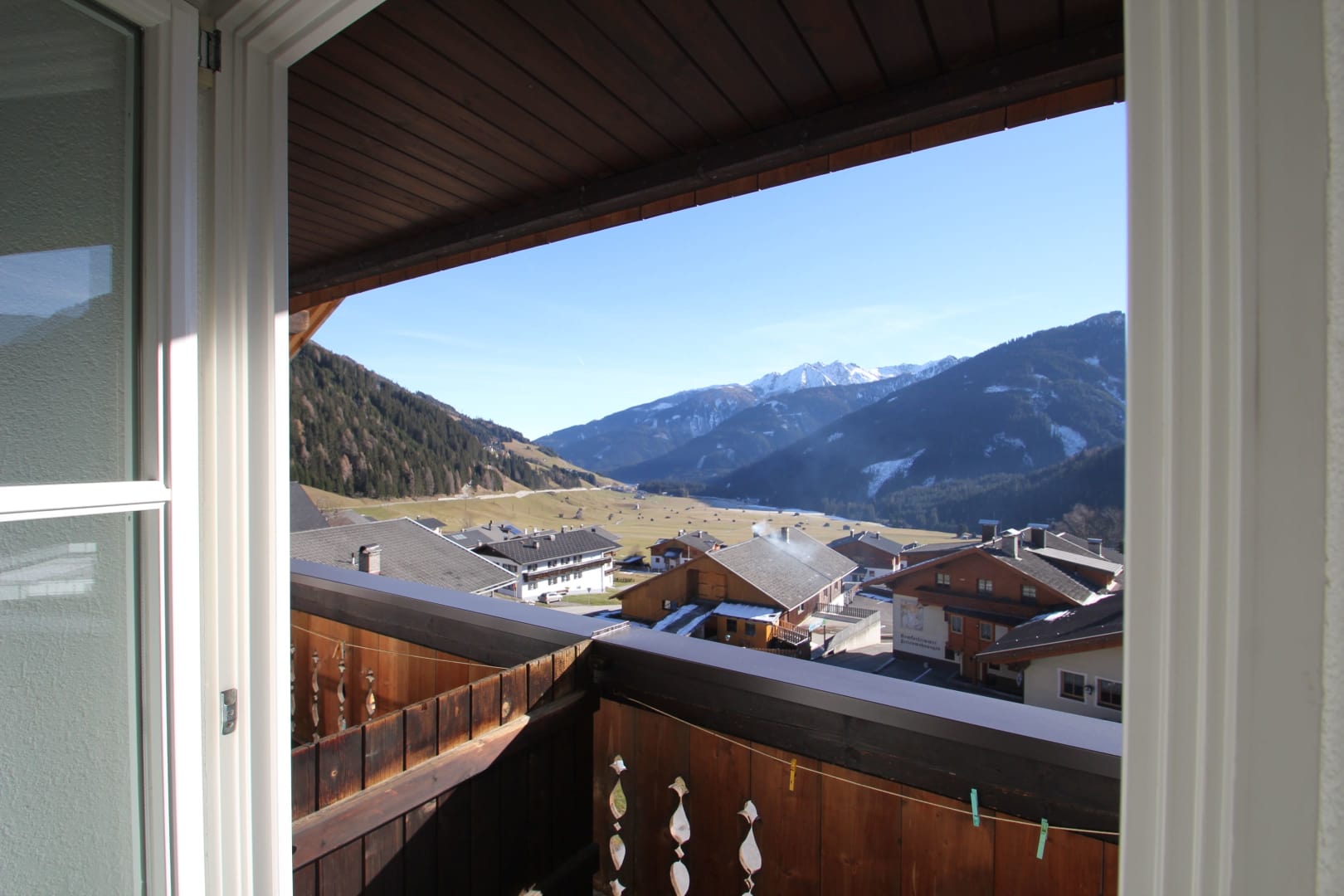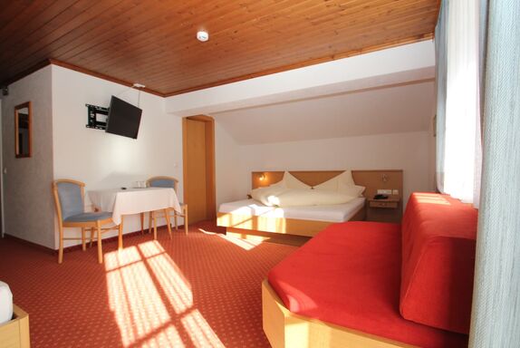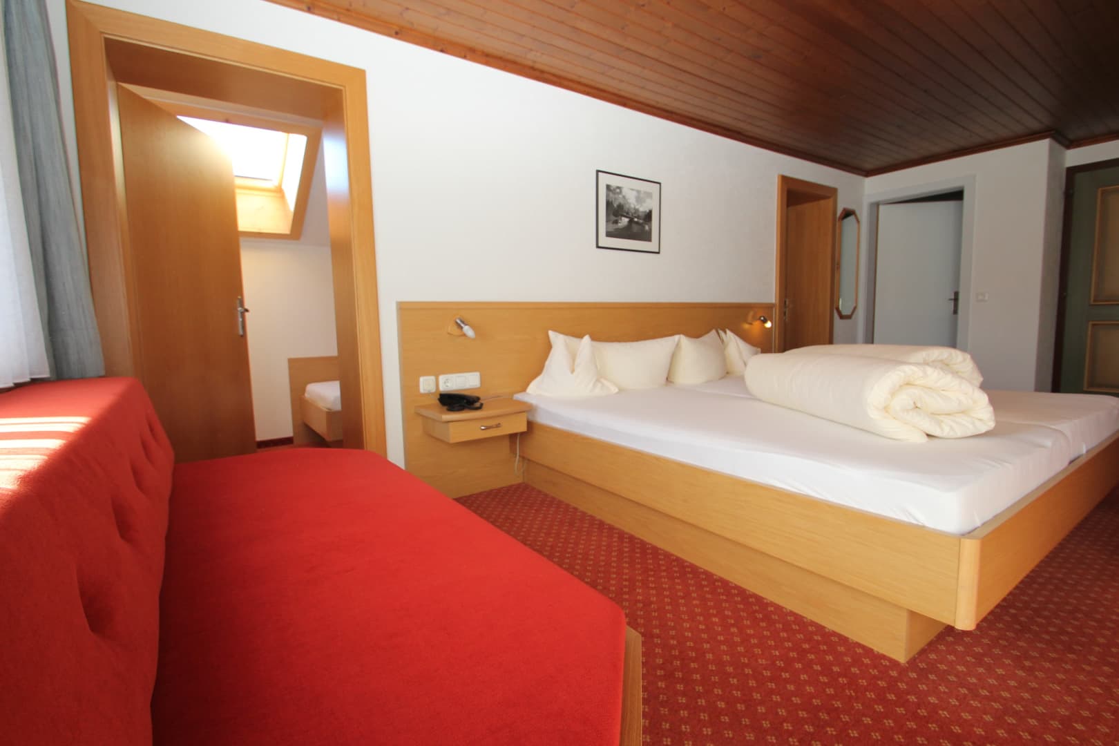 Gemütliches Familienzimmer (2-3 Personen), Doppelbett, Einzelbett und kleine Couch, Gitterbett zusätzlich möglich, mit Balkon und herrlichem Ausblick über das Tal bzw. ins Dorf. Bad/WC getrennt. Genießen Sie die Morgensonne auf Ihrem privaten Balkon.