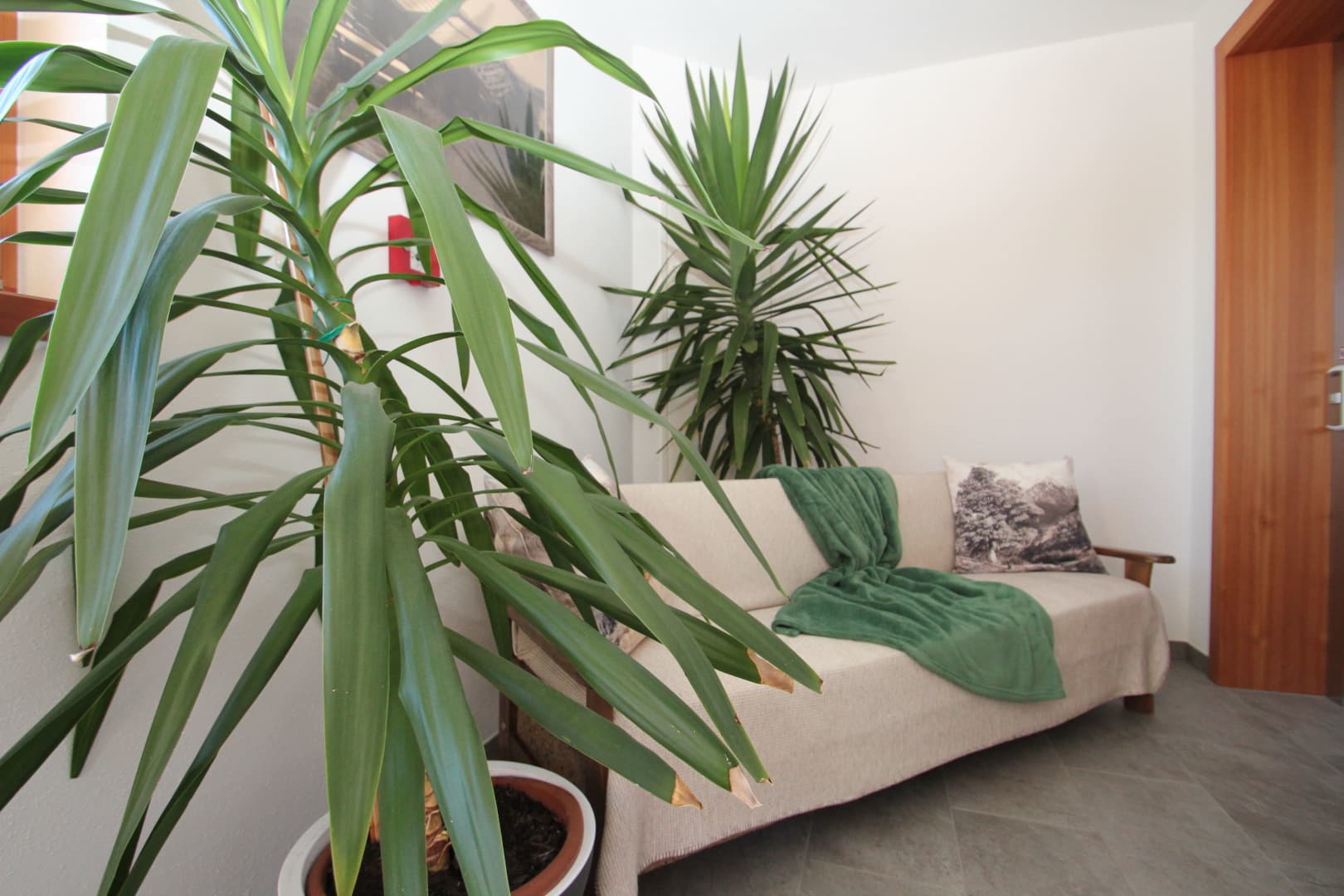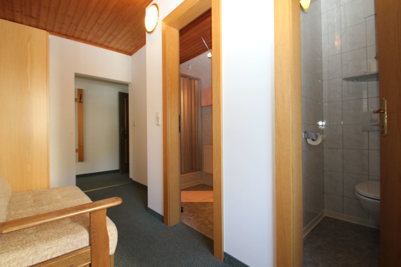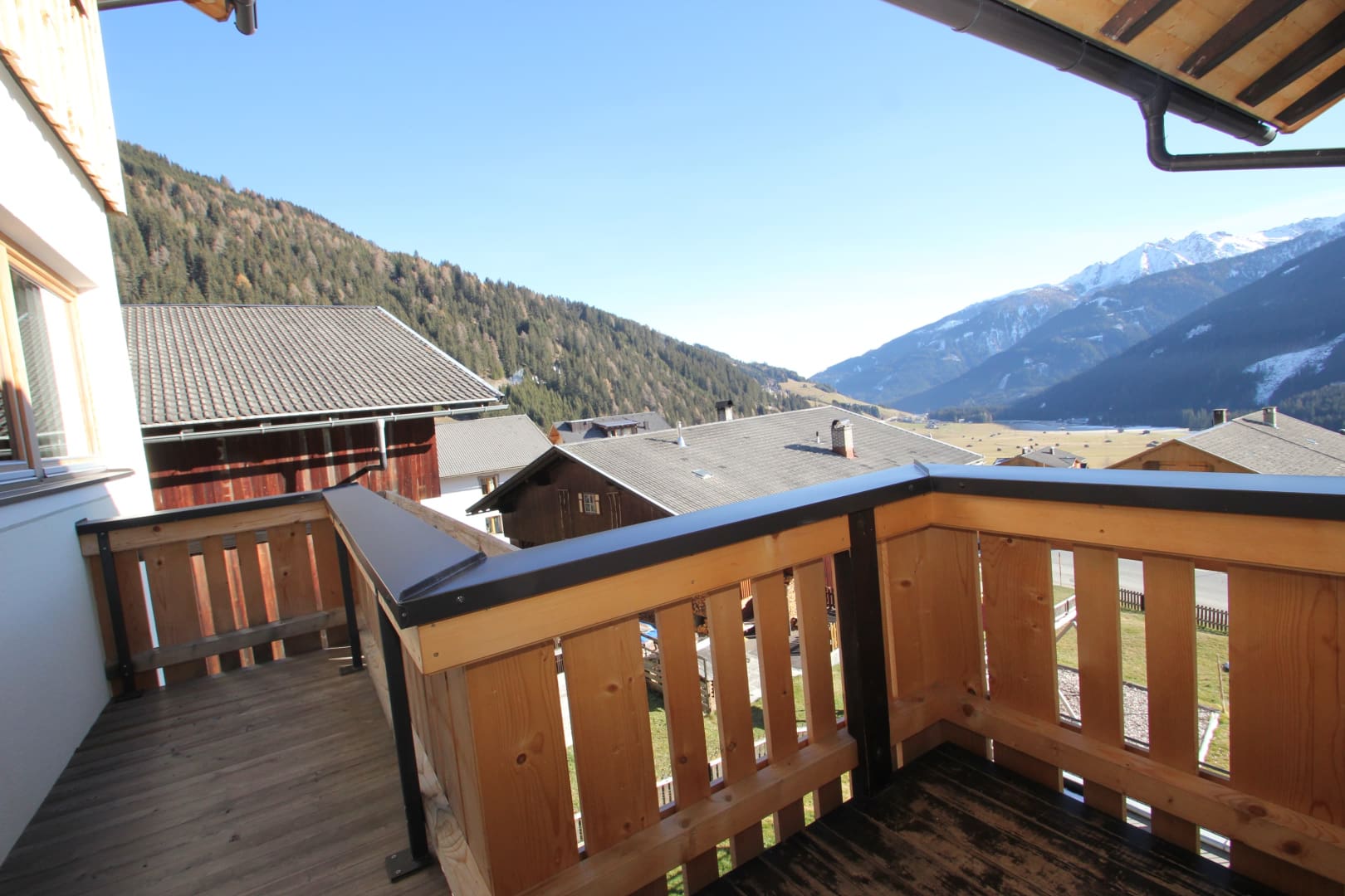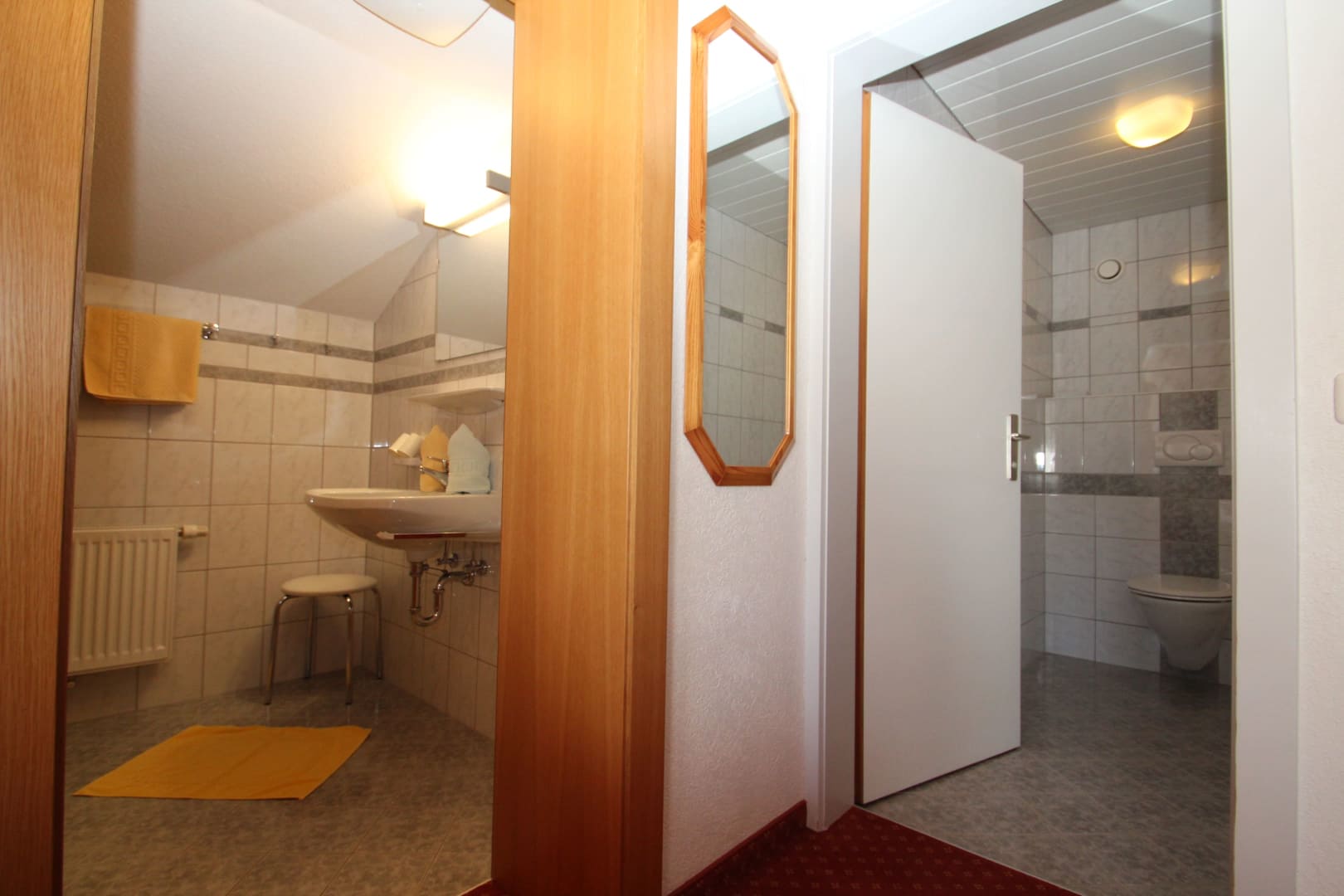 Gemütliches Familienzimmer (2-3 Personen), Doppelbett, Einzelbett und kleine Couch, Gitterbett zusätzlich möglich, mit Balkon und herrlichem Ausblick über das Tal bzw. ins Dorf. Bad/WC getrennt. Genießen Sie die Morgensonne auf Ihrem privaten Balkon.