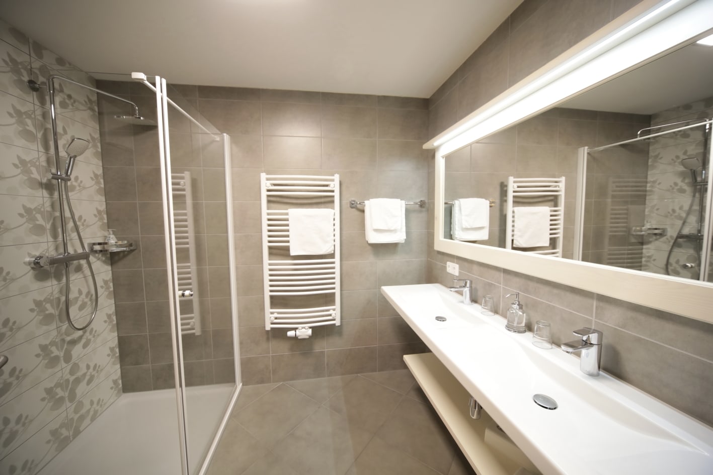 Das Badezimmer ist ausgestattet mit Dusche oder Badewanne, WC und Doppelwaschtisch, Haarfön, Handtuchtrockner, Kosmetiktüchern, Body- und Haarshampoo ausgestattet.