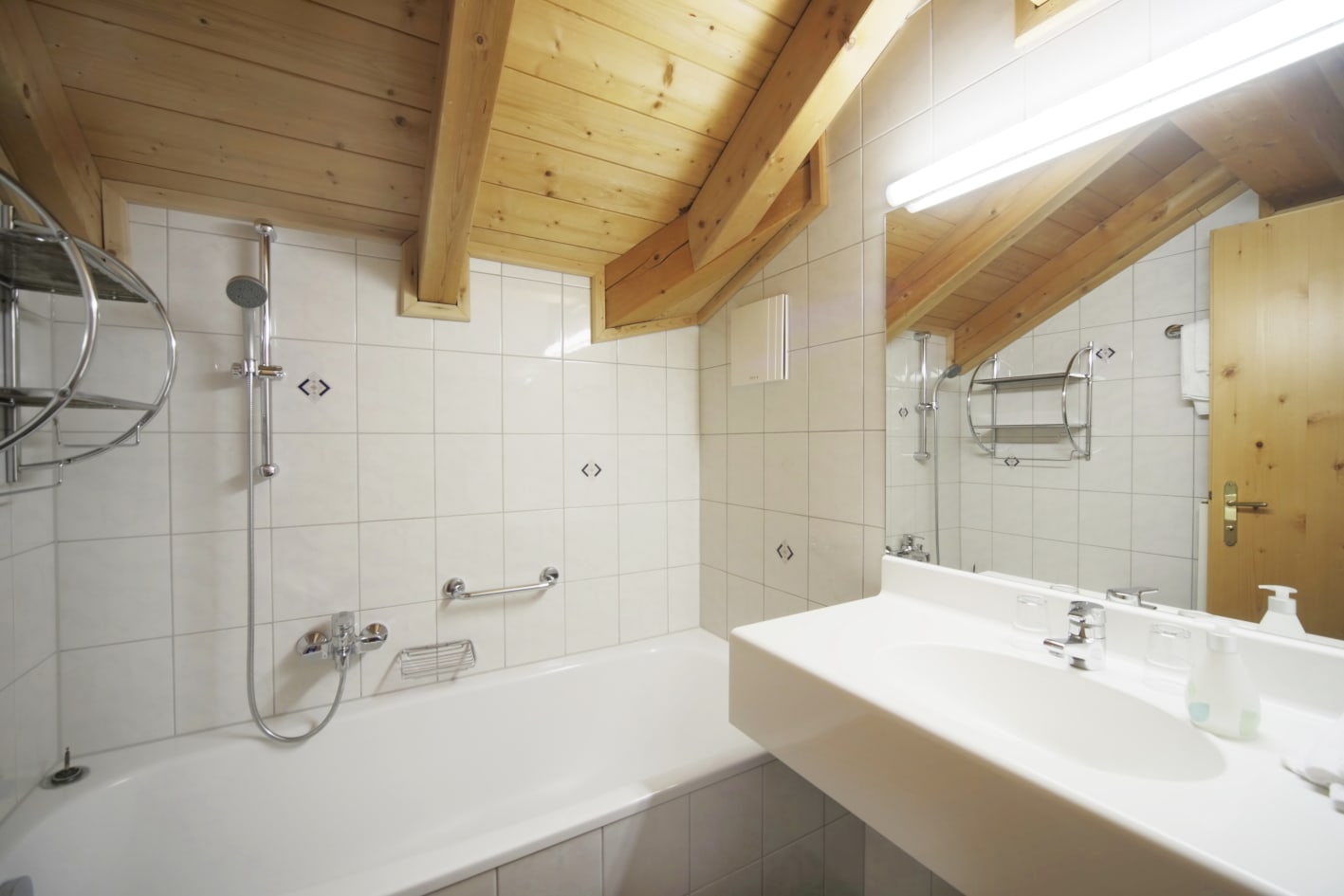 Das Badezimmer ist ausgestattet mit einer Dusche und einem Waschtisch, sowie Haarfön, Handtuchtrockner, Kosmetiktüchern, Body- und Haarshampoo und einem WC.