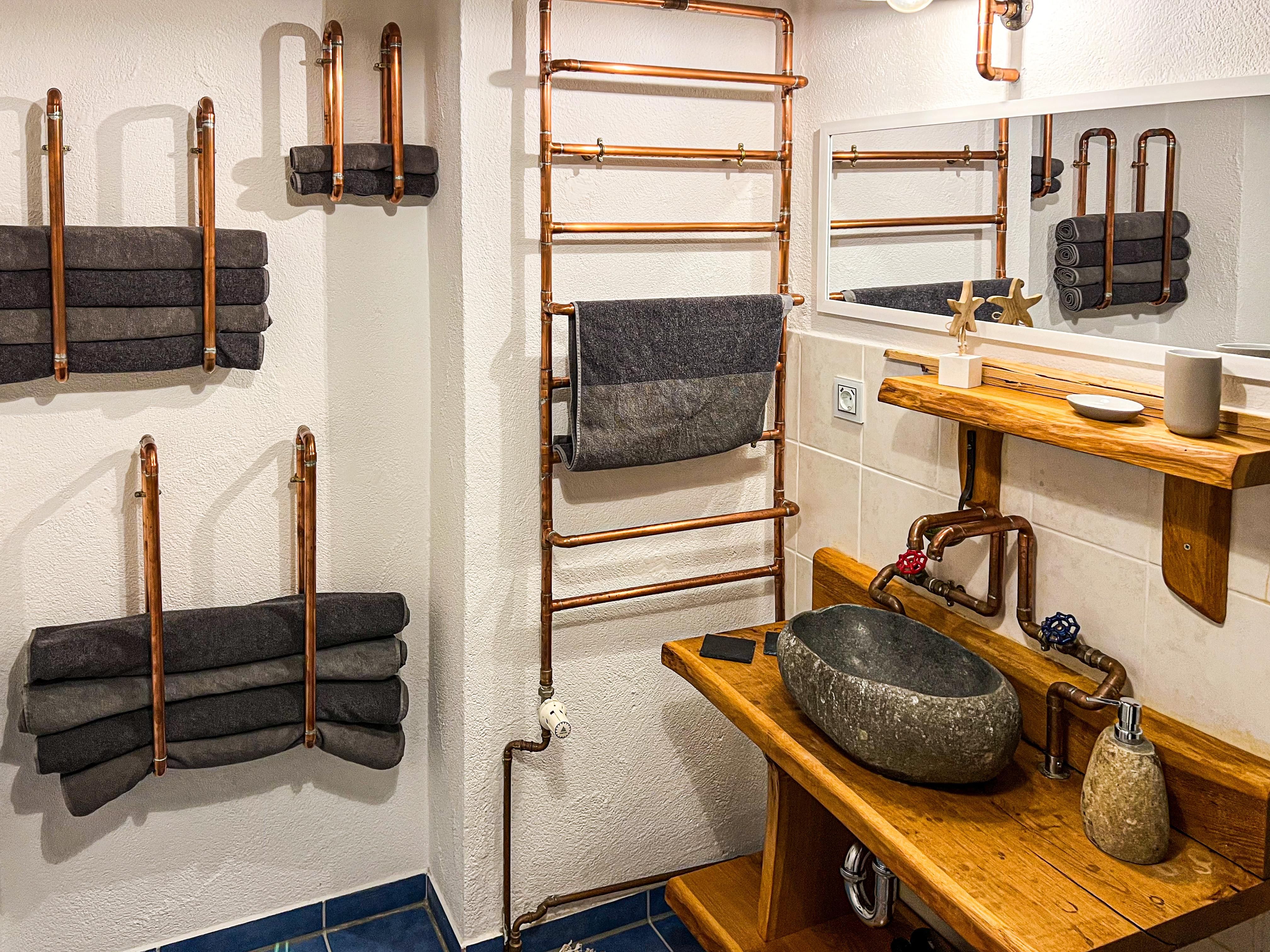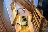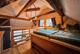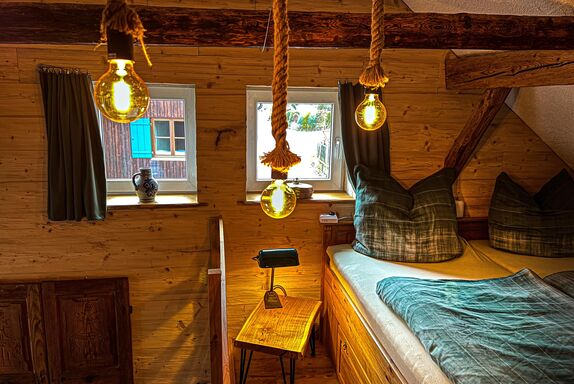 Im offenen historischen Dachstuhl aus handbehauenen Balken befindet sich auf der Galerie ein geräumiges Doppelbett mit zwei Schlafplätzen direkt unter der Dachschräge.