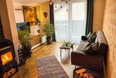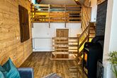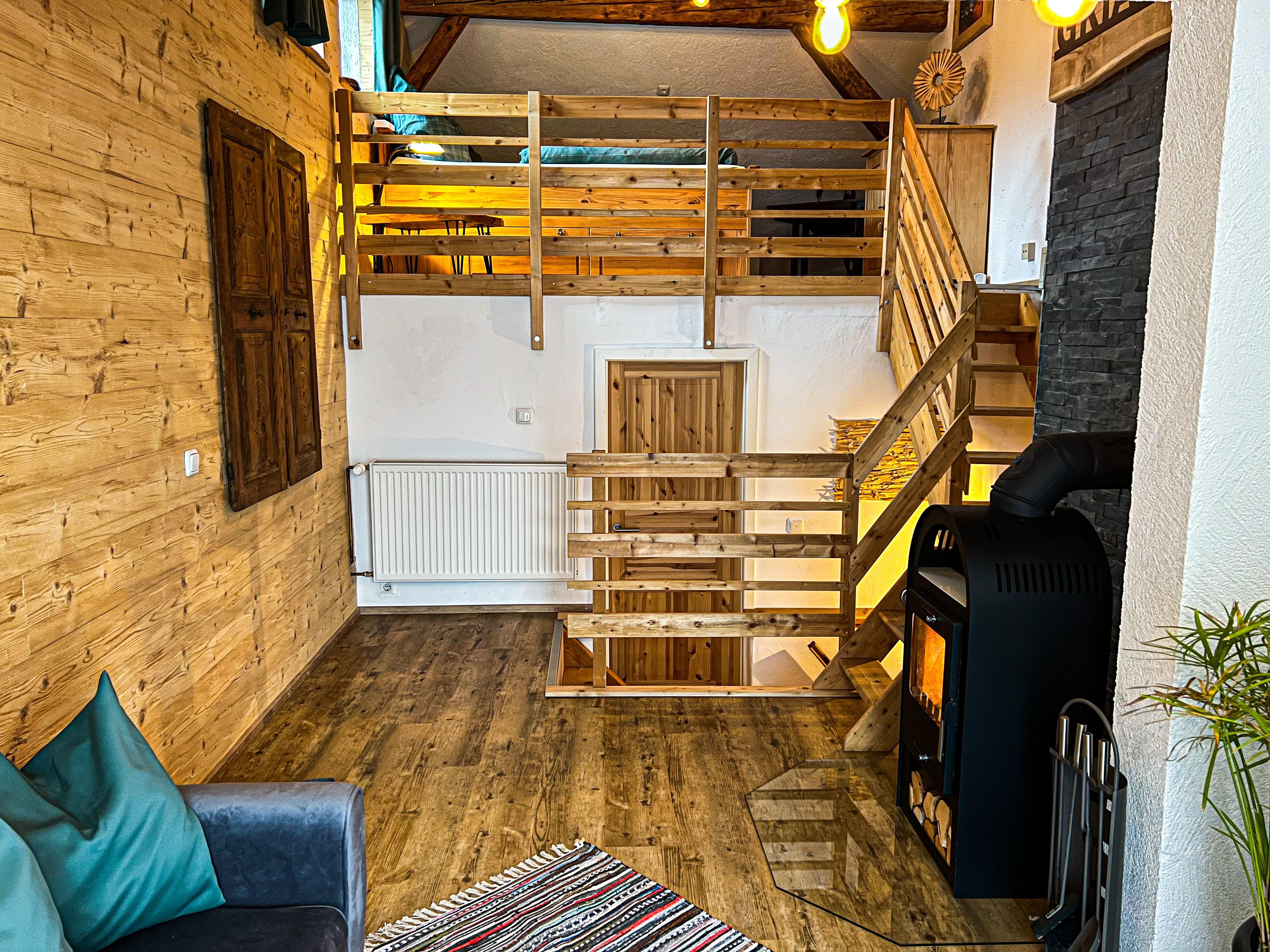 Übergehend aus dem Luftraum in den weiteren Wohnbereich mit Zugang zur Dachterasse befindet sich einladend, neben dem zweiten Kaminofen und zusätzlichem Flachbildfernseher eine ausziehbare Schlafcouch mit weiterer Kapazität für einen muckligen Schlafplatz.